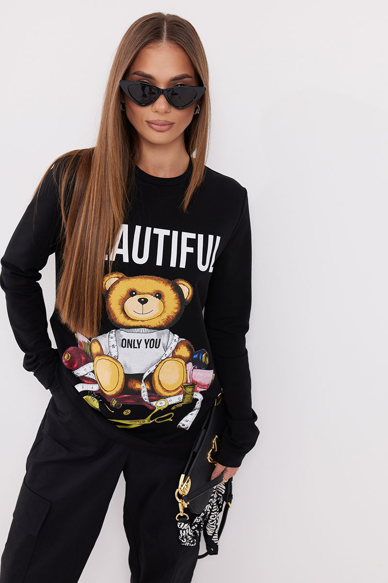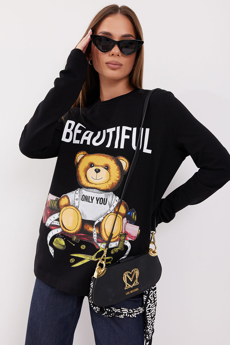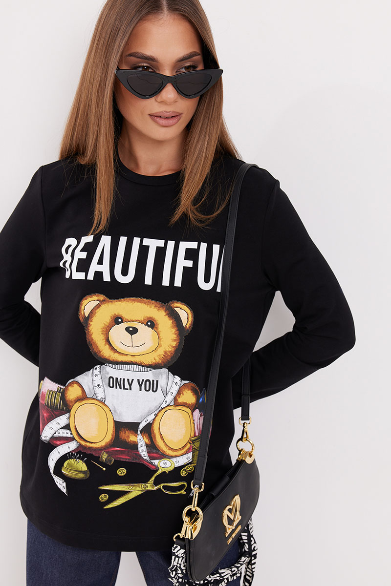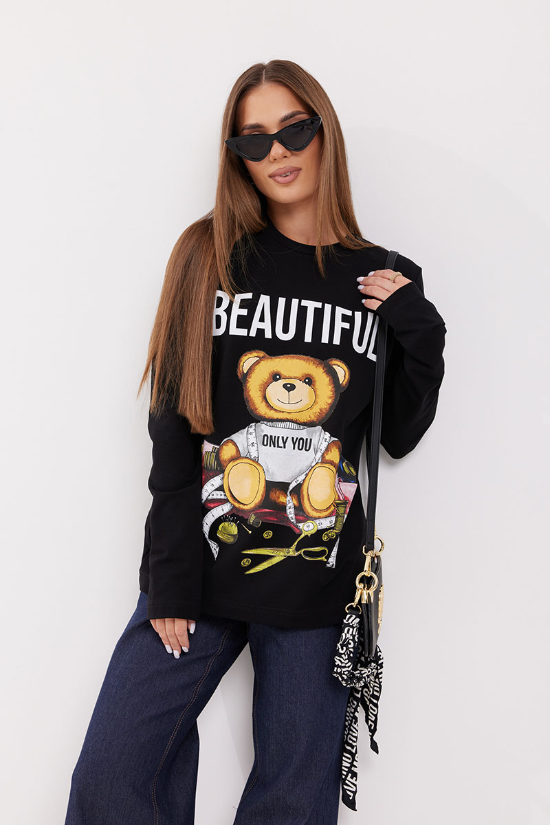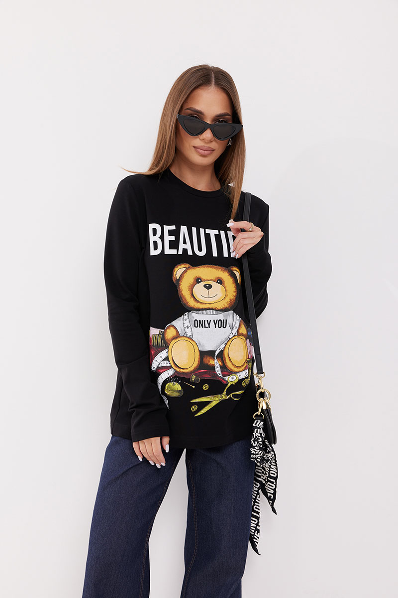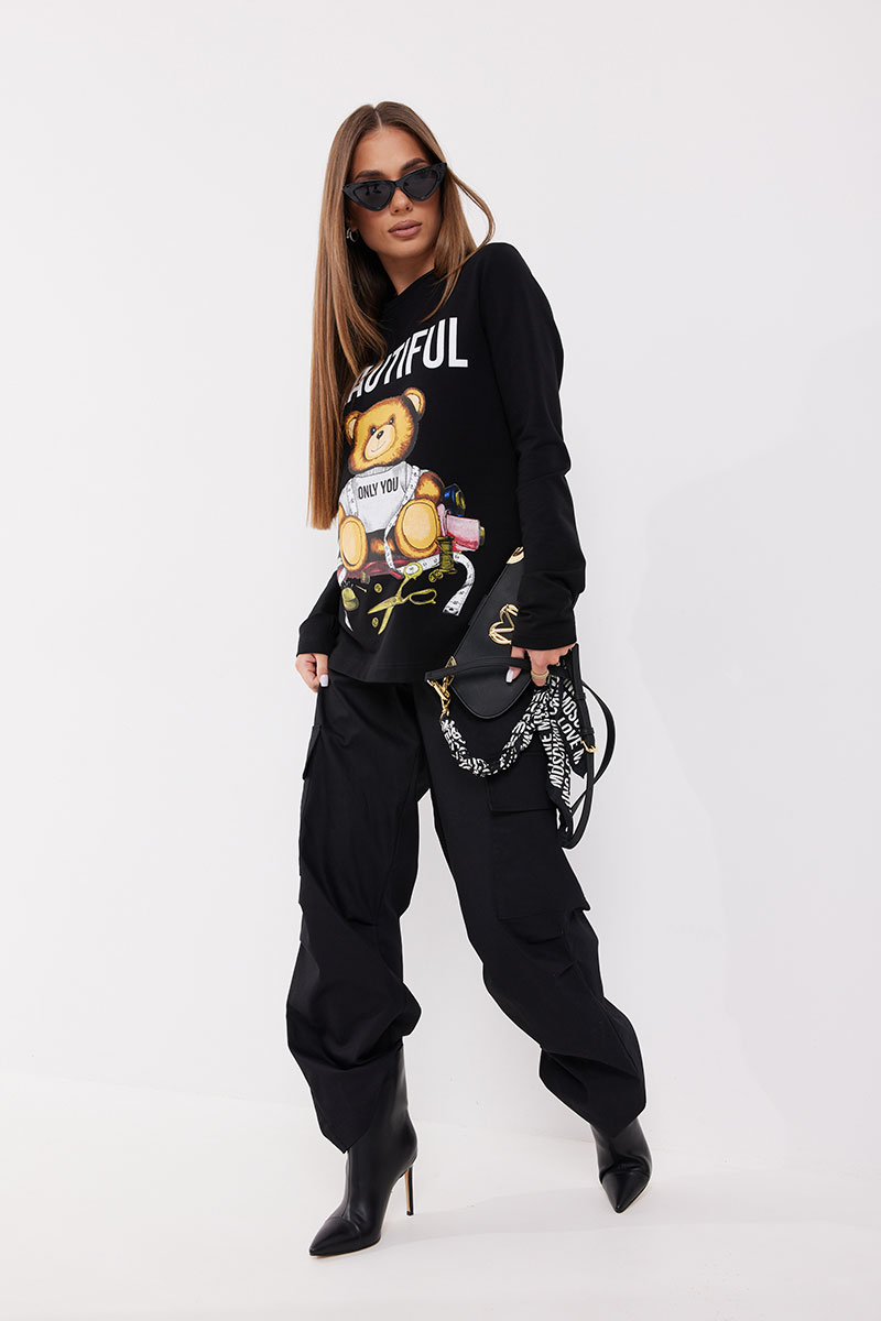 Джемпер прямого силуэта из трикотажного полотна. Горловина круглой формы. Рукав прямой удлинённый с отверстием для большого пальца. На переде выполнена печать.