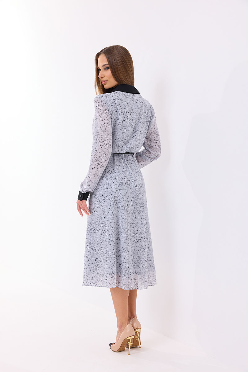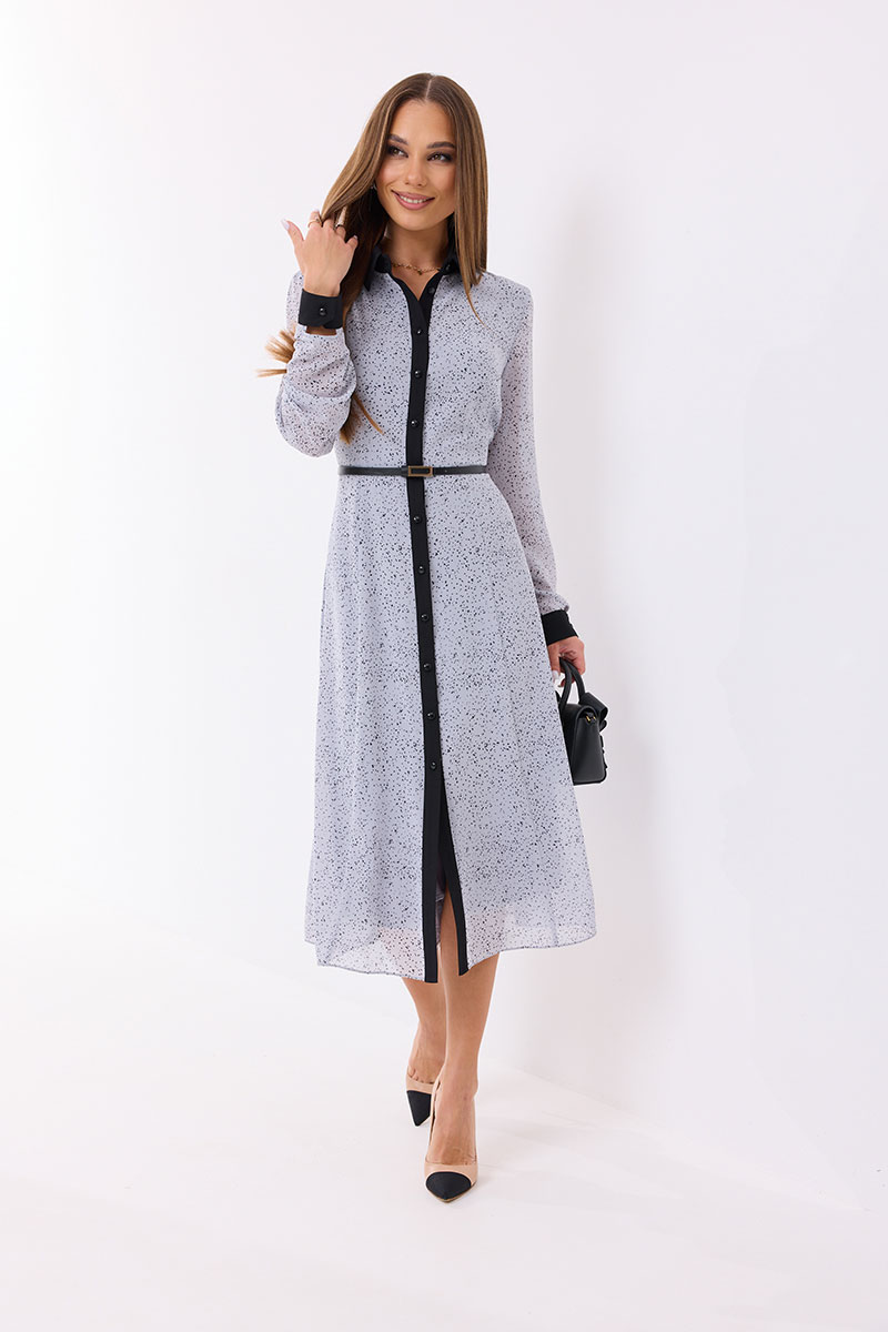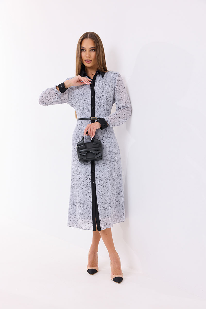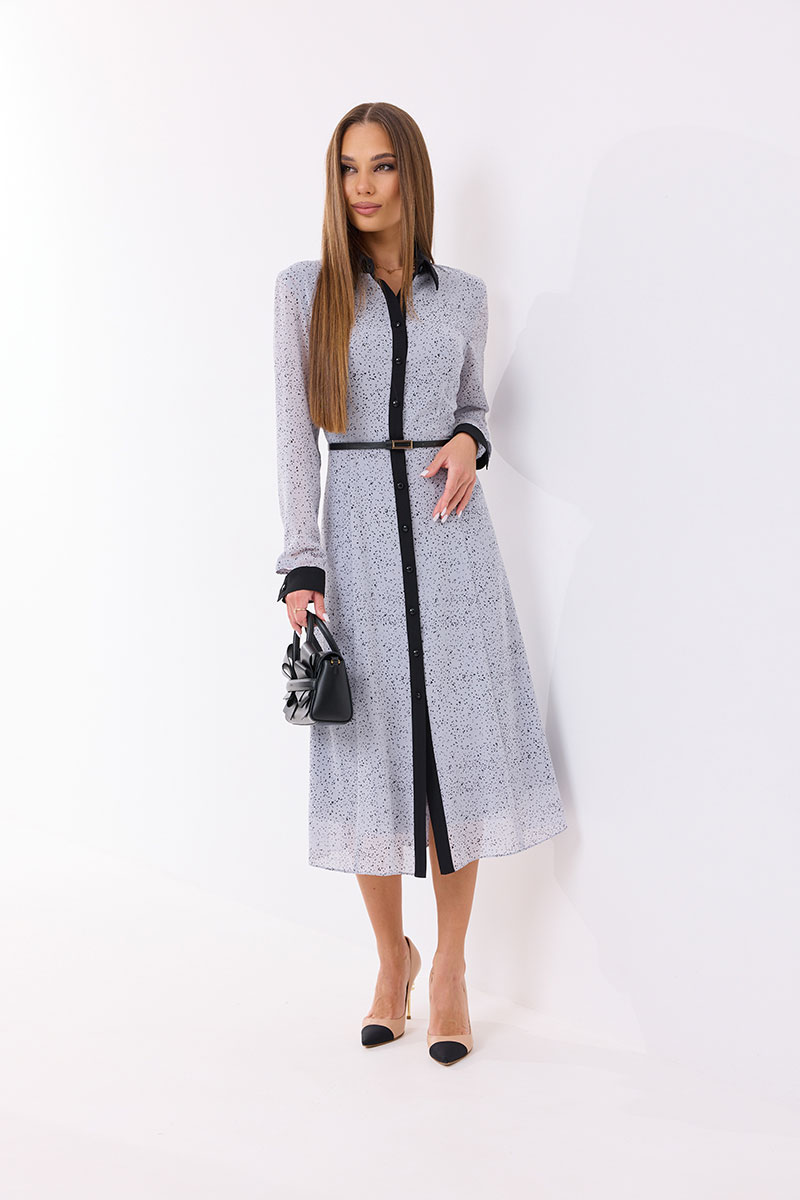 Платье полуприлегающего силуэта. Длина миди. Застёжка по планке на петли и пуговицы. Воротник рубашечный. Платье отрезное по линии талии. Рукав прямой на манжете. Манжета с застёжкой на петлю и пуговицу. Юбка расширена к низу. Платье на подкладке. В комплекте съёмный пояс.