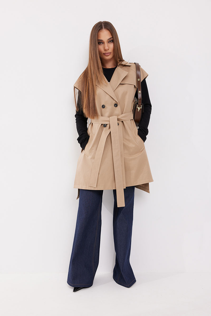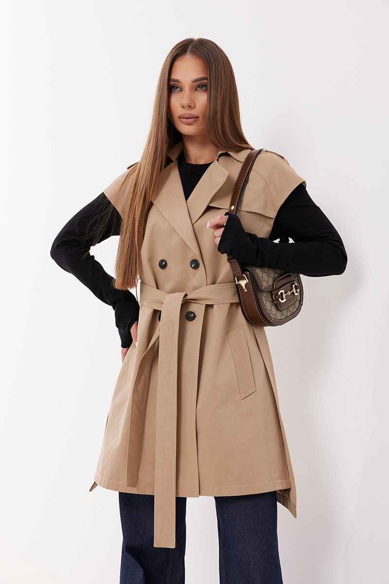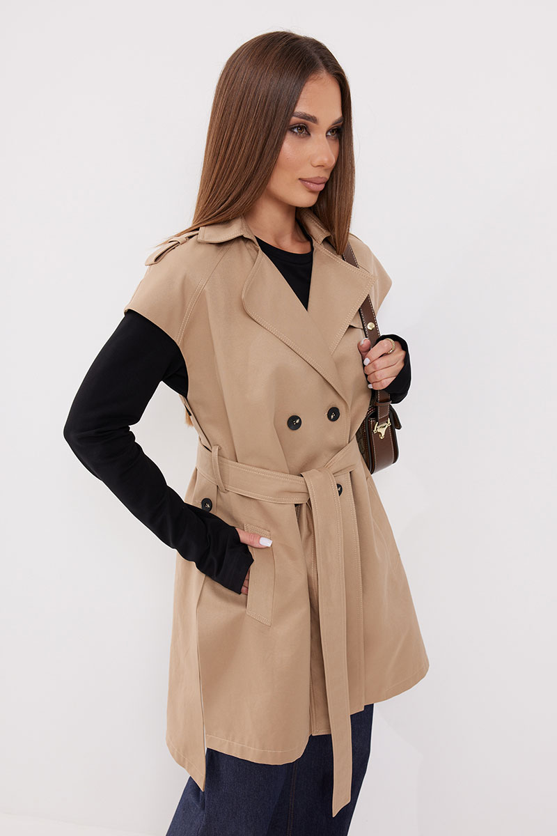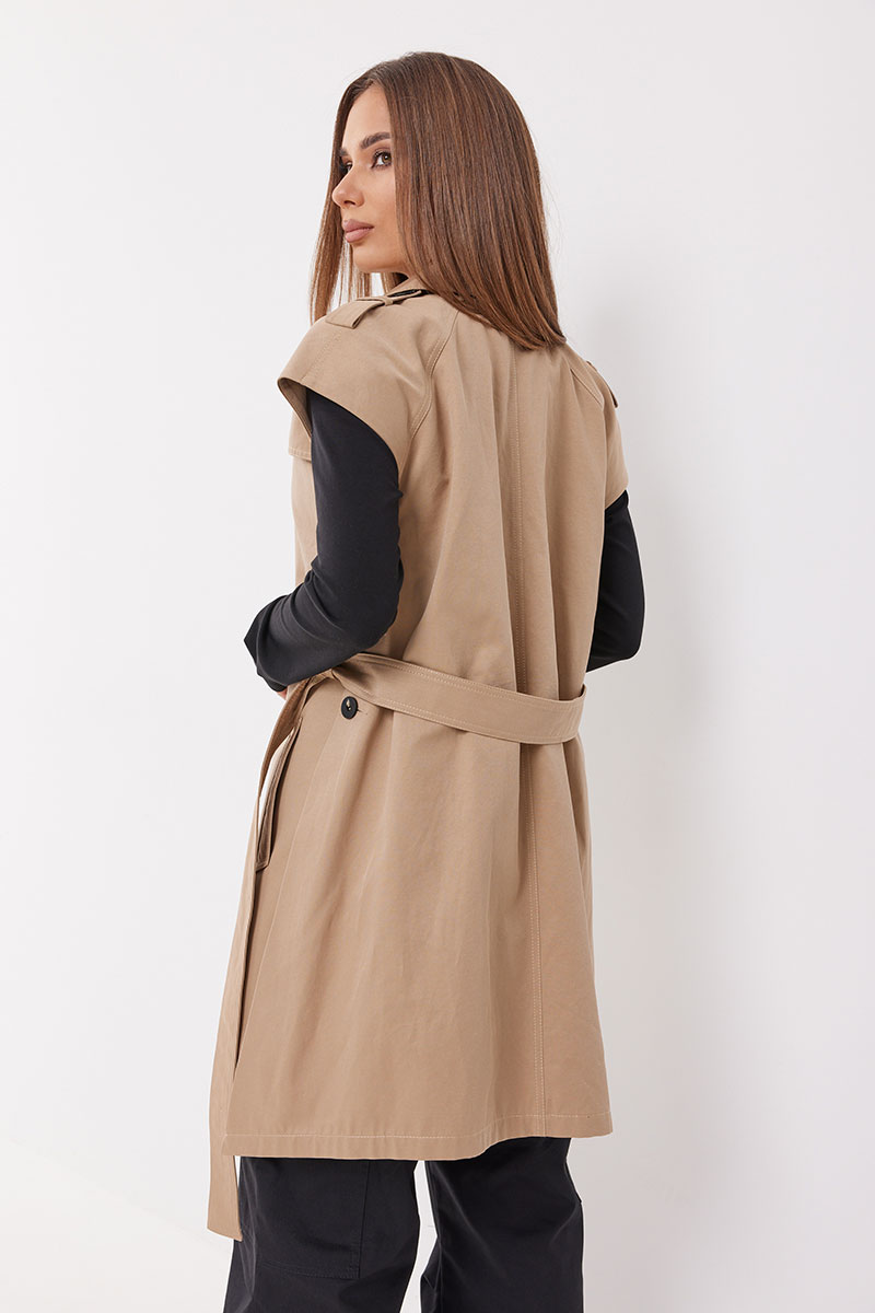 Жилет двубортный. Застёжка на петли и пуговицы. Воротник рубашечный. Отложные борта. На