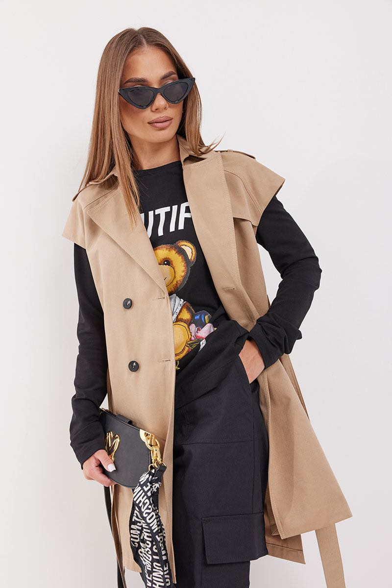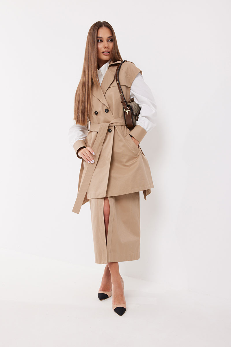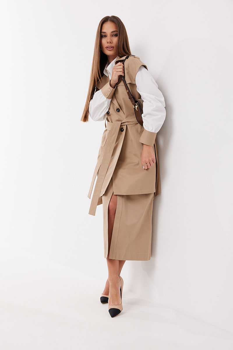 переде прорезные карманы. Боковые швы отлетные на петли и пуговицы. Жилет с погонами, с петлёй и пуговицей. Низ жилета фигурной формы. Жилет на подкладке. В комплекте