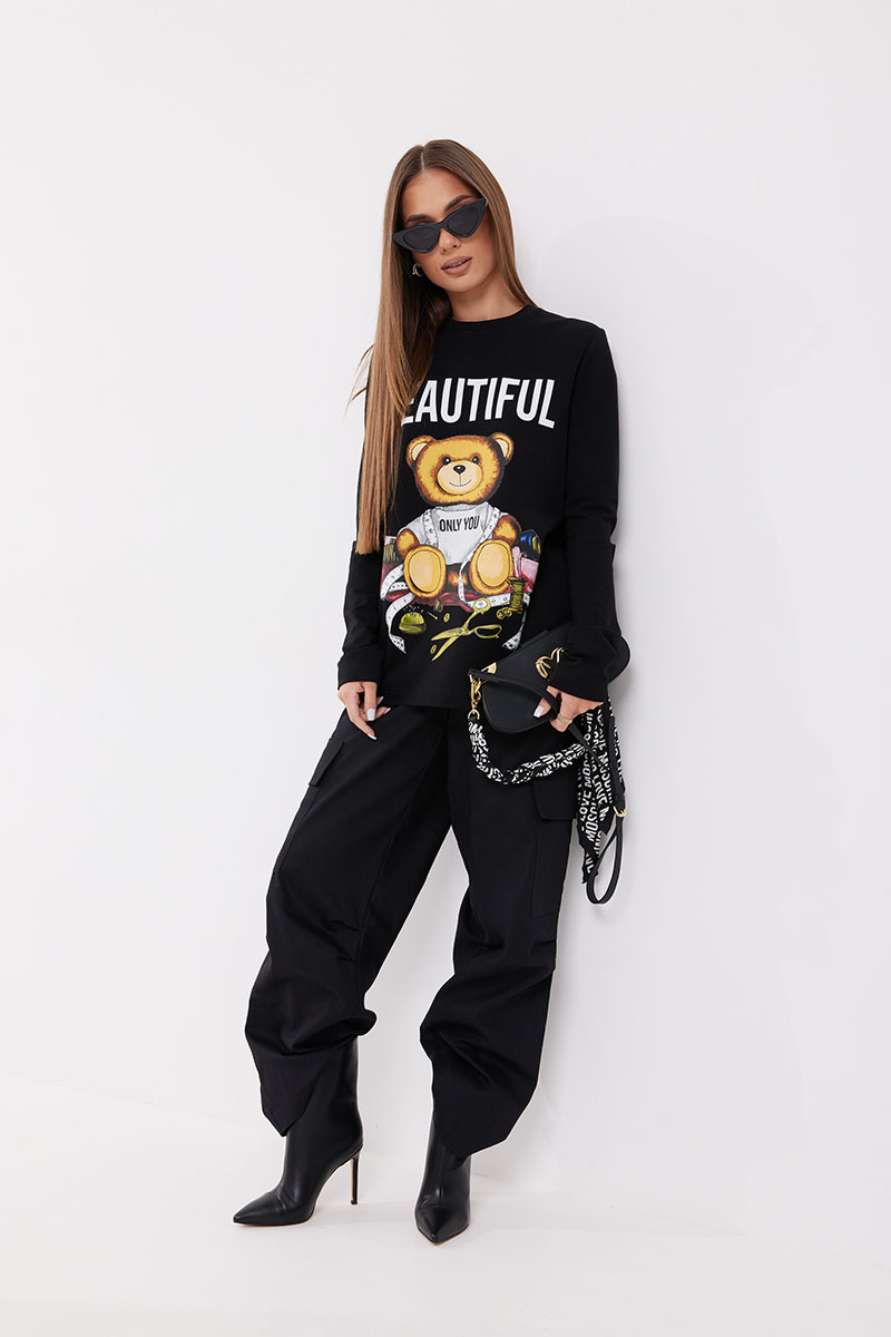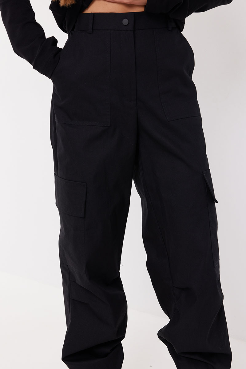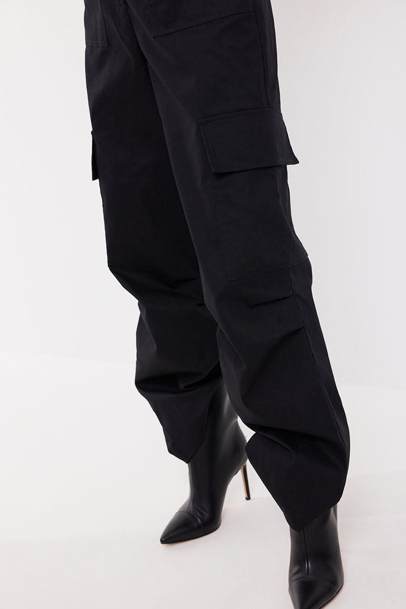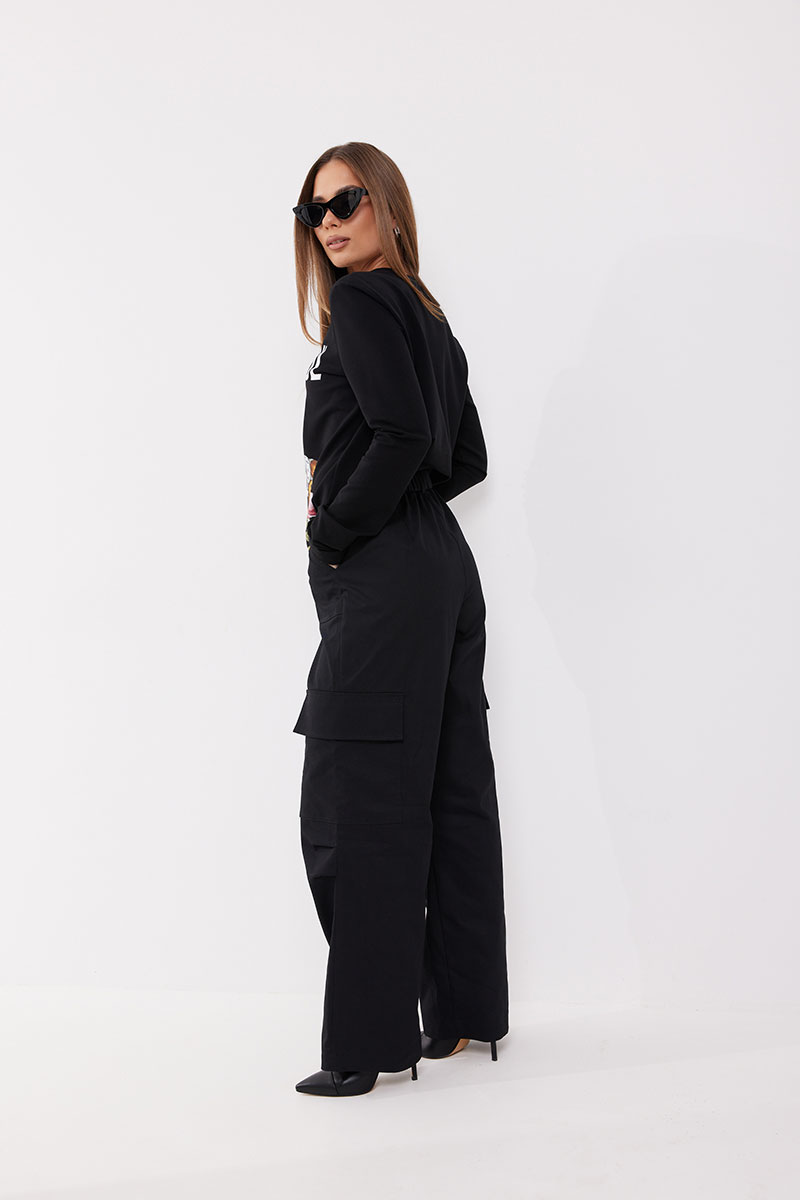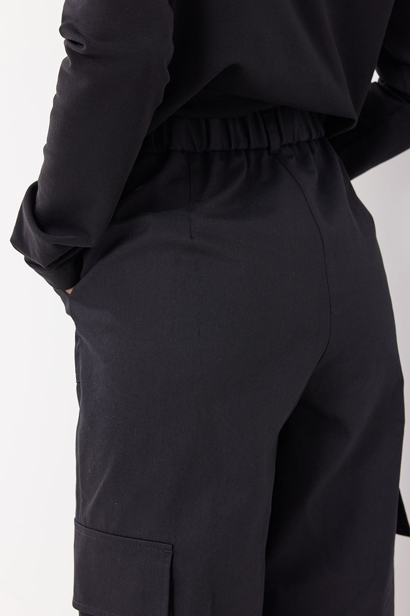 Брюки-карго прямые, свободной формы. Верх на притачном поясе со шлёвками. Застёжка на поясе на кнопку. В пояс по спинке вставлена резинка. Застёжка на молнию. По
