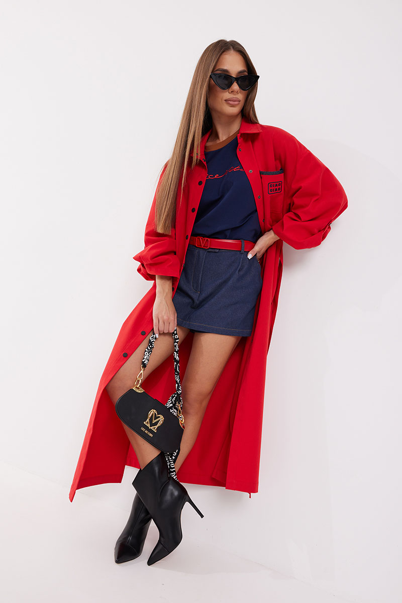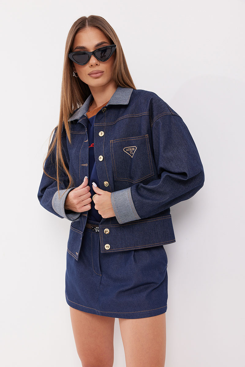 Шорты укороченные из джинсовой ткани. Верх на поясе со шлёвками. Застёжка спереди на металлическую молнию, петлю и пуговицу на поясе. Боковые наклонные карманы. По переду имитация юбки. Задние части декорированы листочками и фирменным знаком.