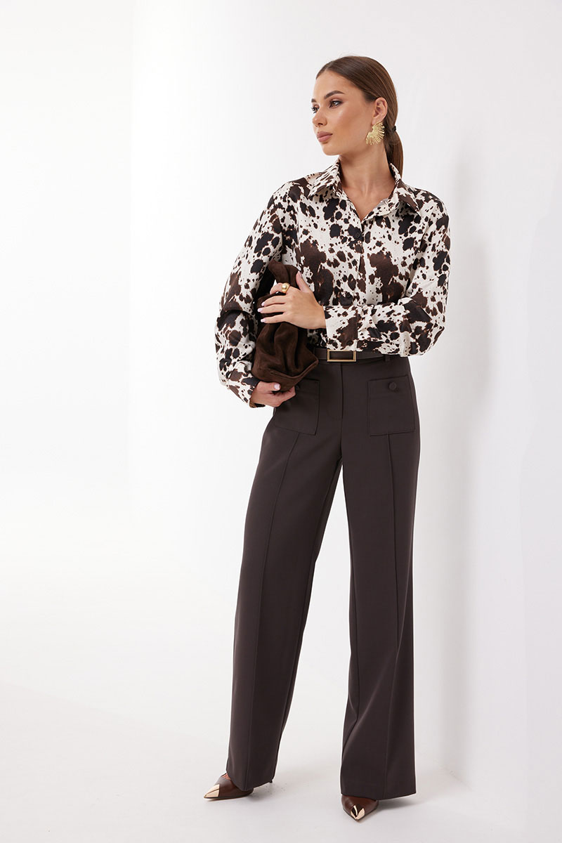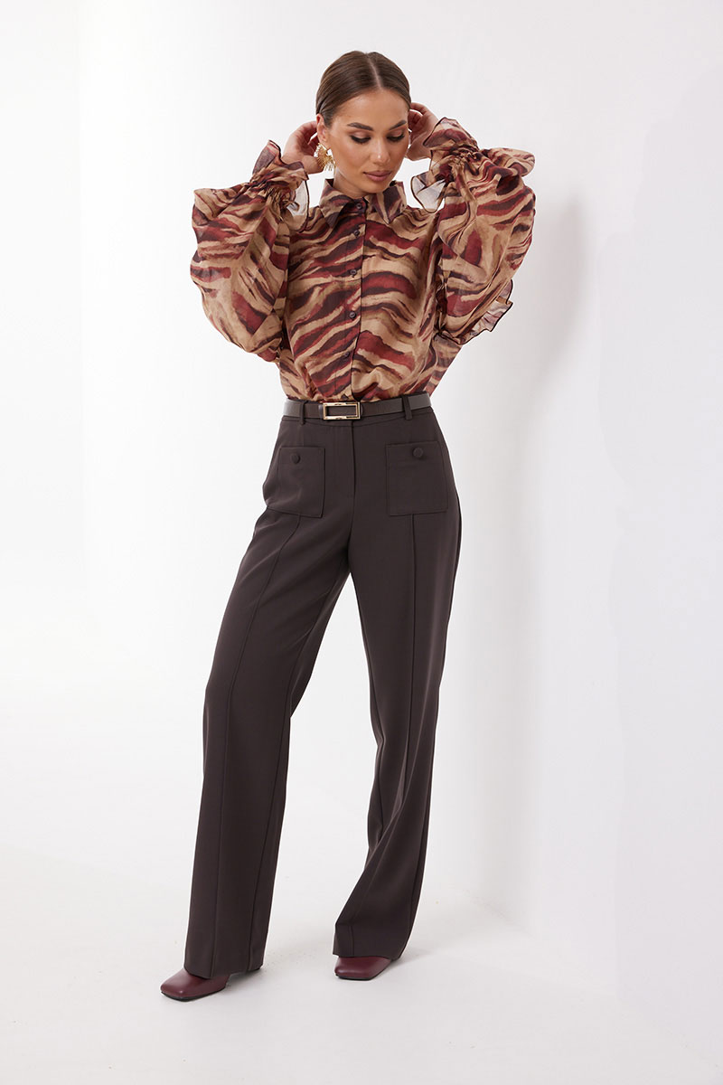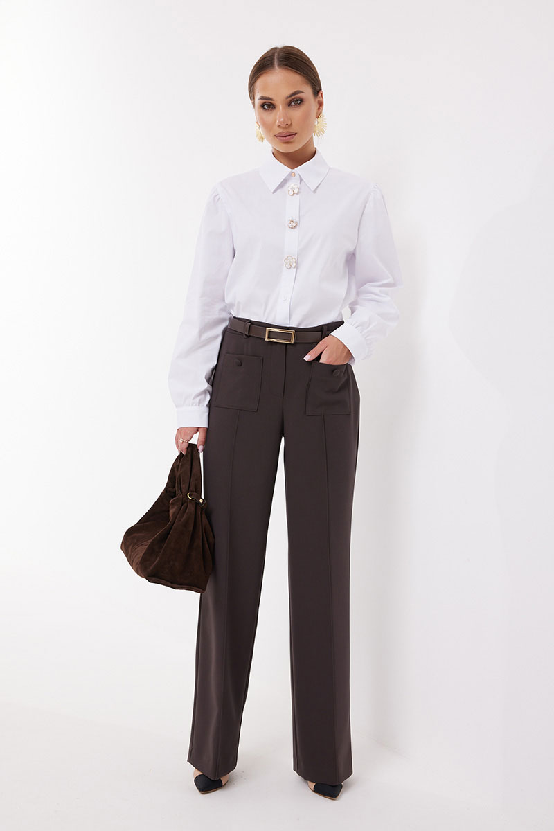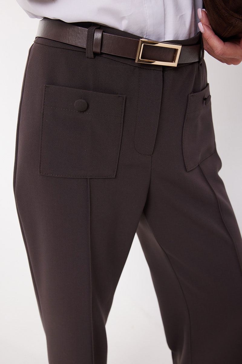 Брюки прямые с прошитой стрелкой по передней и задней половинке. Верх на поясе со шлевками. Ширинка на молнии и удлиненный пояс со скрытой застежкой на пуговицу и крючок. В верхней части переда накладные карманы.