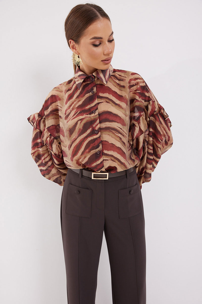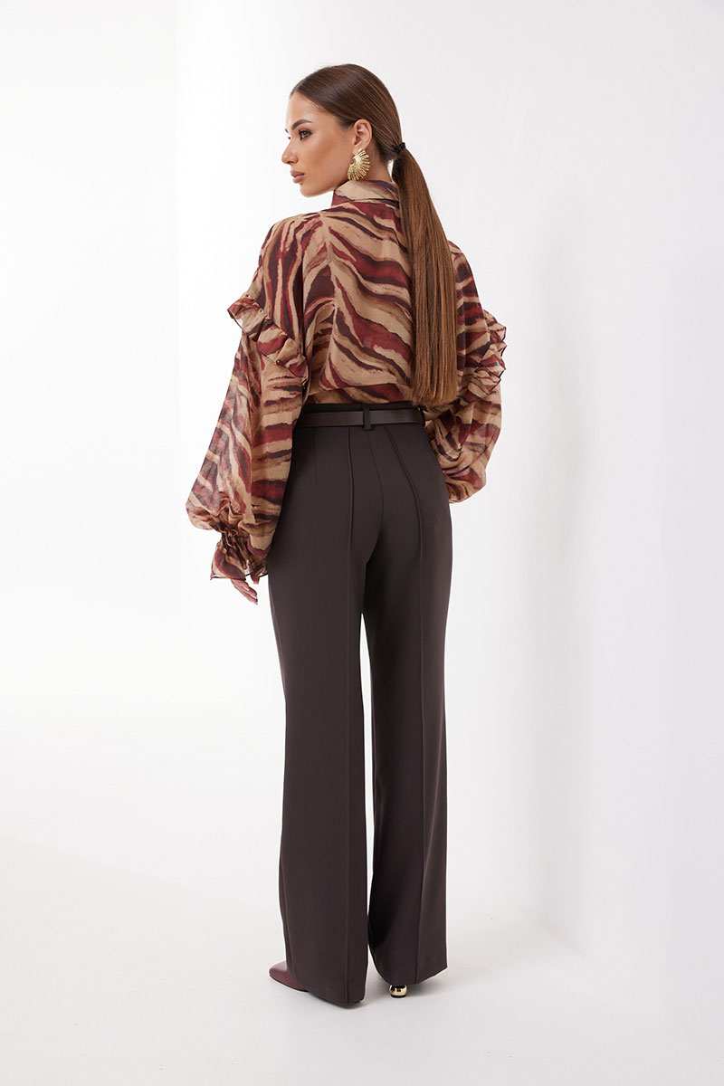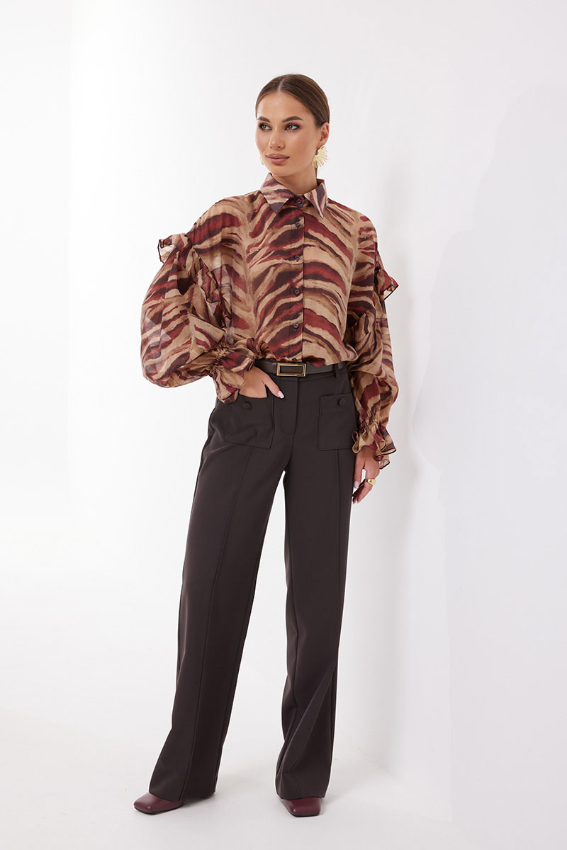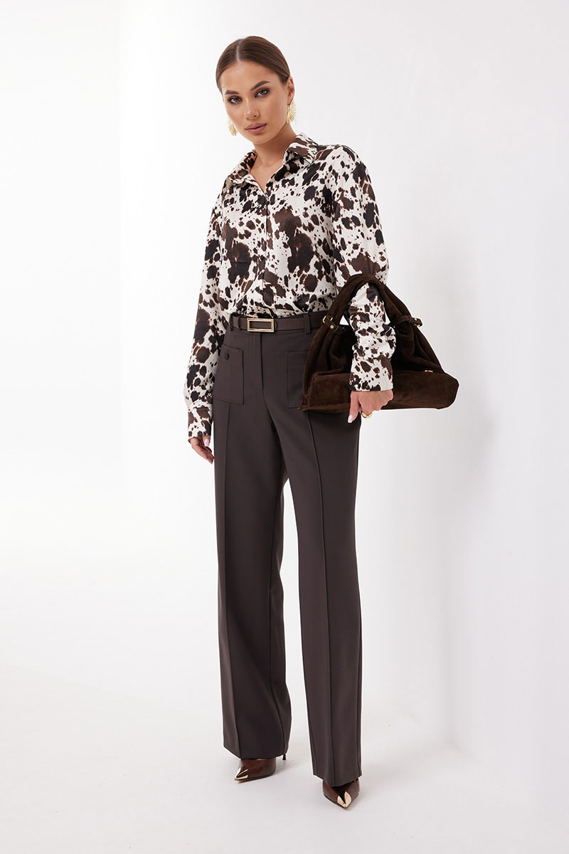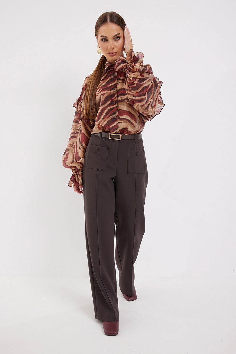 Брюки прямые с прошитой стрелкой по передней и задней половинке. Верх на поясе со шлевками. Ширинка на молнии и удлиненный пояс со скрытой застежкой на пуговицу и крючок. В верхней части переда накладные карманы.