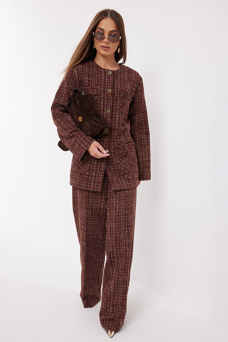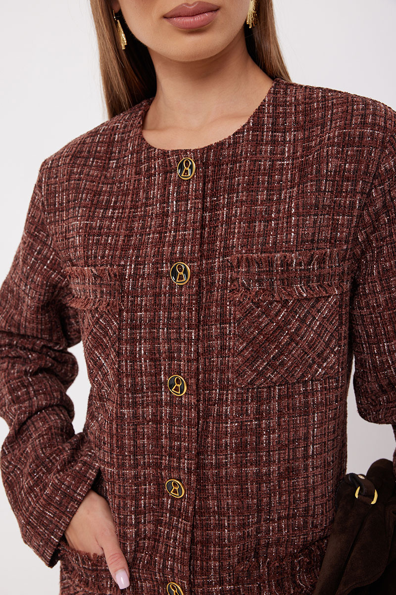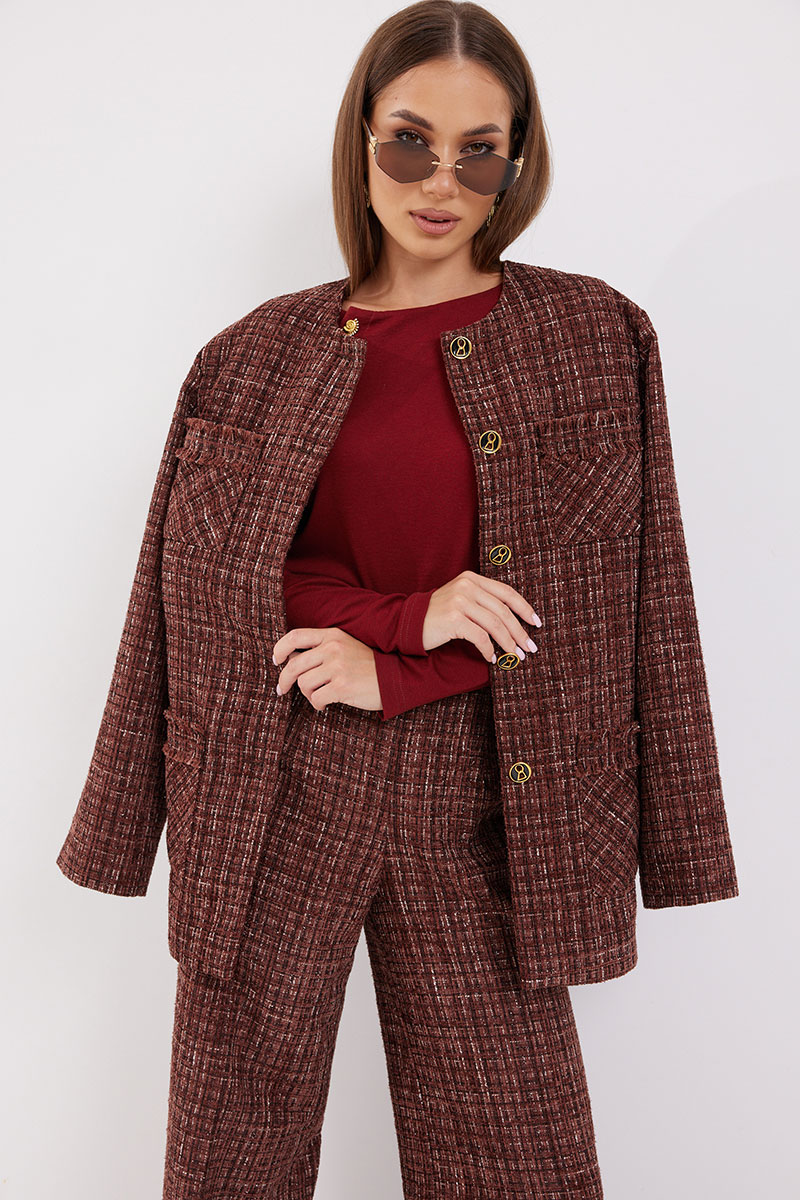 Жакет в стиле Шанель - это изысканная и стильная верхняя одежда. Изготовлен из качественного материала, однобортный, прямого силуэта, на подкладке. Рукава втачные, одношовные. Горловина круглая, застежка на петли и пуговицы. По переду накладные карманы.