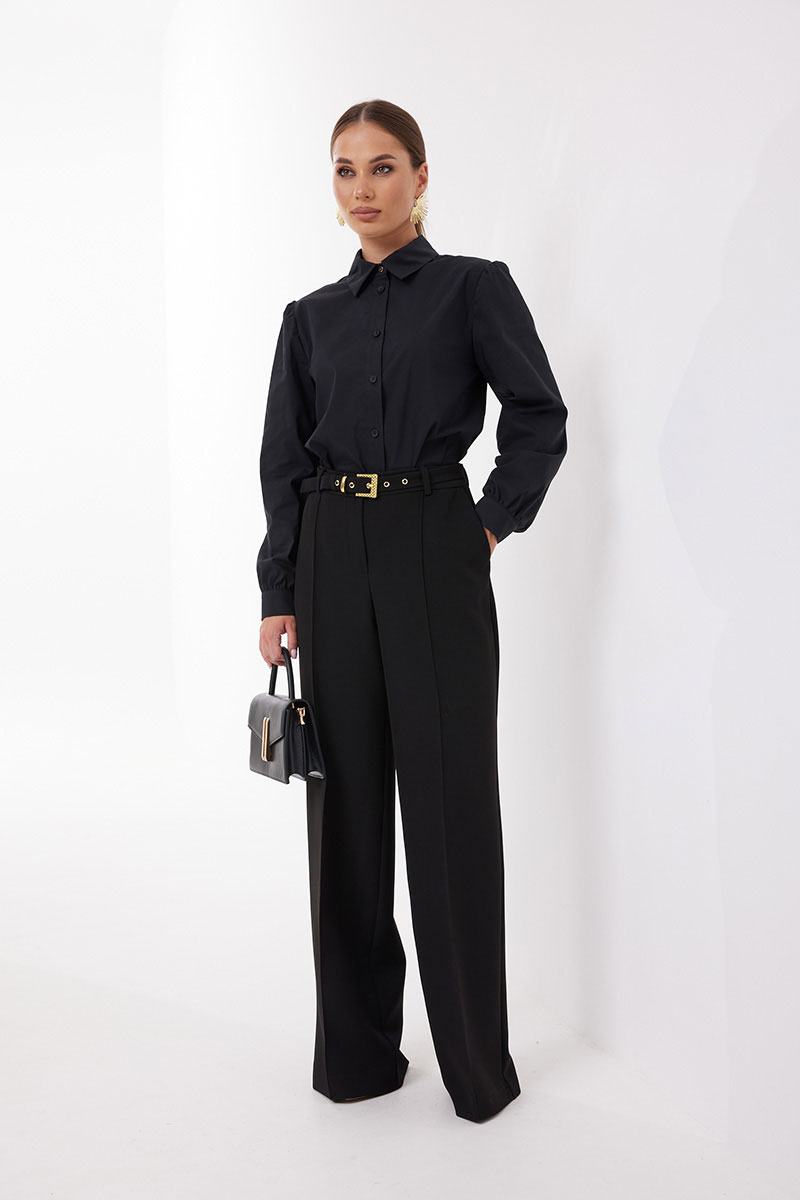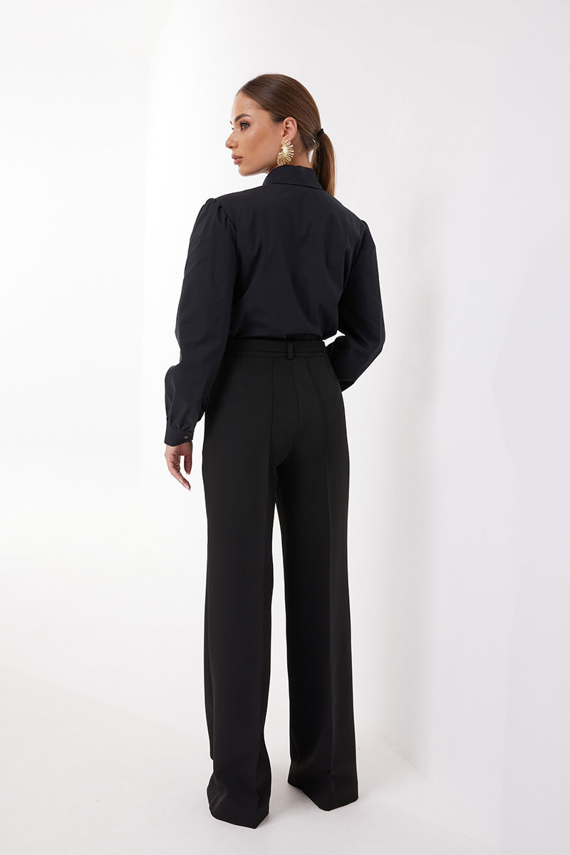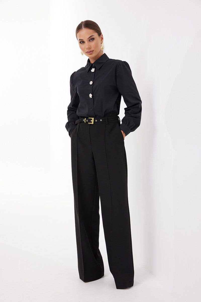 Брюки прямые с прошитой стрелкой из костюмной ткани. Верх на поясе со шлевками. Ширинка на молнии и удлиненный пояс со скрытой застежкой на пуговицу и крючок. Диагональные боковые карманы. Съемный пояс с металлической пряжкой и блочками.