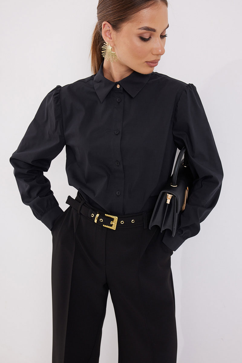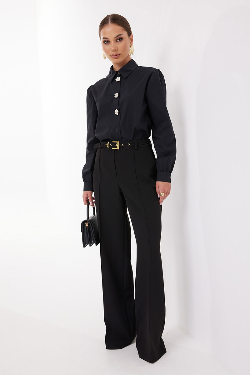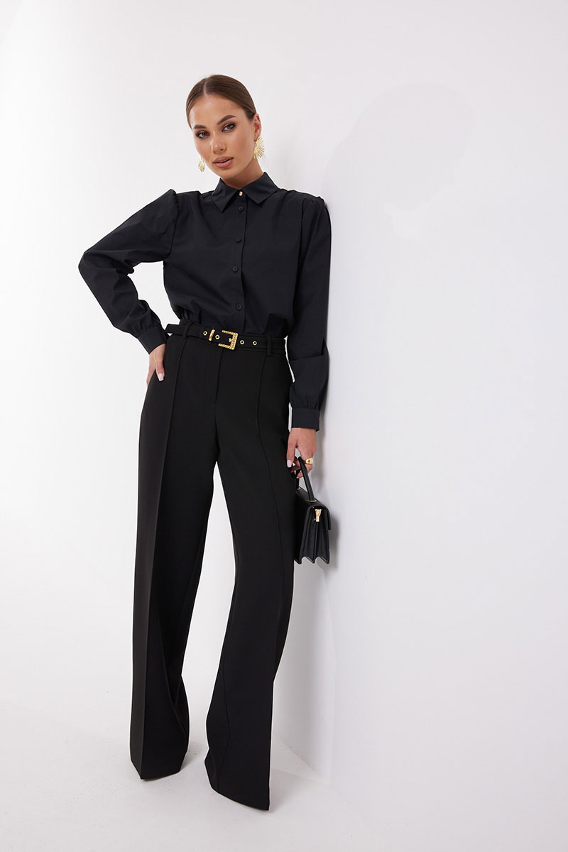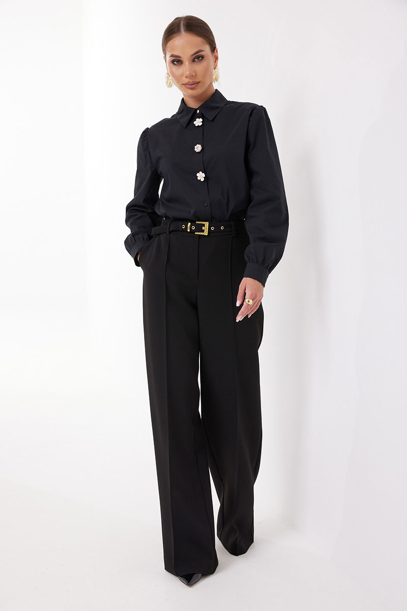 Брюки прямые с прошитой стрелкой из костюмной ткани. Верх на поясе со шлевками. Ширинка на молнии и удлиненный пояс со скрытой застежкой на пуговицу и крючок. Диагональные боковые карманы. Съемный пояс с металлической пряжкой и блочками.