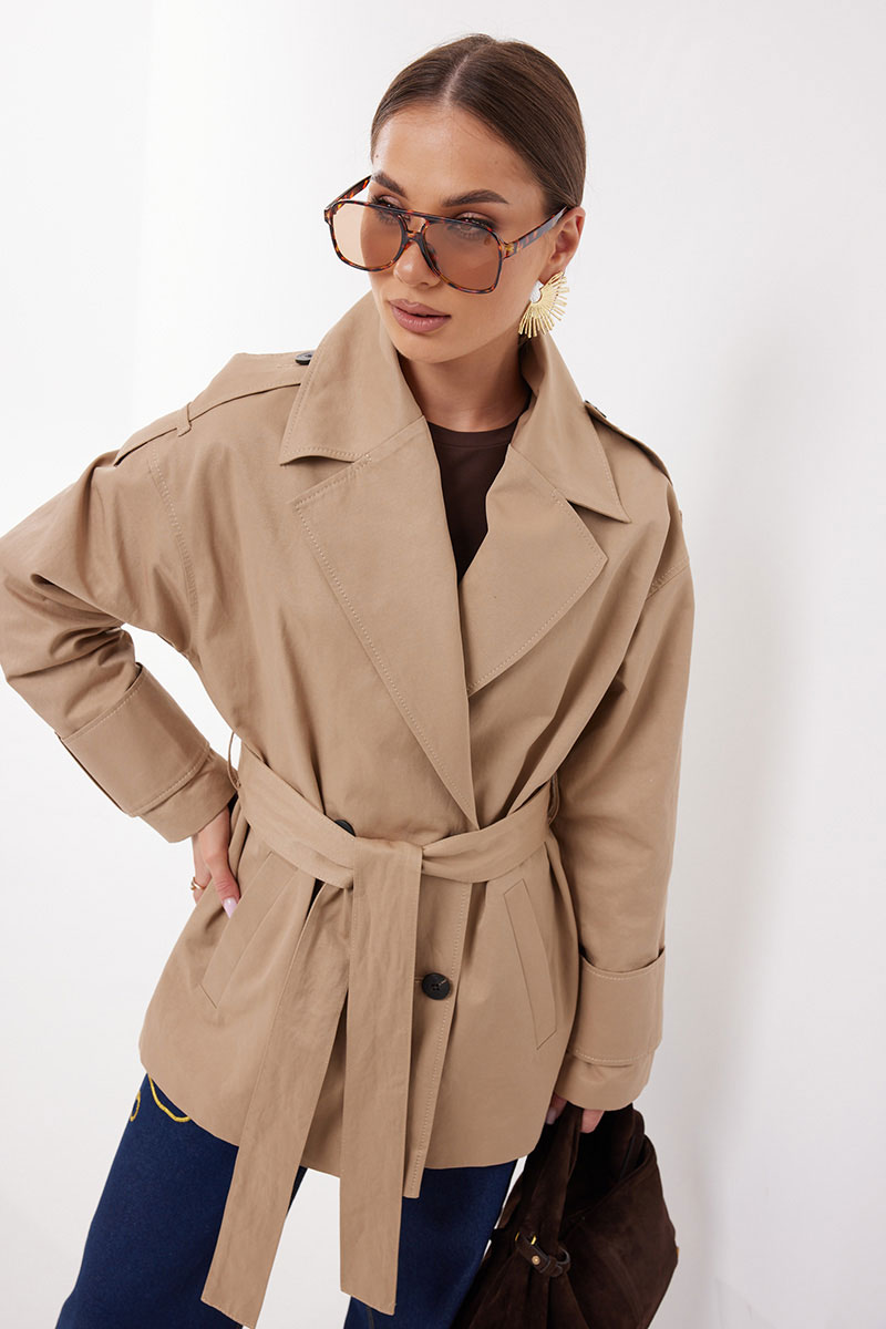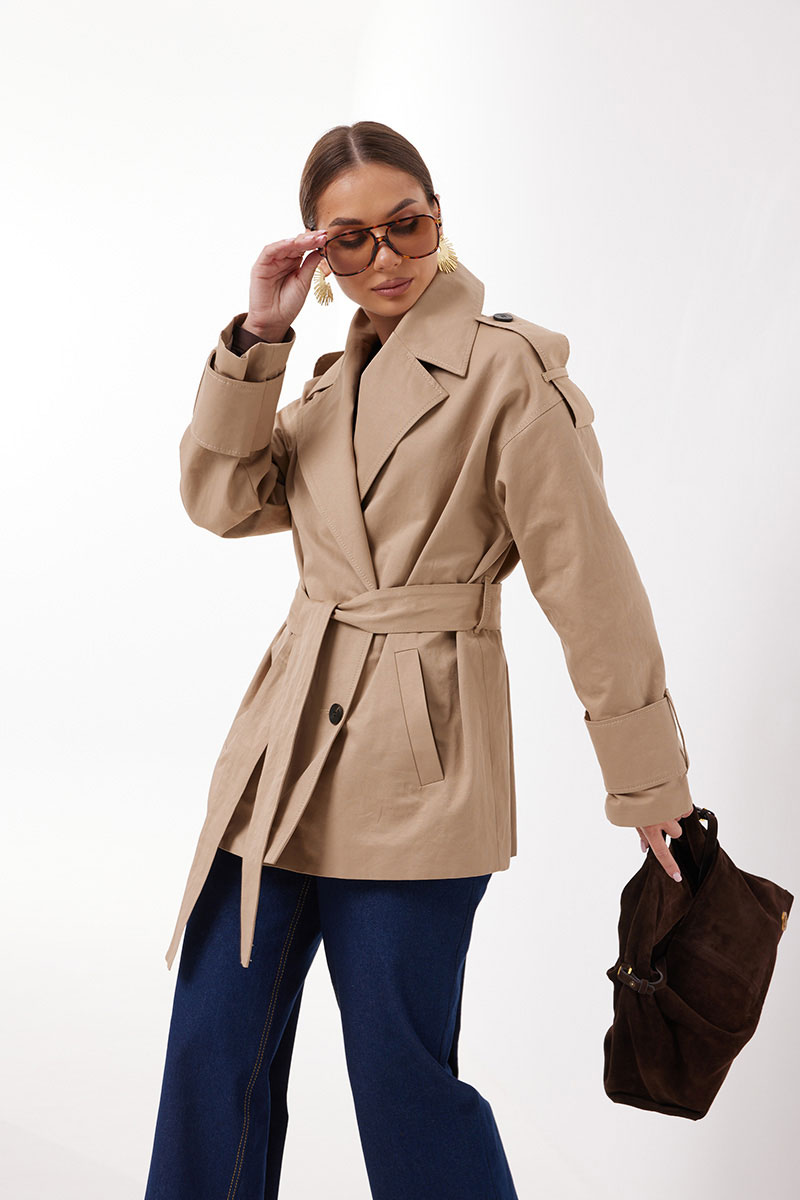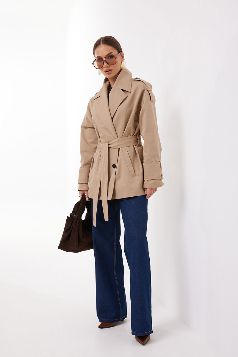 Жакет двубортный. Застёжка на петли и пуговицы-болты. Воротник пиджачного типа. По переду прорезные карманы. Рукав прямой, по низу рукава пата со шлёвками. Погон по плечевому шву, на петлю и пуговицу-болт. В комплекте завязывающийся пояс. Жакет на подкладке.