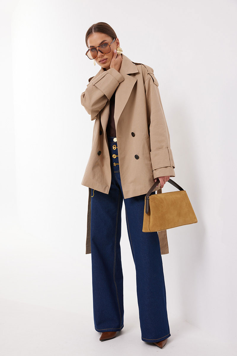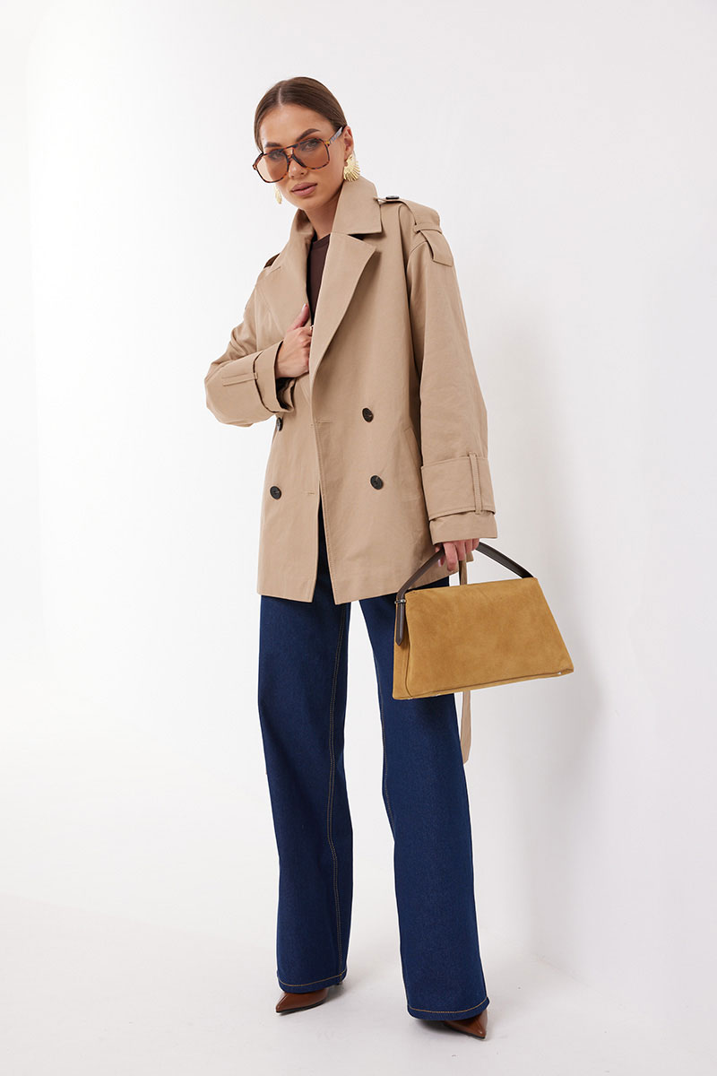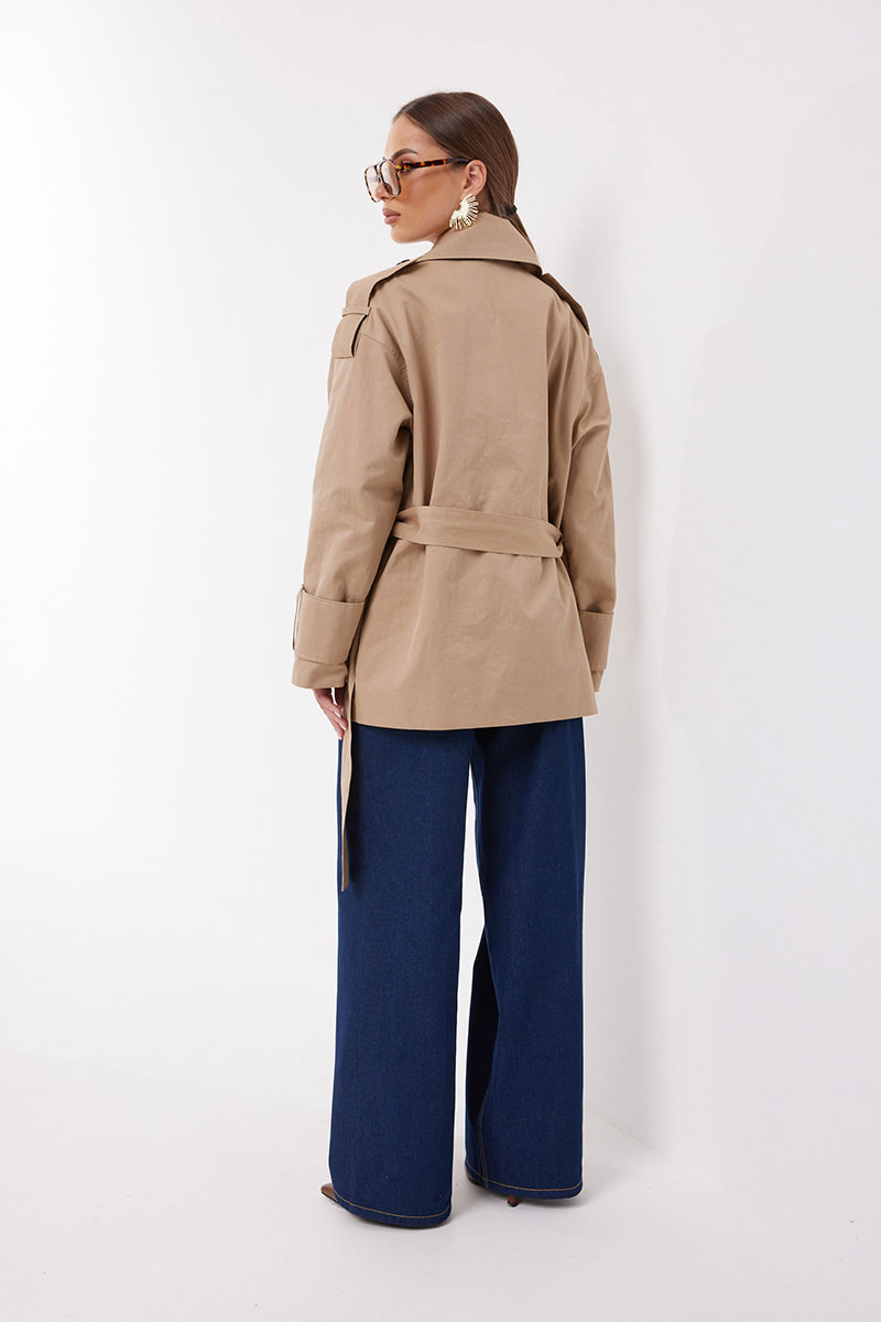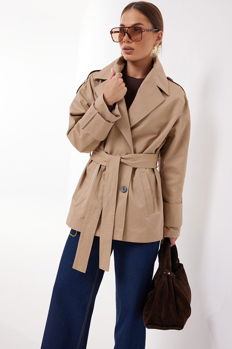 Жакет двубортный. Застёжка на петли и пуговицы-болты. Воротник пиджачного типа. По переду прорезные карманы. Рукав прямой, по низу рукава пата со шлёвками. Погон по плечевому шву, на петлю и пуговицу-болт. В комплекте завязывающийся пояс. Жакет на подкладке.