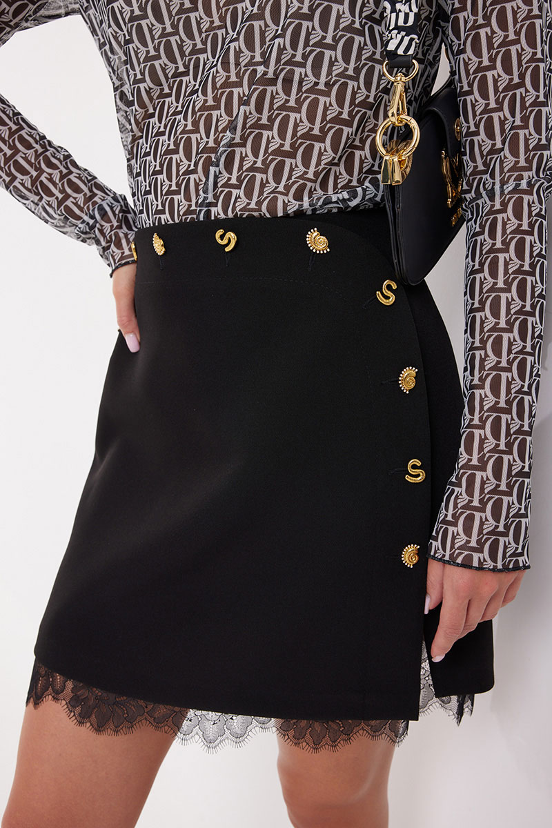 Юбка женская на подкладке, длиной мини. Юбка имеет слегка расширенную к низу форму, переднее полотнище из двух частей с имитацией запаха и застежки на декоративные пуговицы. Подкладка юбки с красивой кружевной деталью по низу, кружево на 3-4 см «выглядывает» из-под нижнего края юбки. Застежка в боковом шве на потайную застежку-молнию. Верхний край юбки обработан обтачкой, по заднему полотнищу обработаны талиевые вытачки.