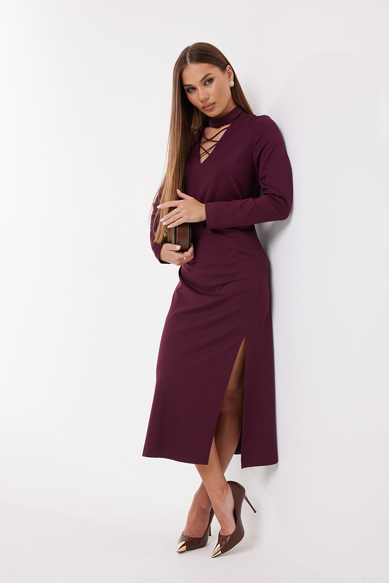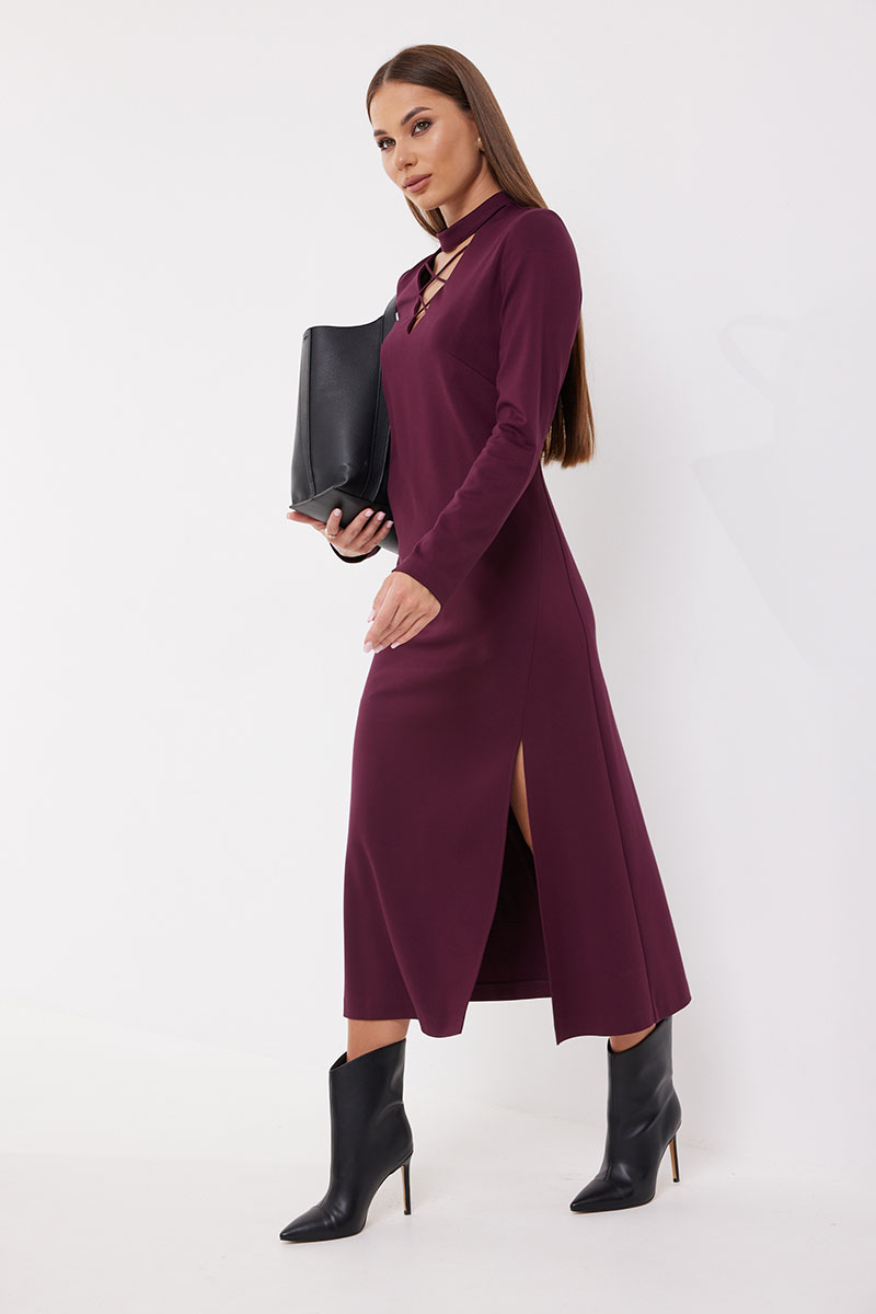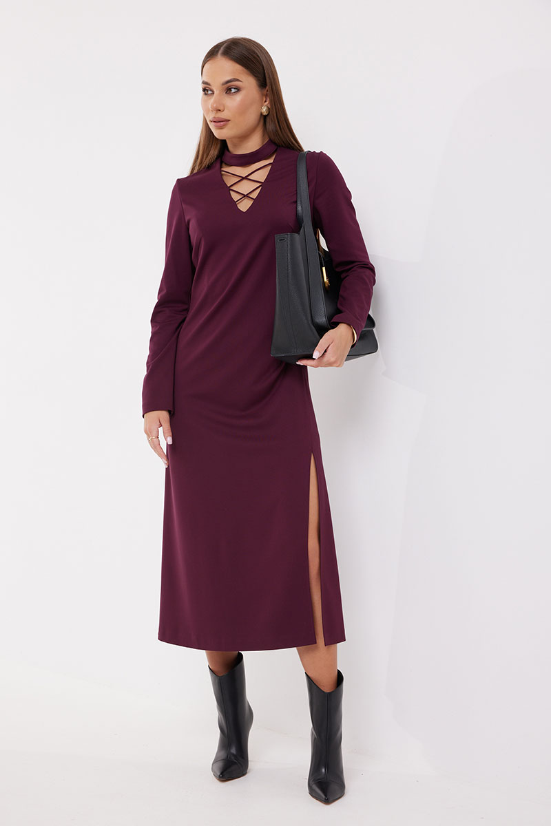 Платье полуприлегающего силуэта, расширенное к низу из трикотажного полотна. Воротник-стойка. Горловина V-образной формы с декоративной шнуровкой. По переду боковой разрез длиной 46 см. Рукав узкий прямой. Застёжка по спинке на потайную молнию. Платье на подкладке.
