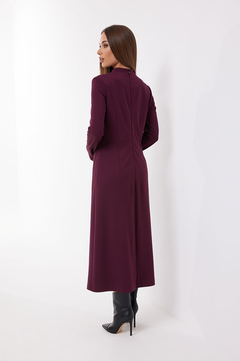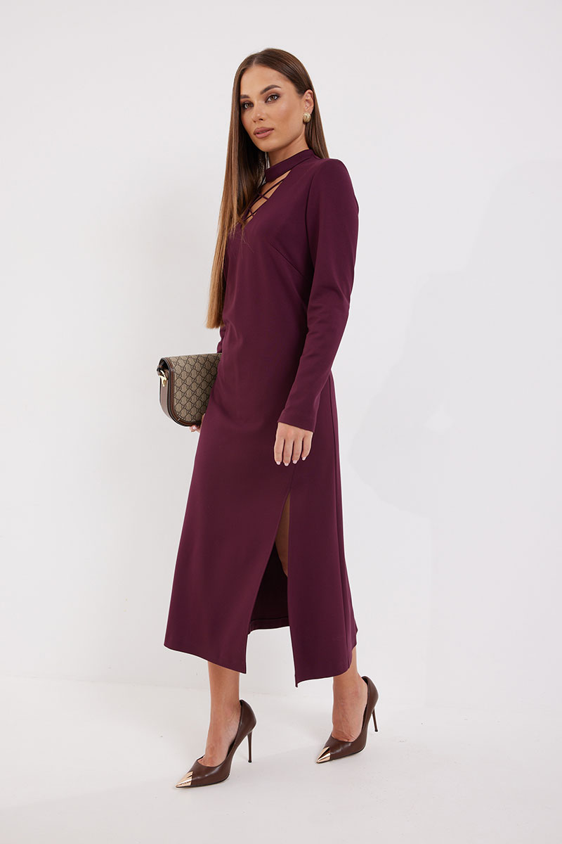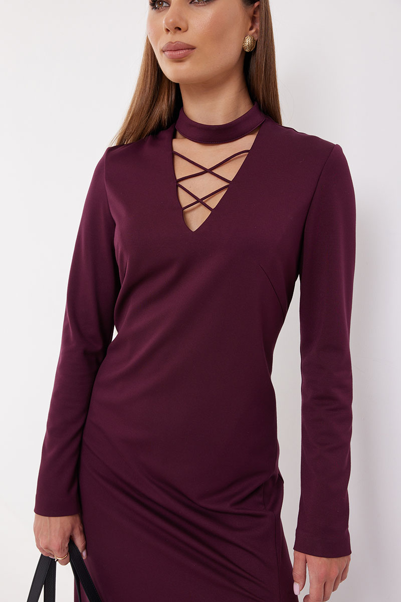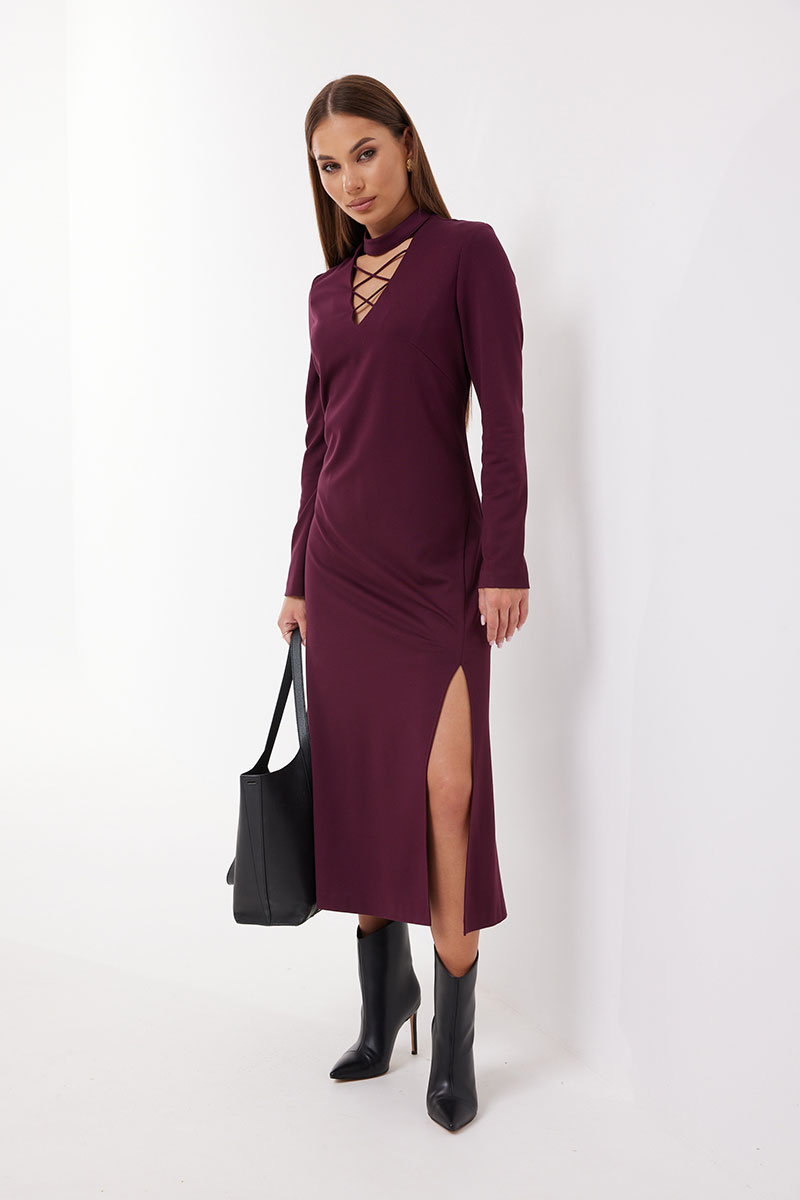 Платье полуприлегающего силуэта, расширенное к низу из трикотажного полотна. Воротник-стойка. Горловина V-образной формы с декоративной шнуровкой. По переду боковой разрез длиной 46 см. Рукав узкий прямой. Застёжка по спинке на потайную молнию. Платье на подкладке.