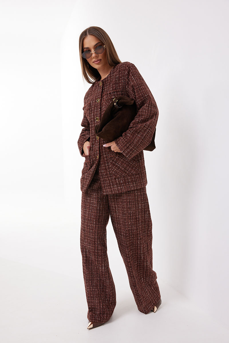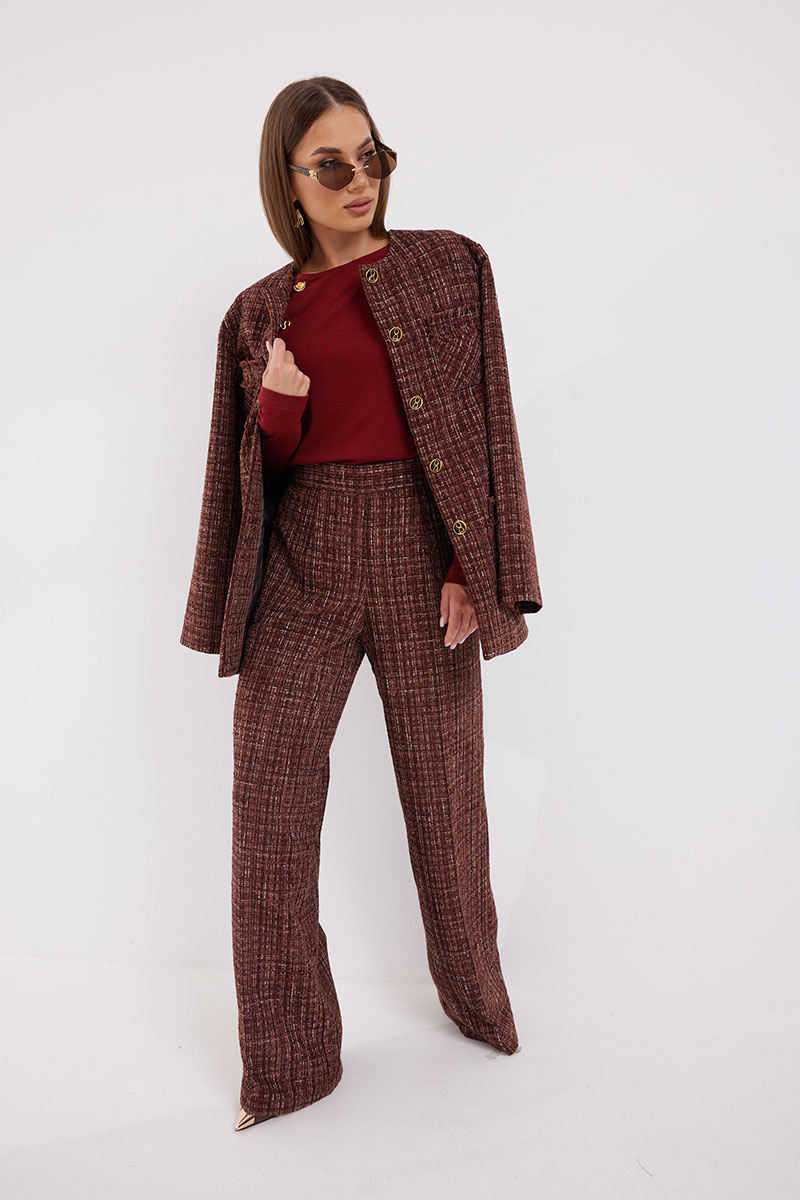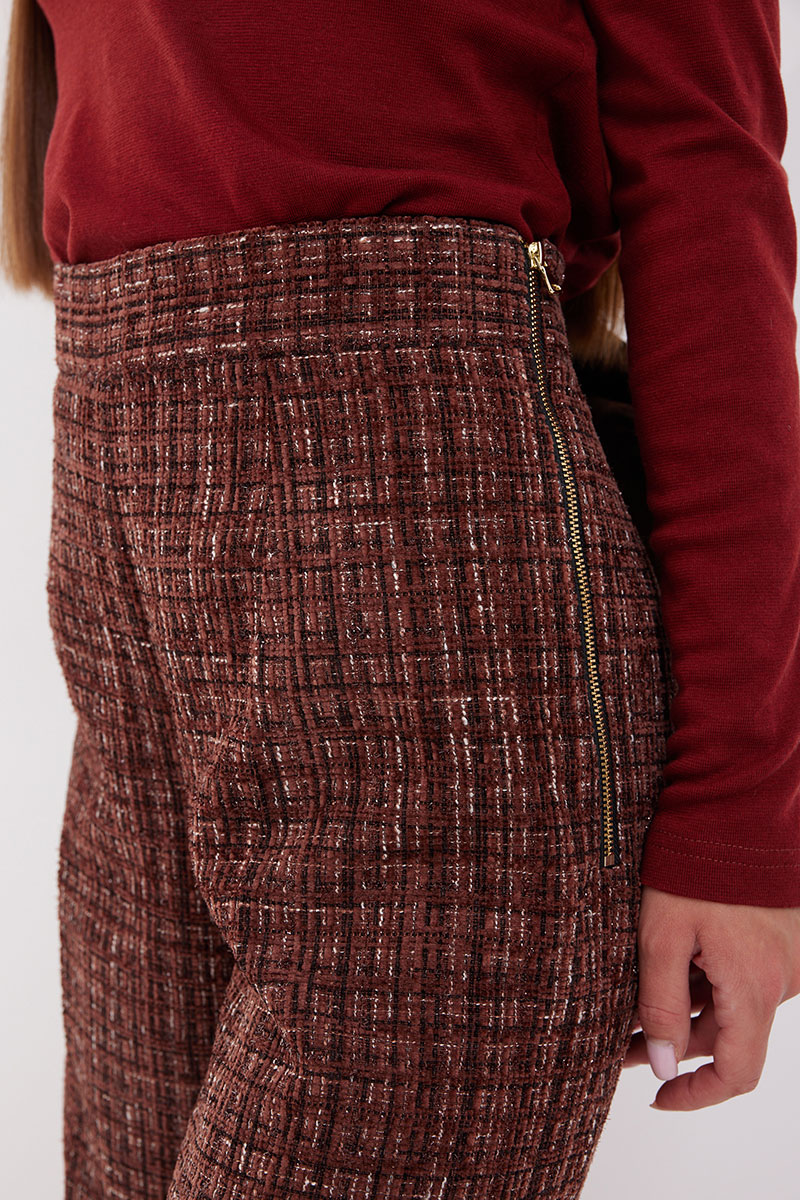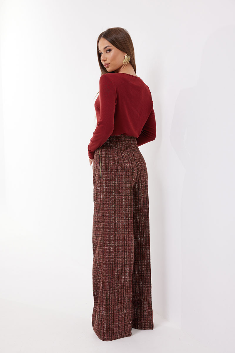 Брюки расширенные из ткани «рогожка». Верх на притачном поясе. Застёжка в боковом шве на металлическую молнию. Брюки на подкладке.