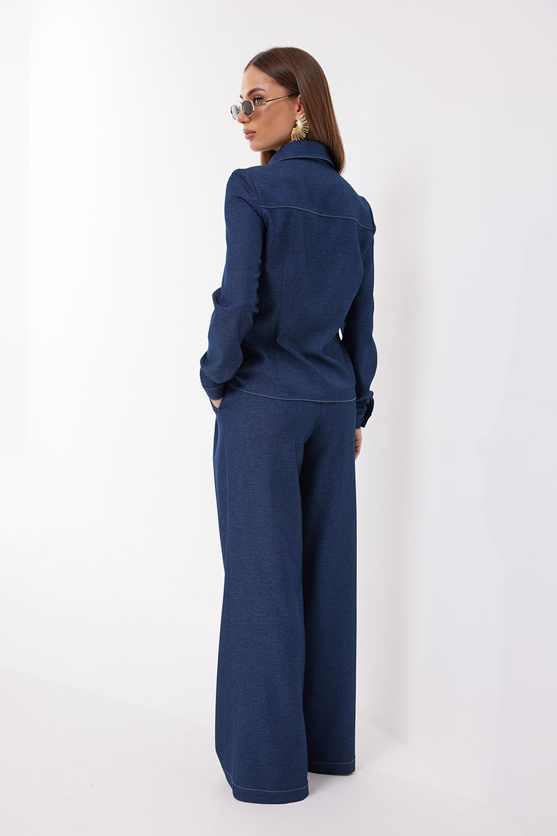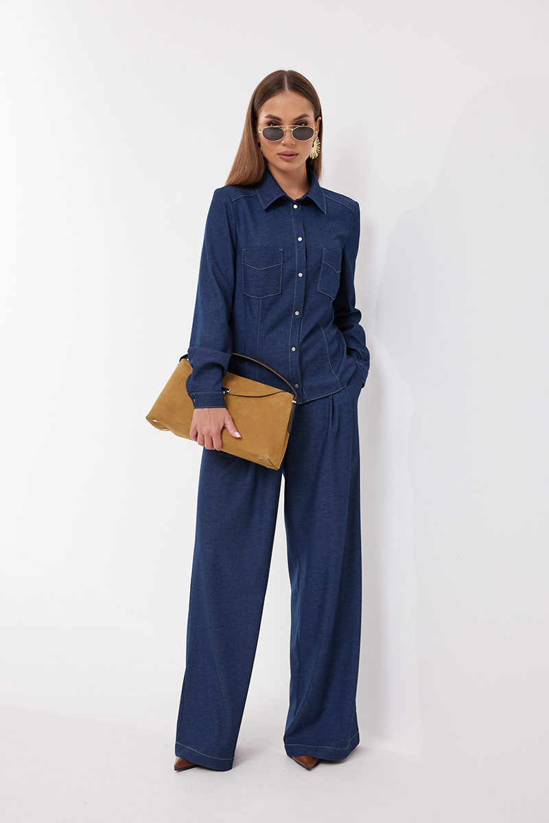Блузка женская полуприлегающего силуэта, из ткани «под джинс». Застежка центральная на кнопки, рукав втачной одношовный, по низу рукава обработана манжета, застегивающаяся на кнопку. Воротник рубашечный. По переду накладные карманы.