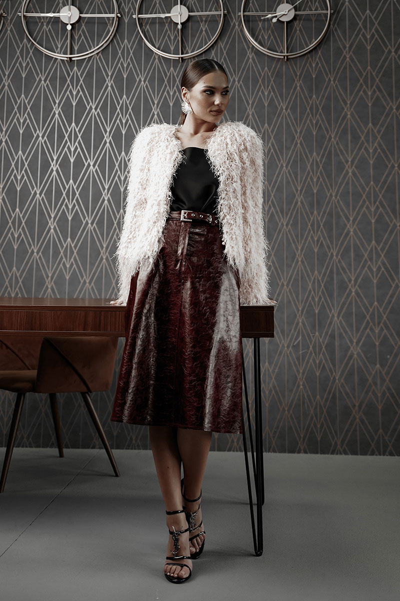 Юбка женская из трендовой фактурной экокожи на подкладке, длиной чуть ниже колена, пояс притачной, спереди застежка на молнию и кнопку и боковые карманы, в комплекте ремень из оригинальной ткани с декоративной пряжкой. Вертикальные швы, карманы и низ юбки обработаны «открытым» швом.