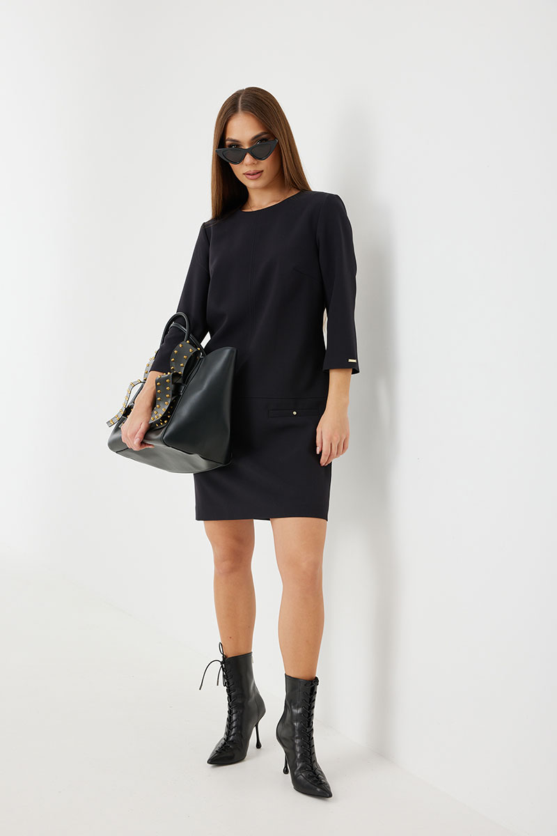 Платье женское из костюмно-плательной ткани на подкладке. Рукав укороченный, одношовный. По спинке средний шов и талевые вытачки, что создает полуприлегающий силуэт. По переду горизонтальный подрез чуть ниже линии талии. На нижней части переда имитация кармана- листочка с золотистой хальнитеной.