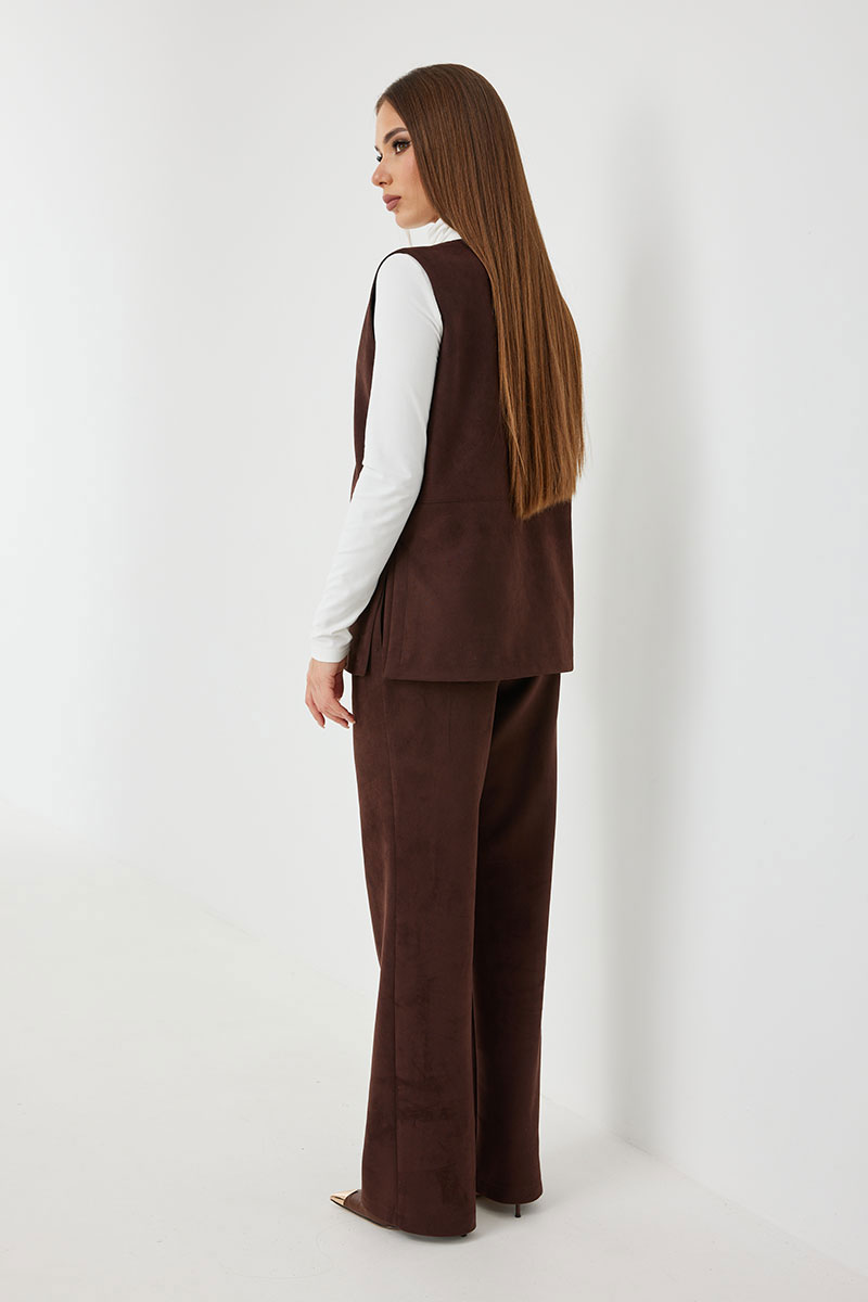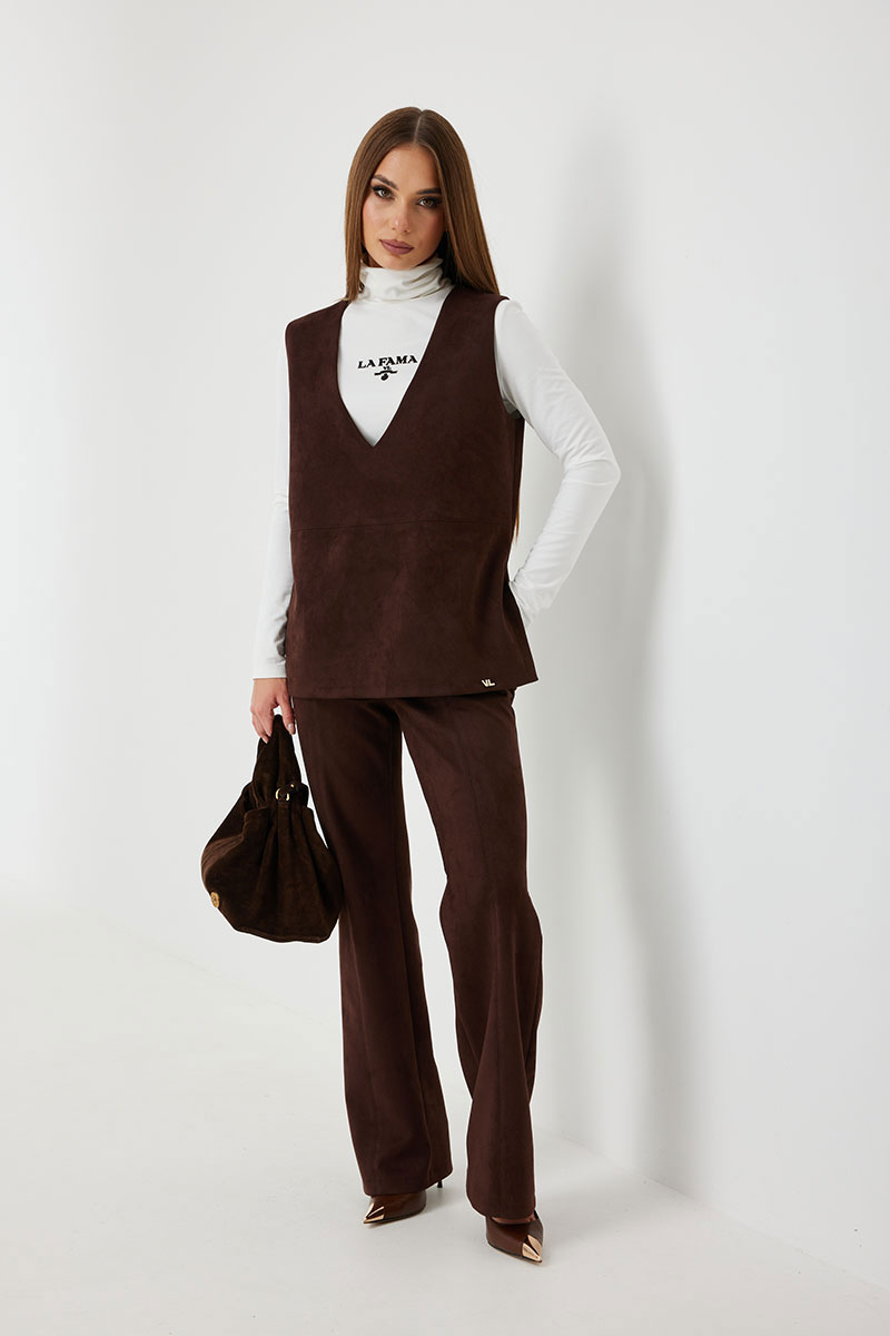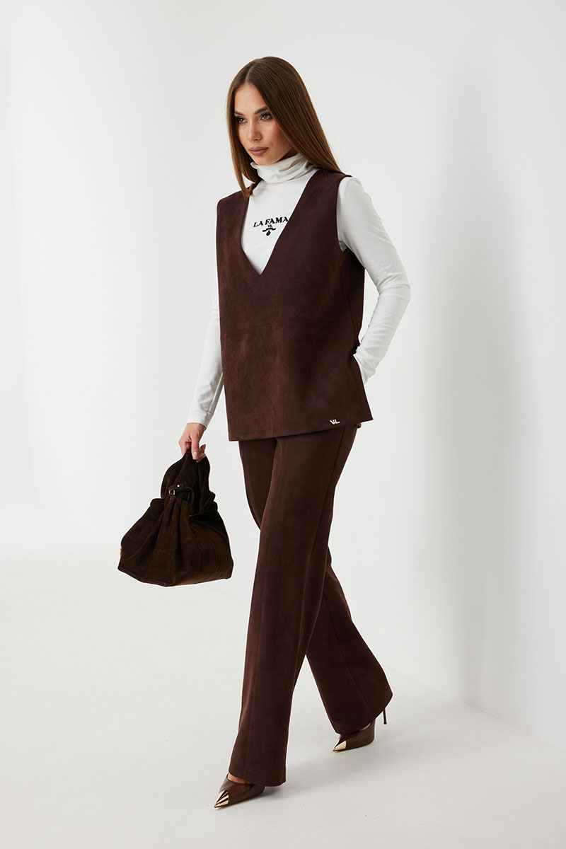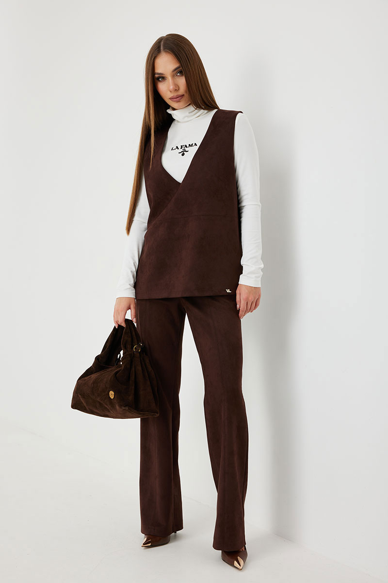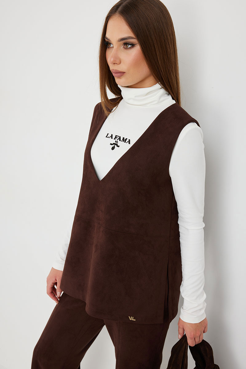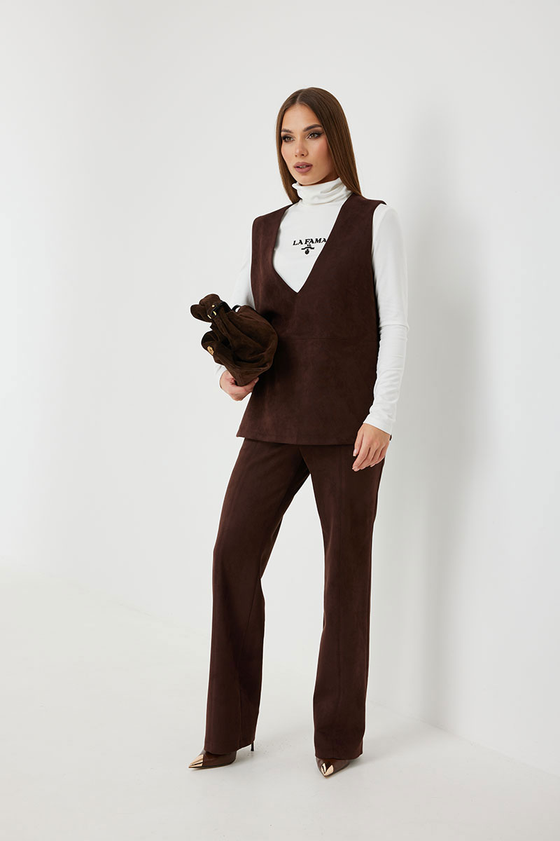 Жилет женский из ткани «под замшу» прямого силуэта на подкладке, вырез горловины глубокий V-образный, по боковым швам разрезы, по переду и спинке горизонтальные декоративные швы.