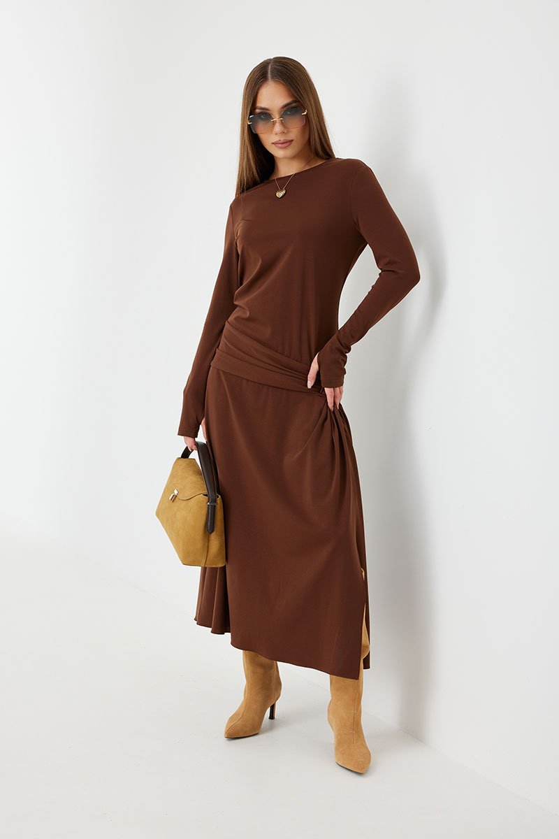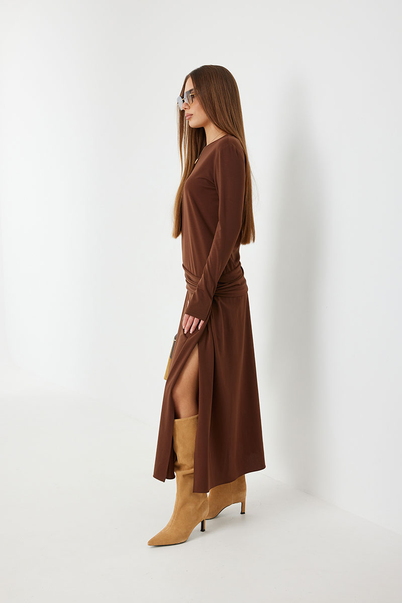 Платье женское прилегающего силуэта, длиной миди, с подрезом и интересной драпировкой в области чуть ниже талии по переду, юбка, расширенная книзу. Горловина обработана бейкой. Рукав втачной, узкий.