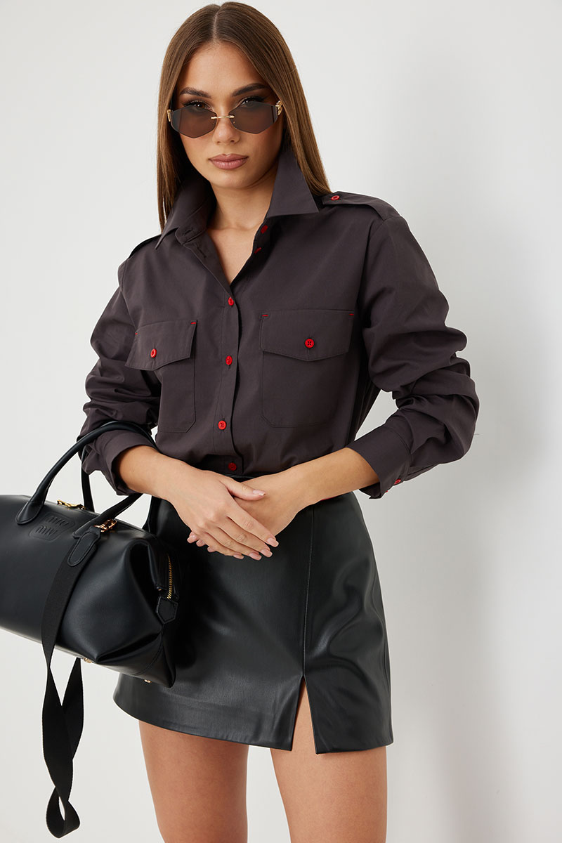 Блузка женская свободного силуэта, из рубашечной ткани в полоску. Спинка с кокеткой. Застежка на петли и пуговицы, по переду накладные карманы с клапанами, по плечевым швам погоны, фиксирующиеся пуговицей, рукав свободный, по низу манжета с пуговицами. Воротник рубашечный со стойкой.