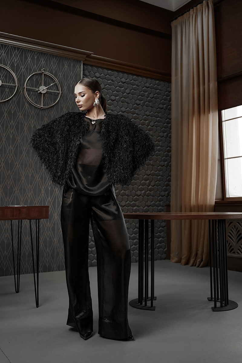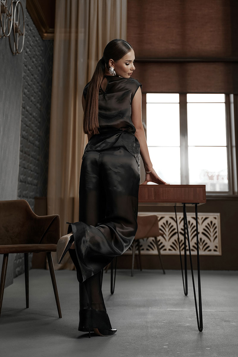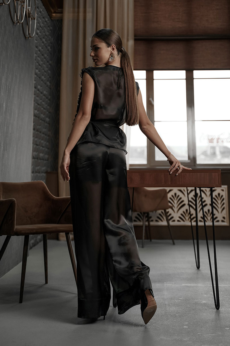 Брюки из нарядной полупрозрачной ткани «органза», прямые, широкие. Средняя посадка, пояс притачной, застежка спереди на молнию и декоративную пуговицу. Брюки с глубокими складками по переду. Брюки на подкладке в виде шорт.