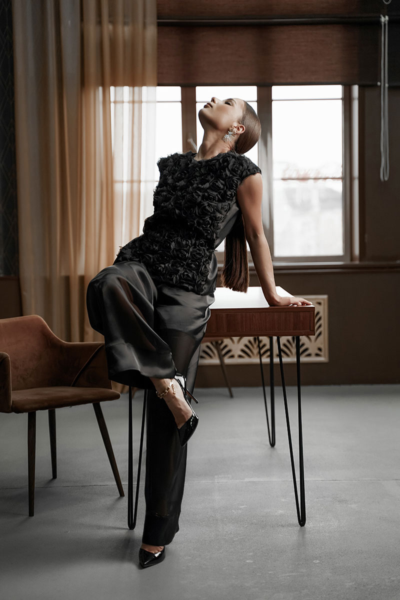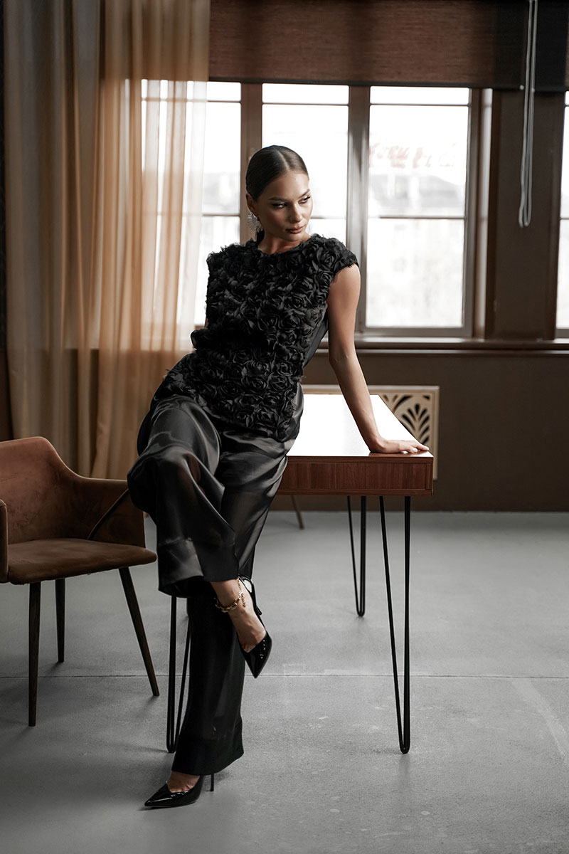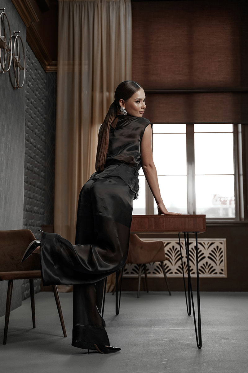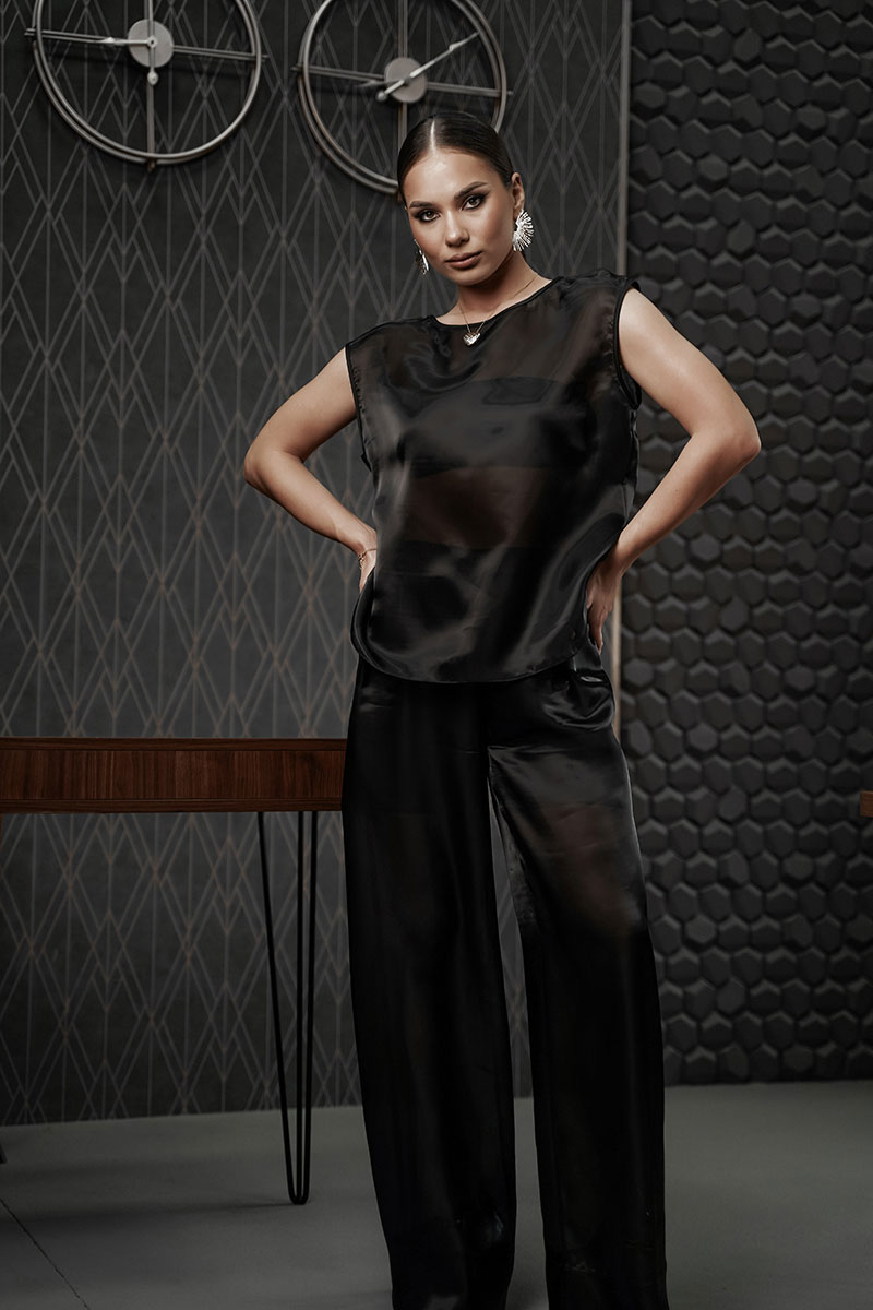 Брюки из нарядной полупрозрачной ткани «органза», прямые, широкие. Средняя посадка, пояс притачной, застежка спереди на молнию и декоративную пуговицу. Брюки с глубокими складками по переду. Брюки на подкладке в виде шорт.