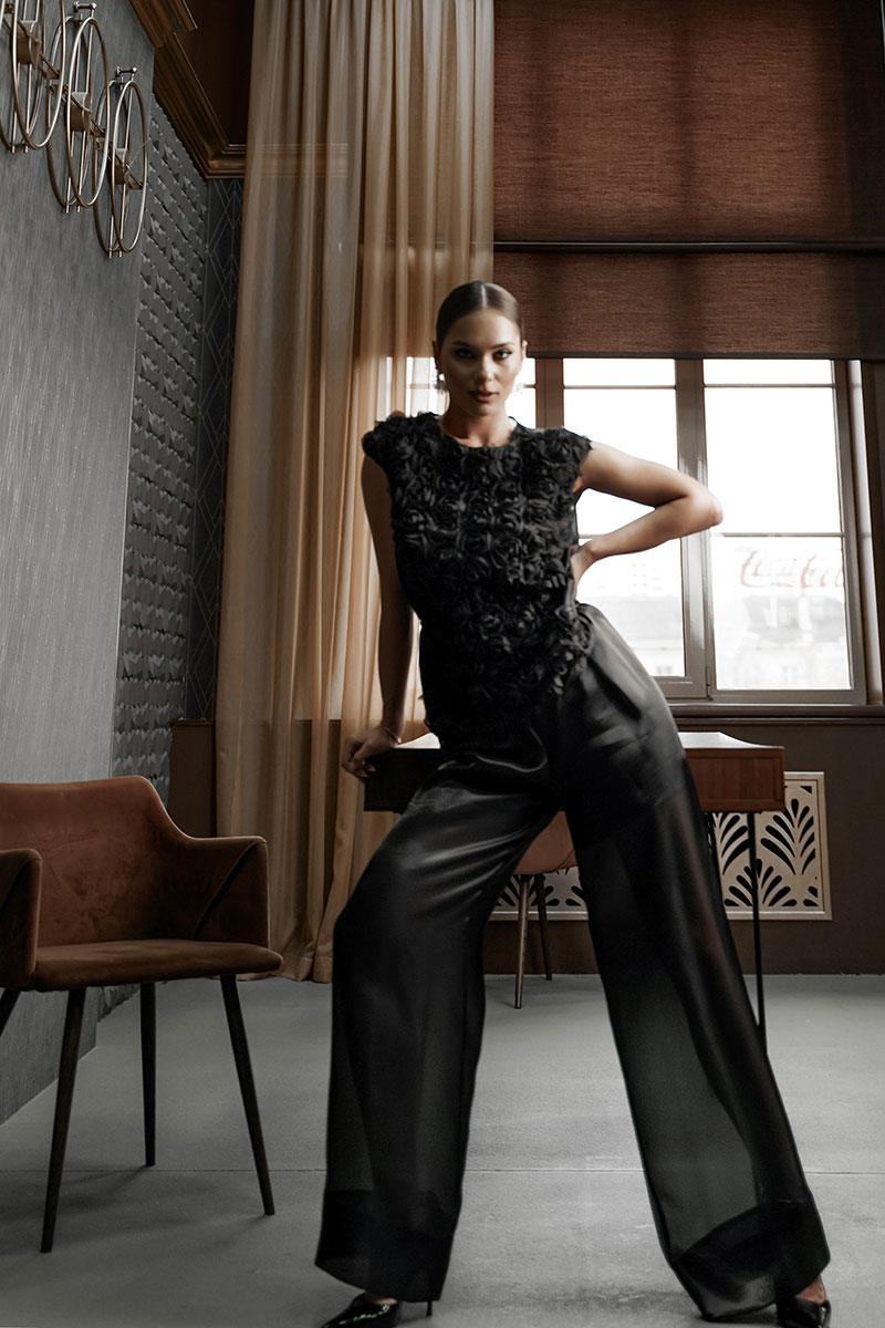 Блузка прямого силуэта со спущенным плечом. Перед из фактурной ткани «розы