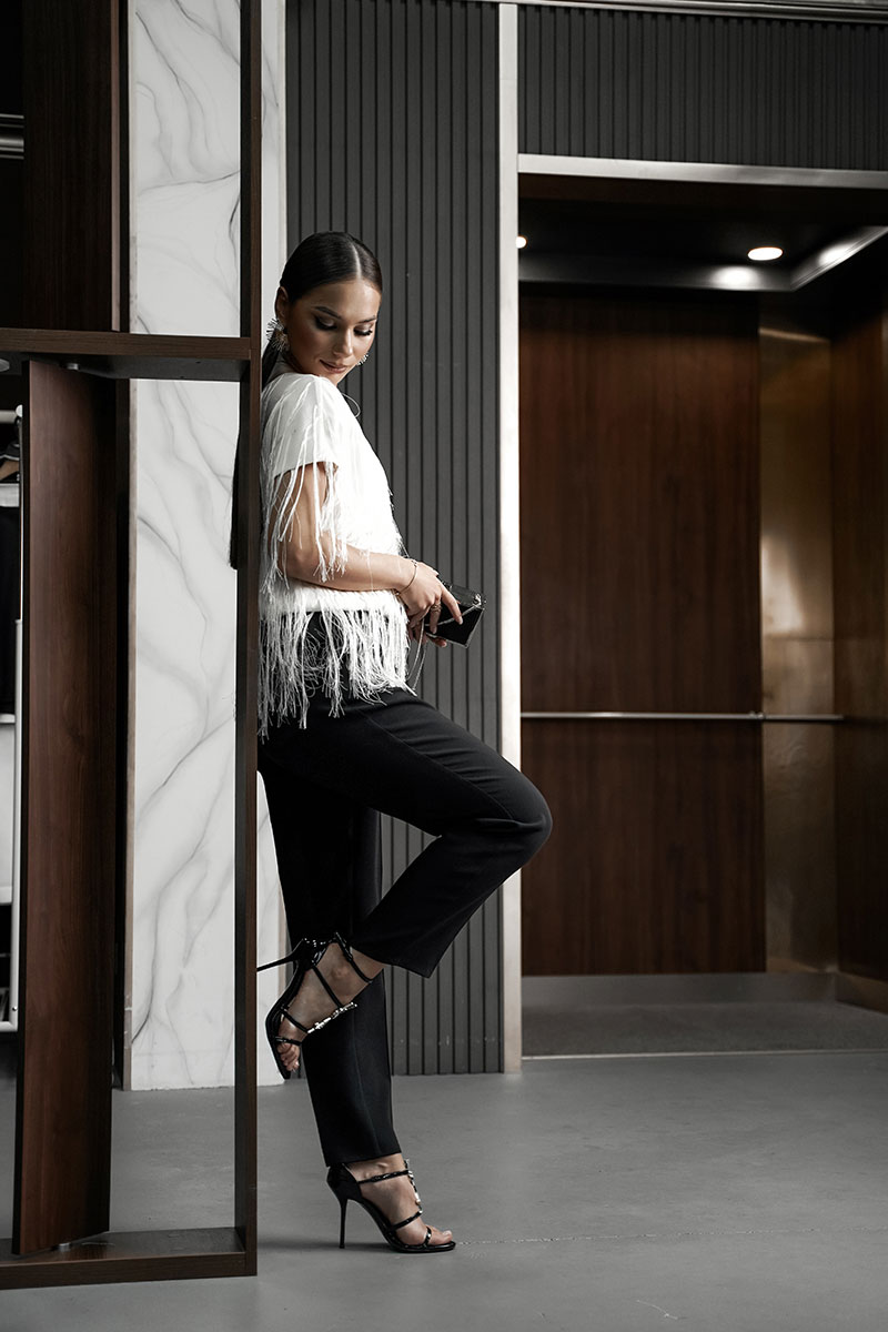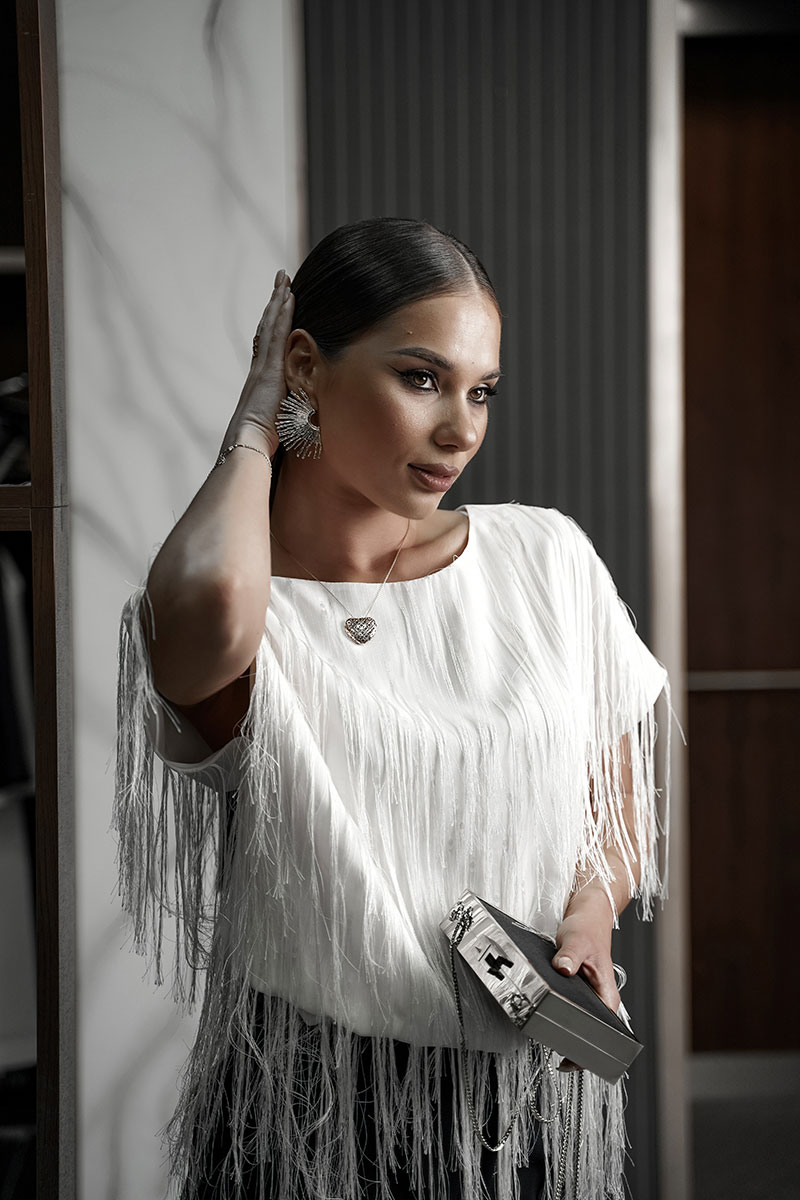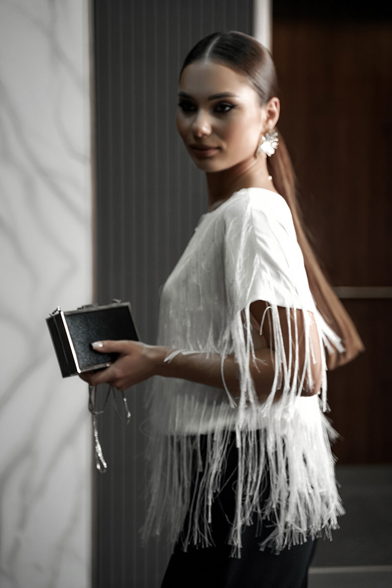 Блузка свободного силуэта с коротким цельновыкроенным рукавом, из нарядной плательно-блузочной ткани с бахромой. По переду горловина округлой формы, по спинке-V-образной. Блузка на атласной подкладке.