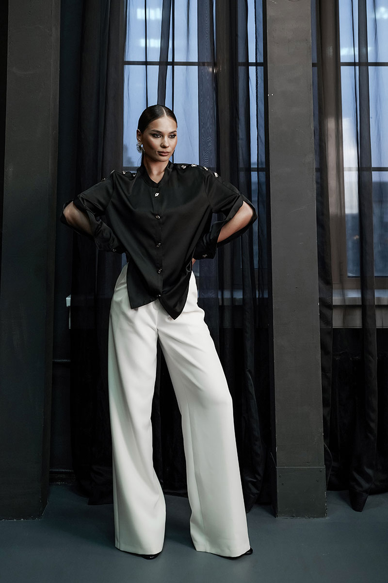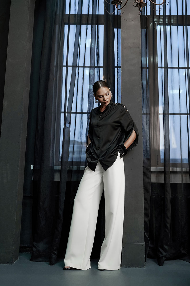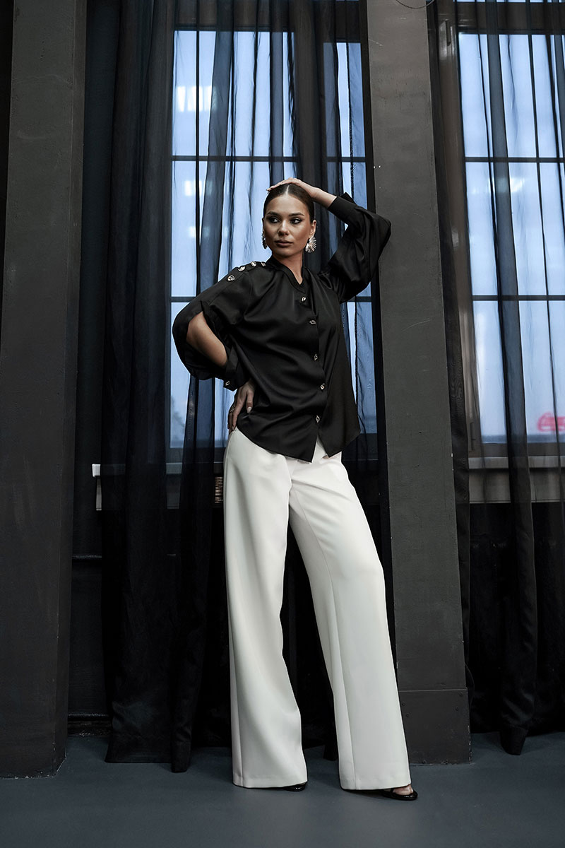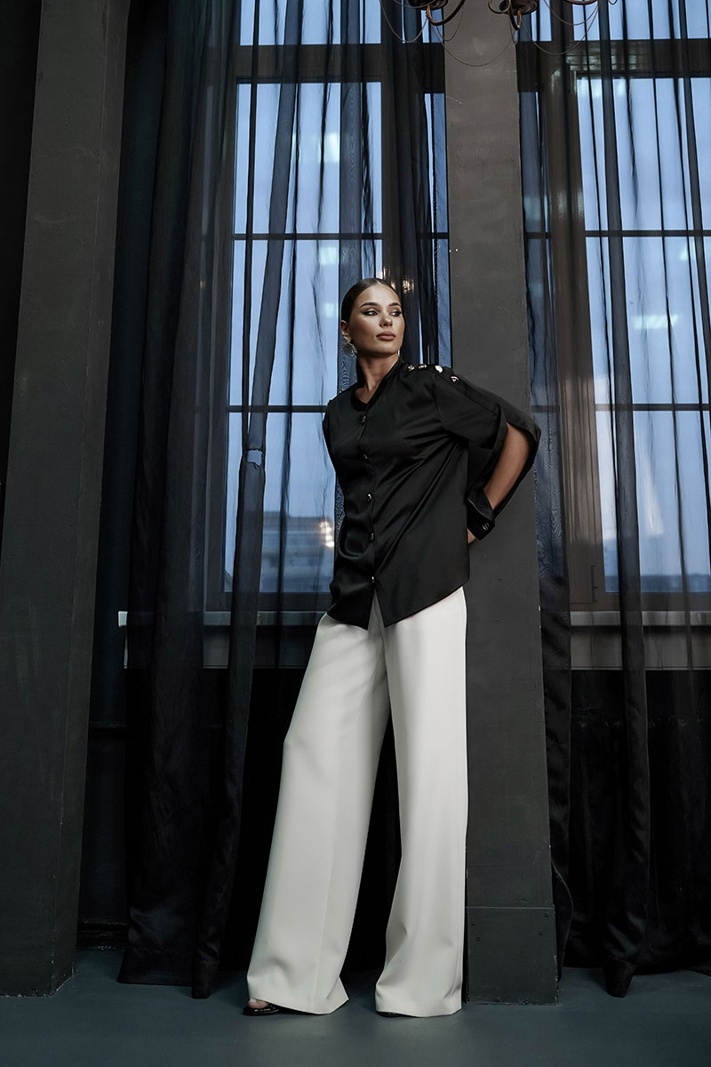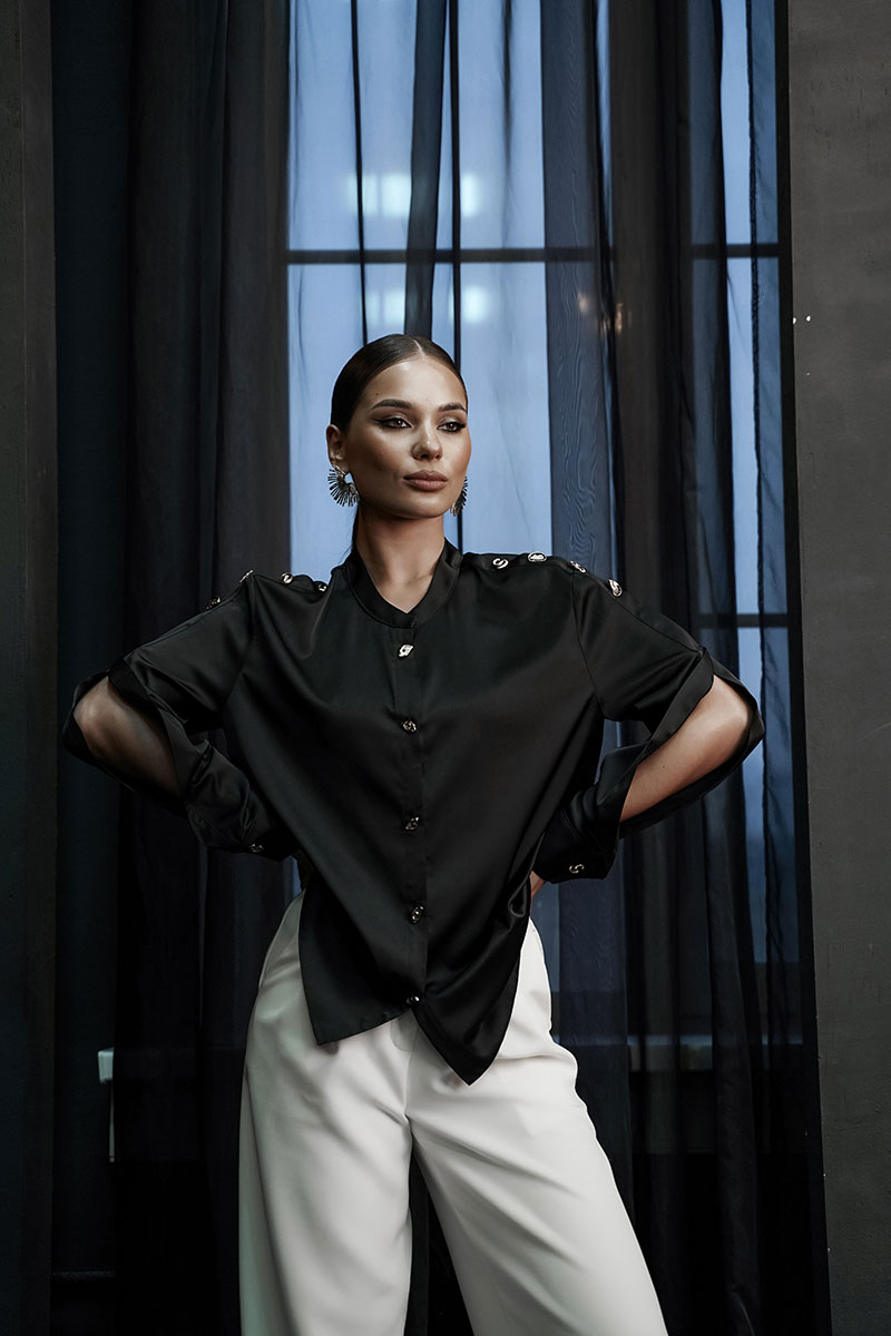 Блузка женская из блузочной ткани с деликатным блеском, свободного силуэта, с застежкой по переду сверху до низа блузки на пять петель и пуговиц. Рукава длинные со складкой внизу, низ рукава на манжете, манжет застегивается на петлю и пуговицу. По плечевым швам и рукаву имитация застежки на планку по всей длине. По планке в верхней части четыре петли и декоративные пуговицы, снизу рукав с «распахивающимися» планками. Воротник - невысокая стойка, прилегающий к шее. Блузка декорирована эффектными пуговицами в стиле «скиапарелли».