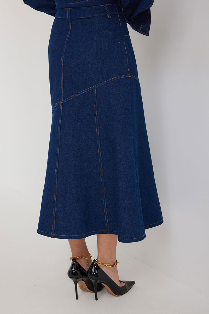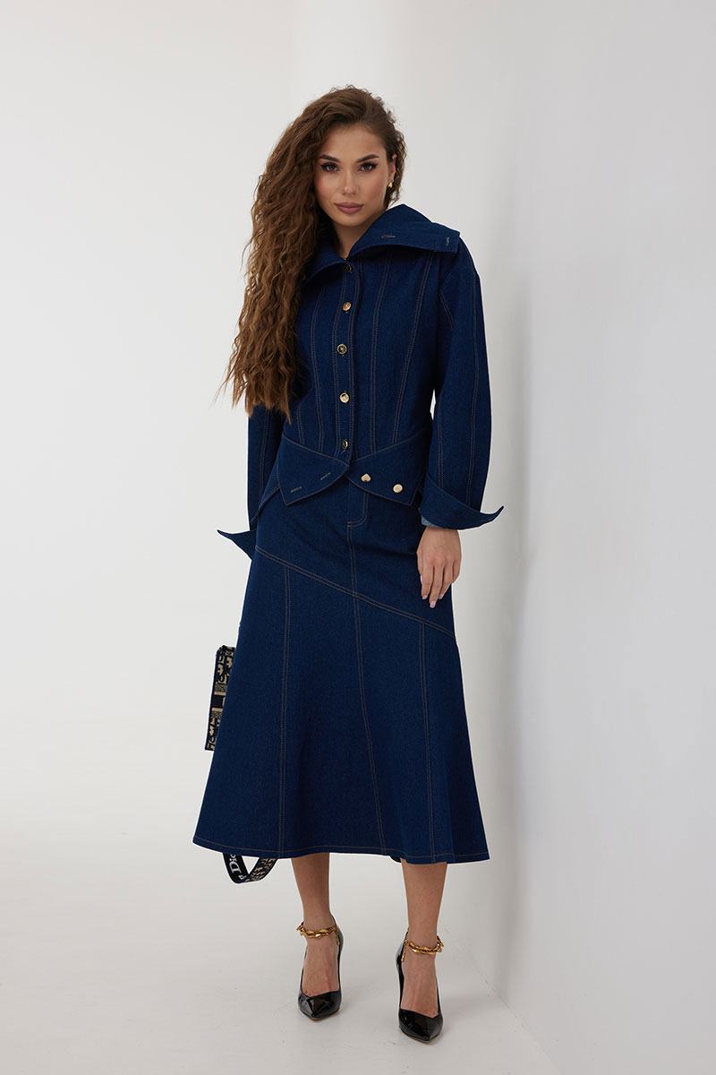 Юбка женская из джинсовой ткани, длиной миди, силуэта «рыбка». Пояс притачной со шлевками под ремень, застежка на молнию и джинсовую пуговицу, по переду боковые карманы, по спинке талиевые вытачки и средний шов. Юбка имеет фигурный наклонный подрез, нижняя часть юбки от подреза из 8 клиньев, которые создают силуэт. Все швы отстрочены контрастными нитками.