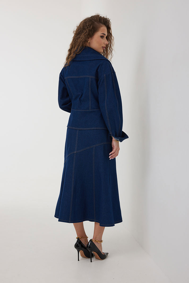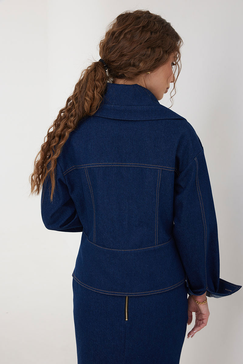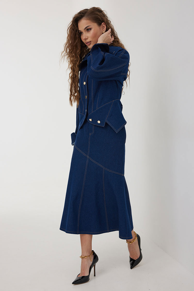 Жакет женский, из джинсовой ткани, объемный в верхней части и полуприлегающий в области талии, с подрезом и фигурной баской, длиной выше линии бедер. Застежка на планку с петлями и джинсовыми пуговицами. Воротник высокий стояче-отложной застегивающийся на две пуговицы. Жакет с удлиненной линией плеча, рукав свободный длинный с вертикальными швами, по низу с манжетами, застегивающимися на пуговицу. Спинка с кокеткой и рельефами, перед с двойными рельефами от плеча до линии подреза. Все швы отстрочены контрастными нитками.