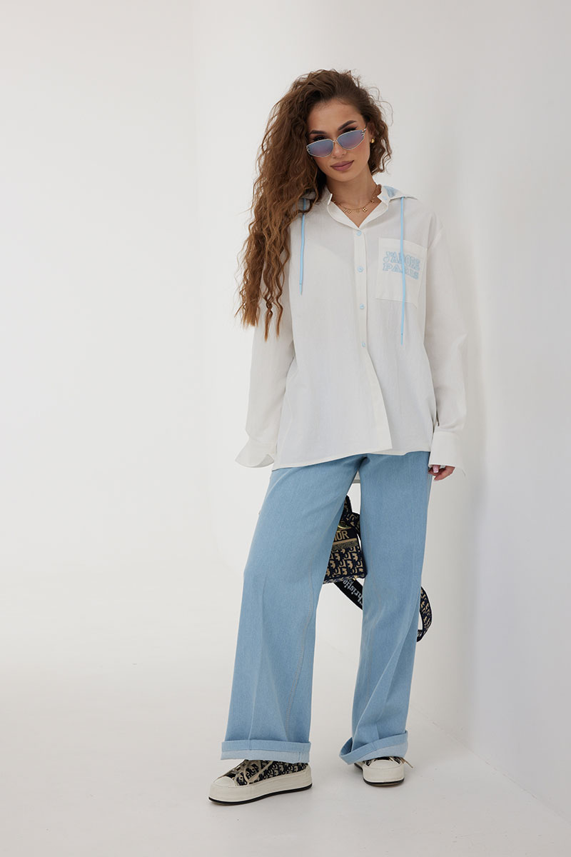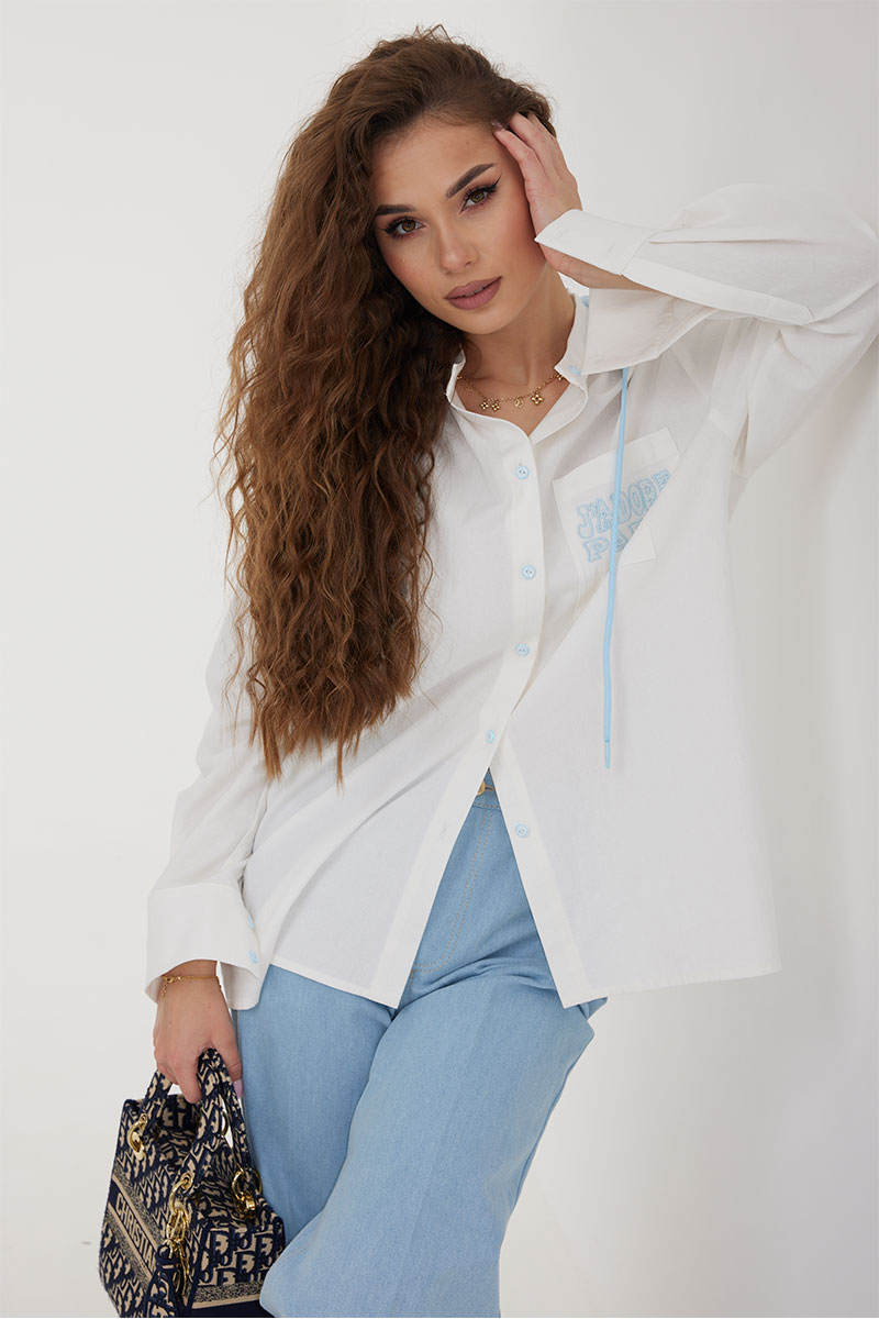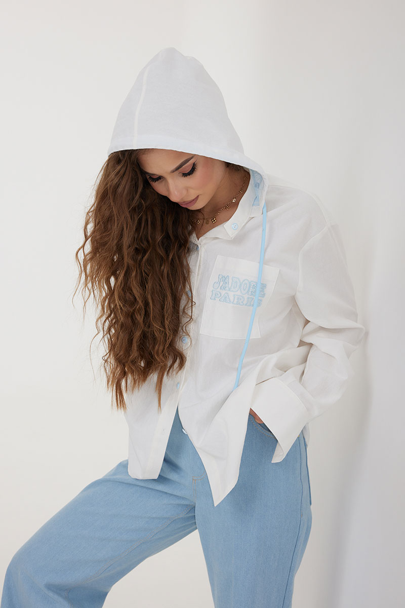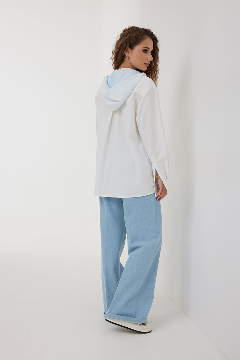 Блузка женская свободного силуэта со слегка спущенной линией плеча, с капюшоном. Застежка на планку с петлями и пуговицами. Воротник – невысокая стойка. Рукав свободный