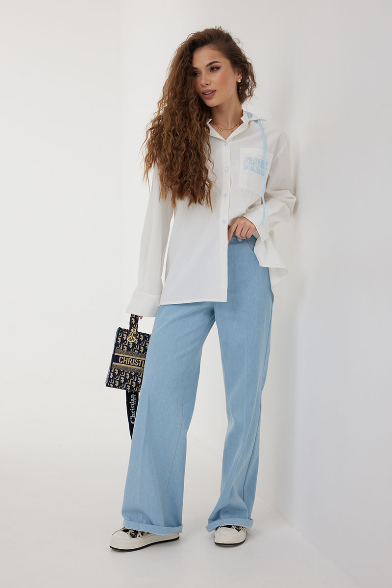 низу на манжете, застегивающейся на две пуговицы. По переду слева накладной карман, декорированный вышивкой. Спинка удлиненная, с кокеткой и встречной складкой по центру.
