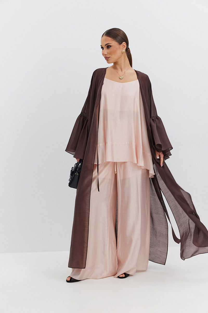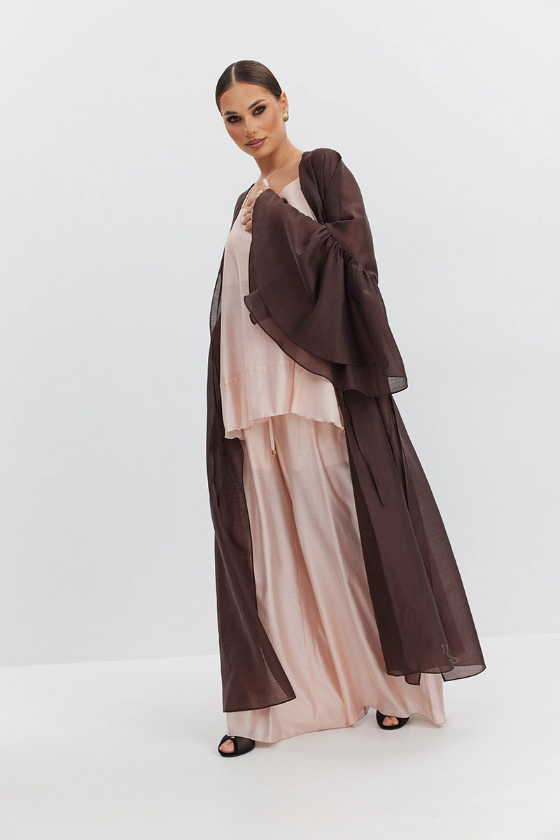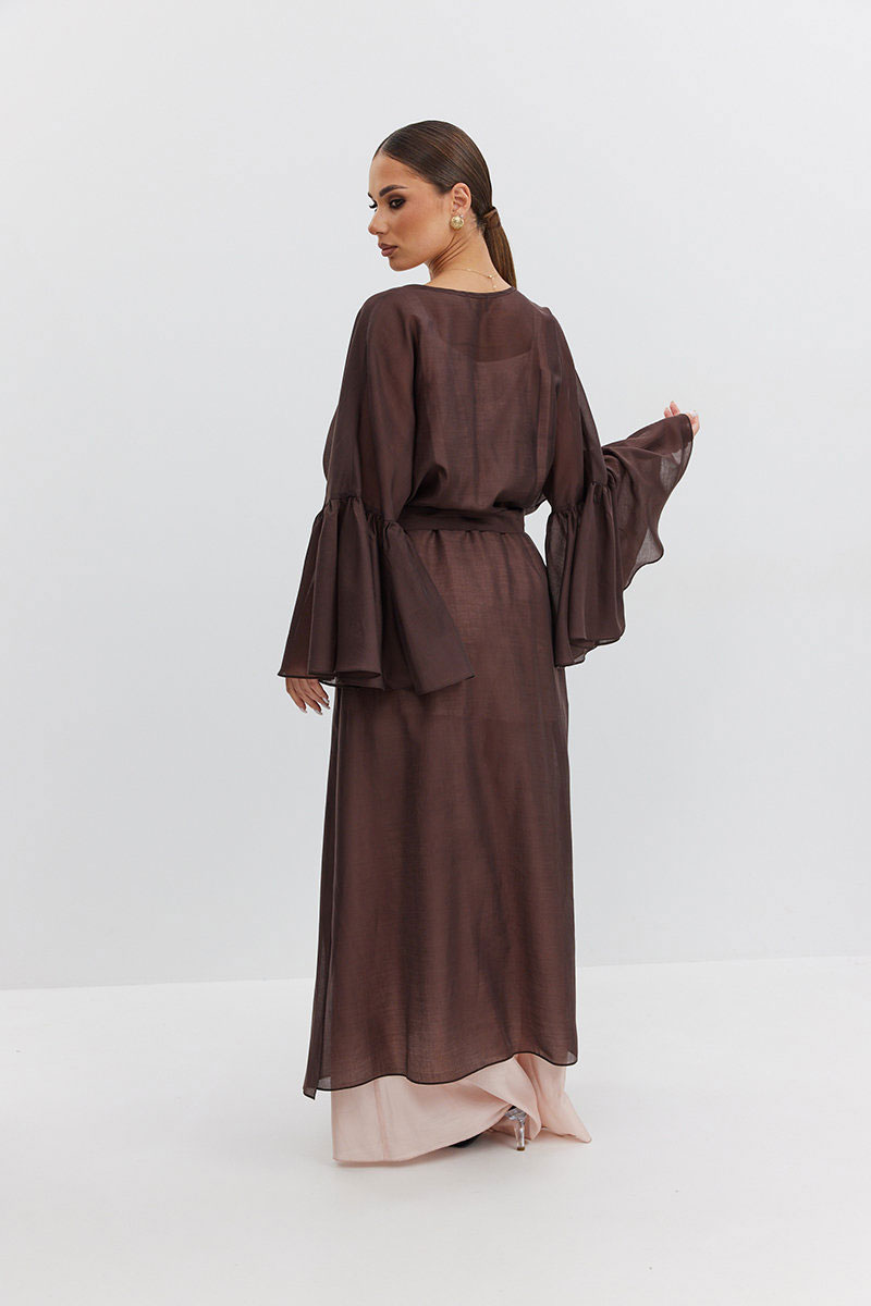 горловины плавной формы, обработан окантовками, переходящими в завязки по переду. Рукав спущенный, с широким собранным воланом по низу. По боковым швам выполнены высокие разрезы.