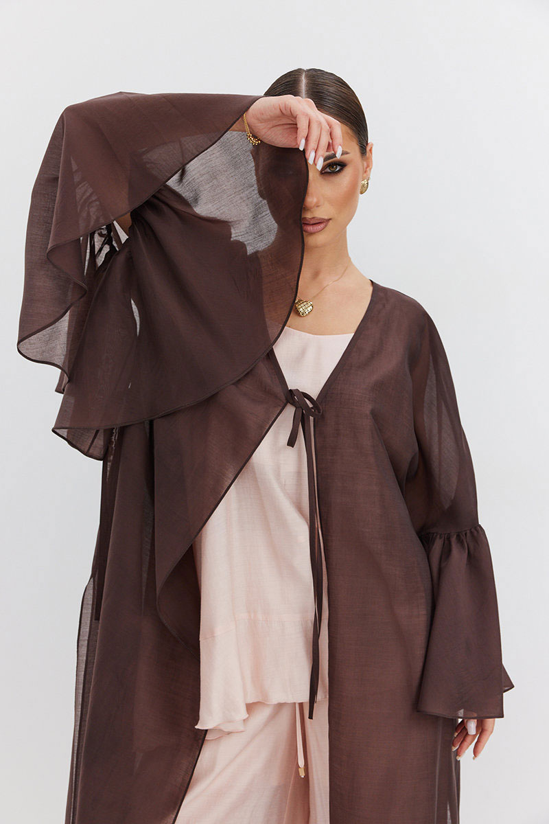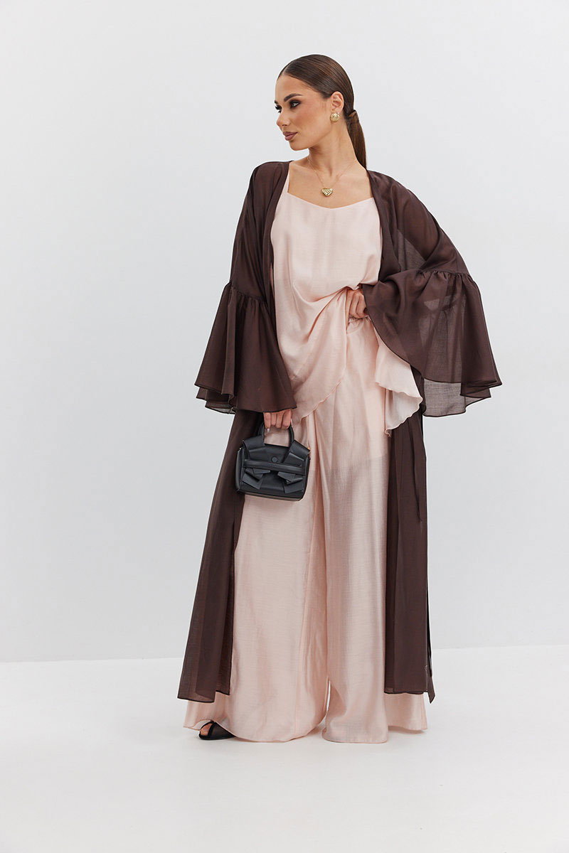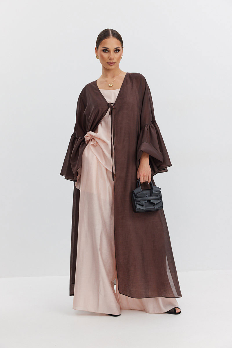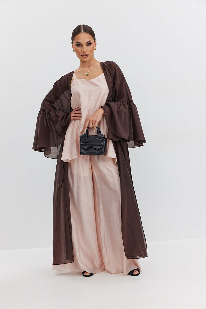 горловины плавной формы, обработан окантовками, переходящими в завязки по переду. Рукав спущенный, с широким собранным воланом по низу. По боковым швам выполнены высокие разрезы.