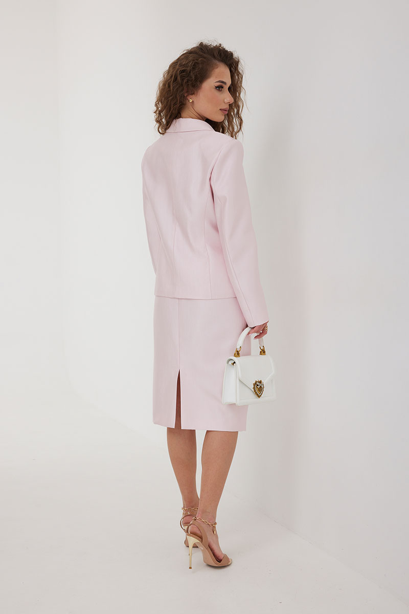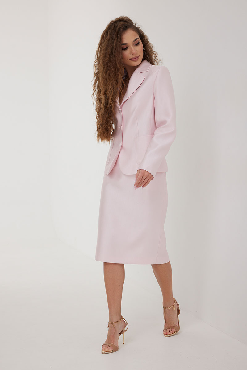 Юбка из костюмно-плательной ткани, зауженная к низу, ниже колена. Пояс цельнокроеный, по переду боковые карманы, застежка по центру заднего полотнища на потайную молнию, по низу разрез. Юбка на подкладке.