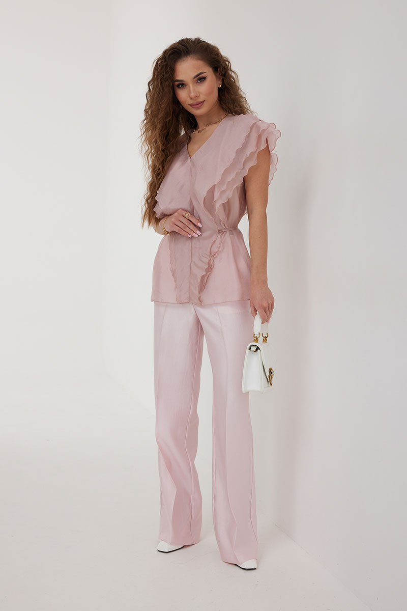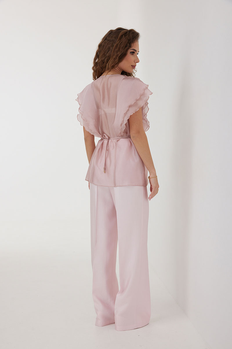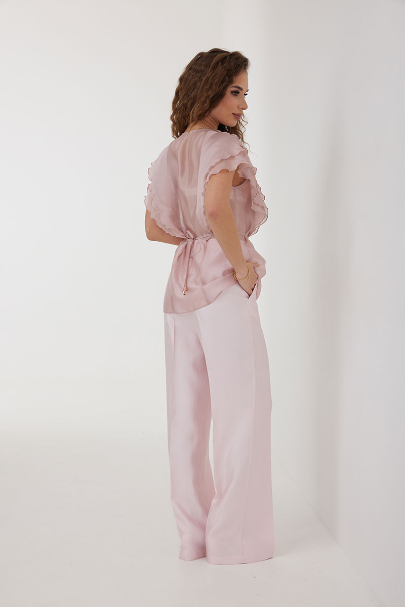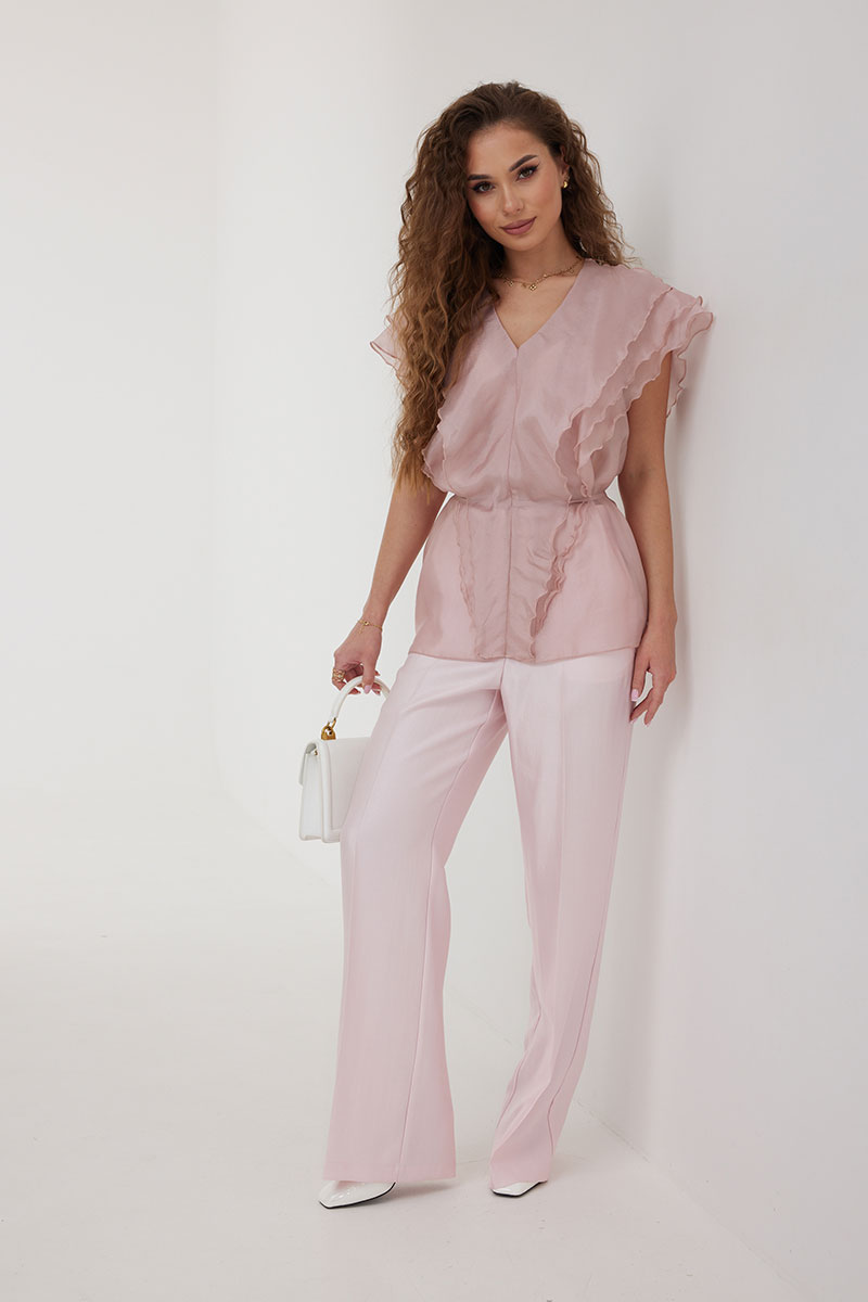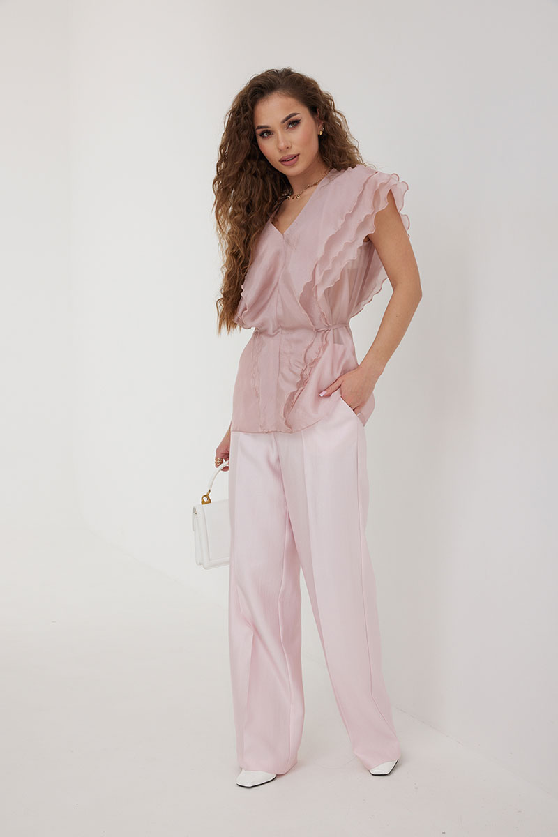 Брюки из костюмно-плательной ткани, прямые со стрелками, полной длины. Средняя посадка, пояс притачной, застежка спереди на молнию и пуговицу. По переду боковые карманы.