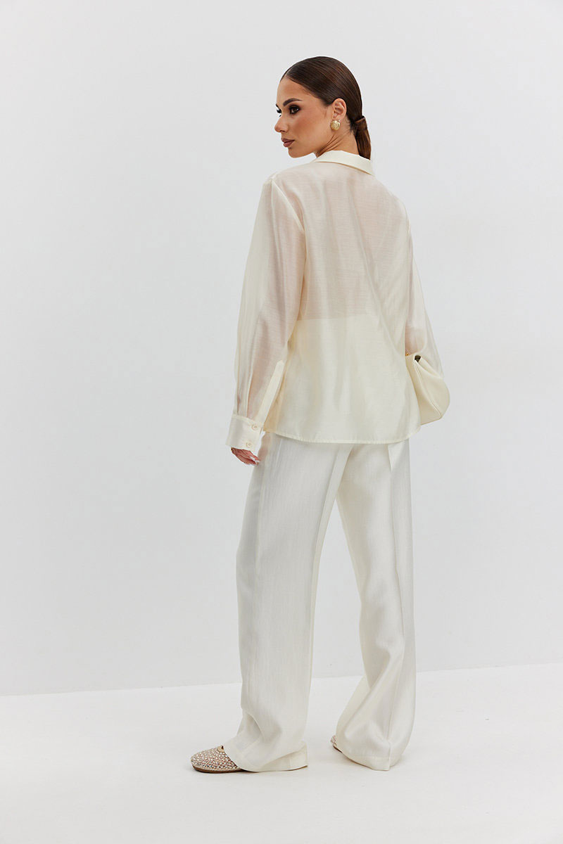 Брюки из костюмно-плательной ткани, прямые со стрелками, полной длины. Средняя посадка, пояс притачной, застежка спереди на молнию и пуговицу. По переду боковые карманы.