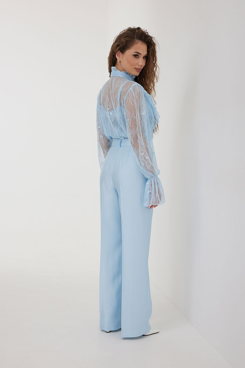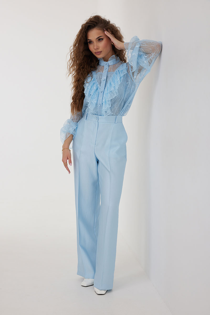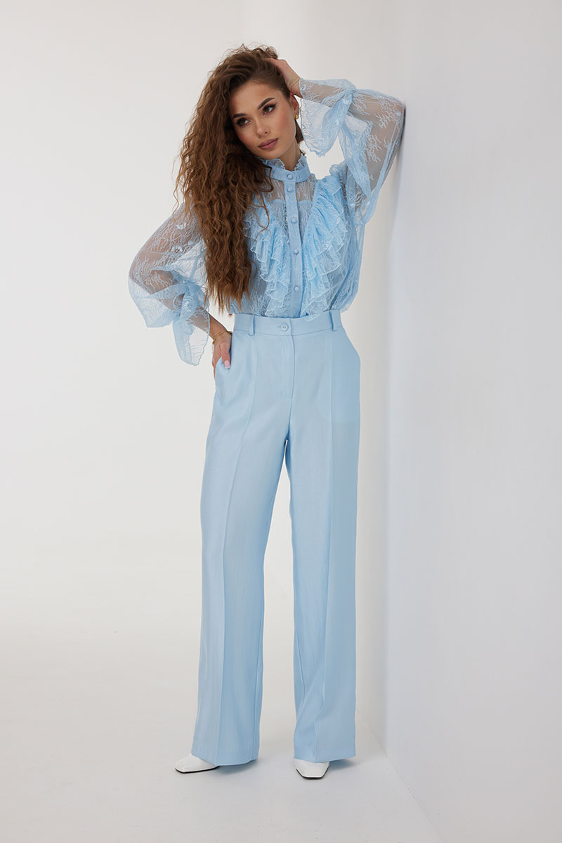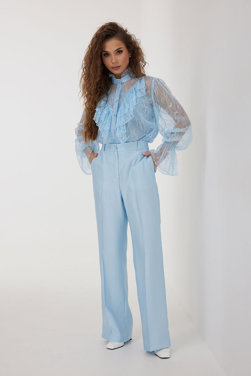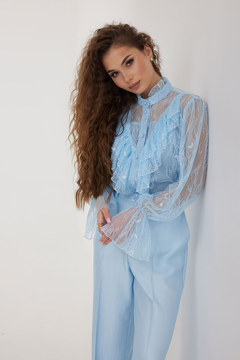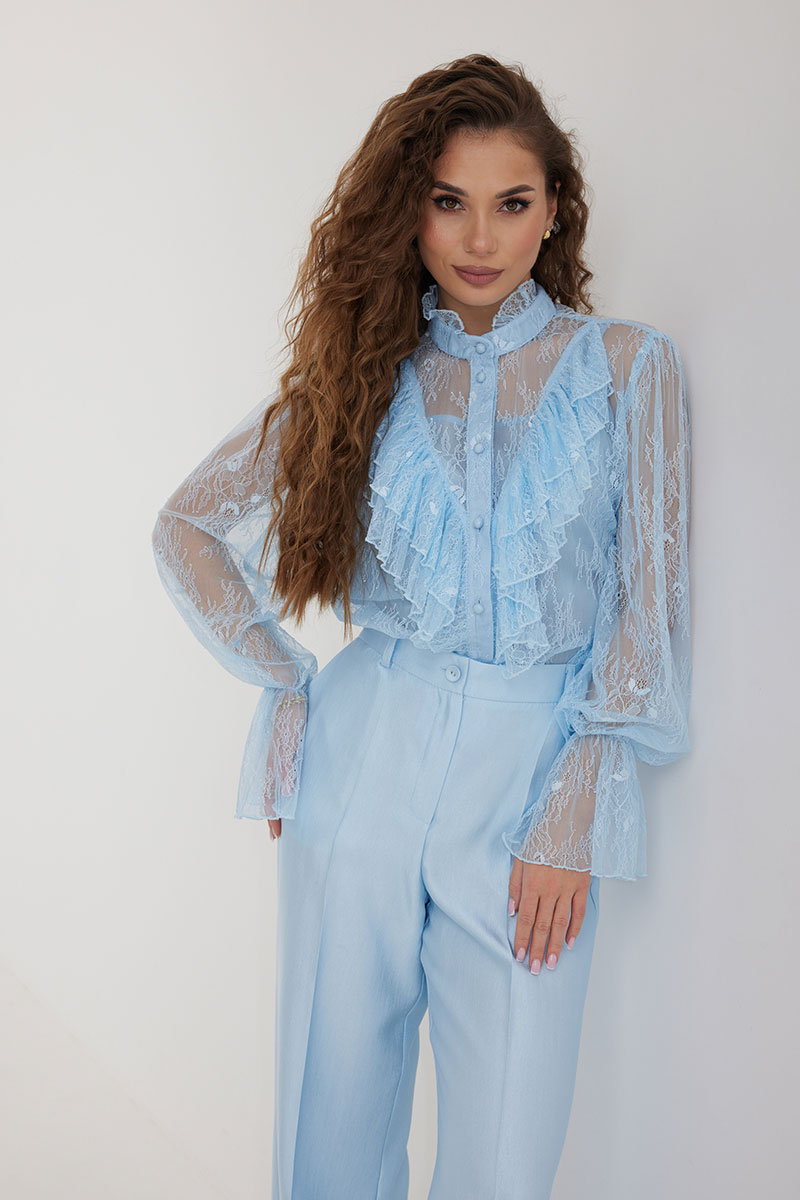 Блузка женская свободного силуэта, из легчайшего кружева. По переду подрез с воланами. Застежка на планку с декоративными пуговицами. Воротник - стойка с небольшой рюшей. Рукав длинный объемный со сборкой в верхней части, в нижней части рукав собран на эластичную тесьму и образует волан. В комплект с блузкой предлагается топ на регулируемых бретелях.