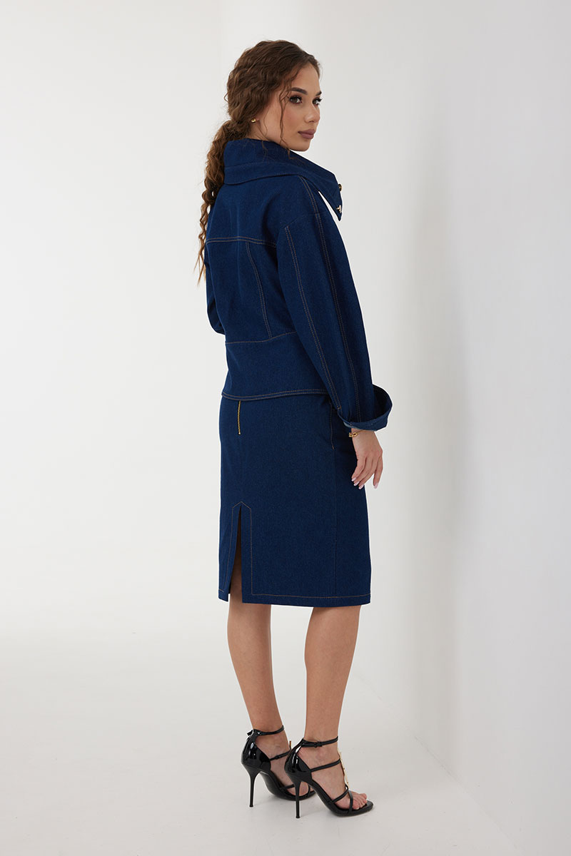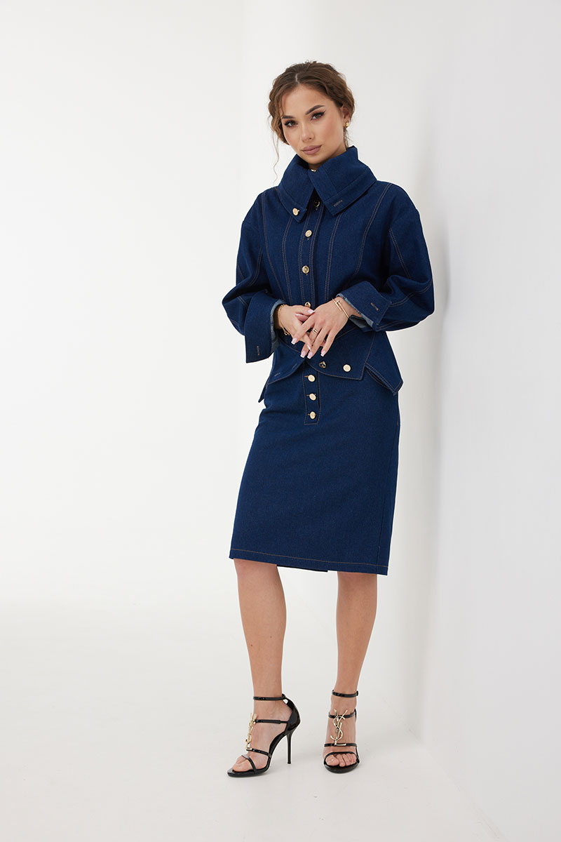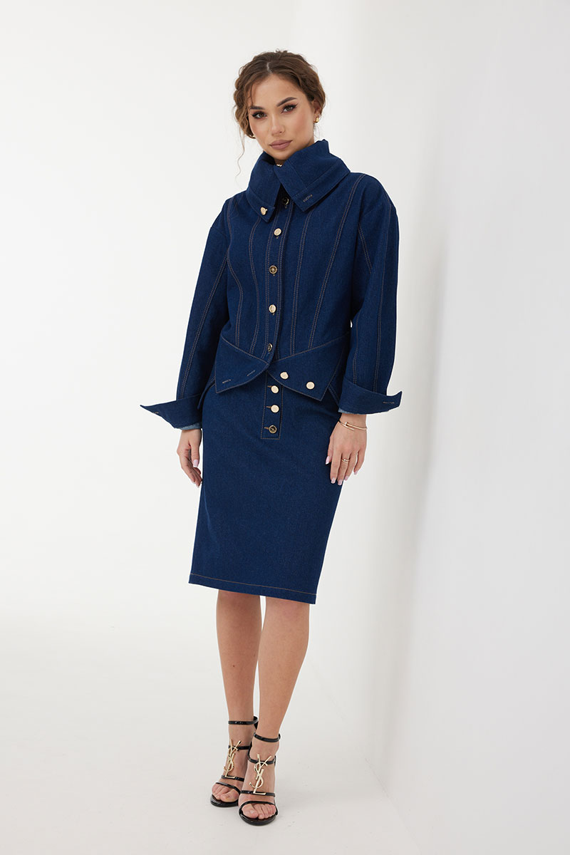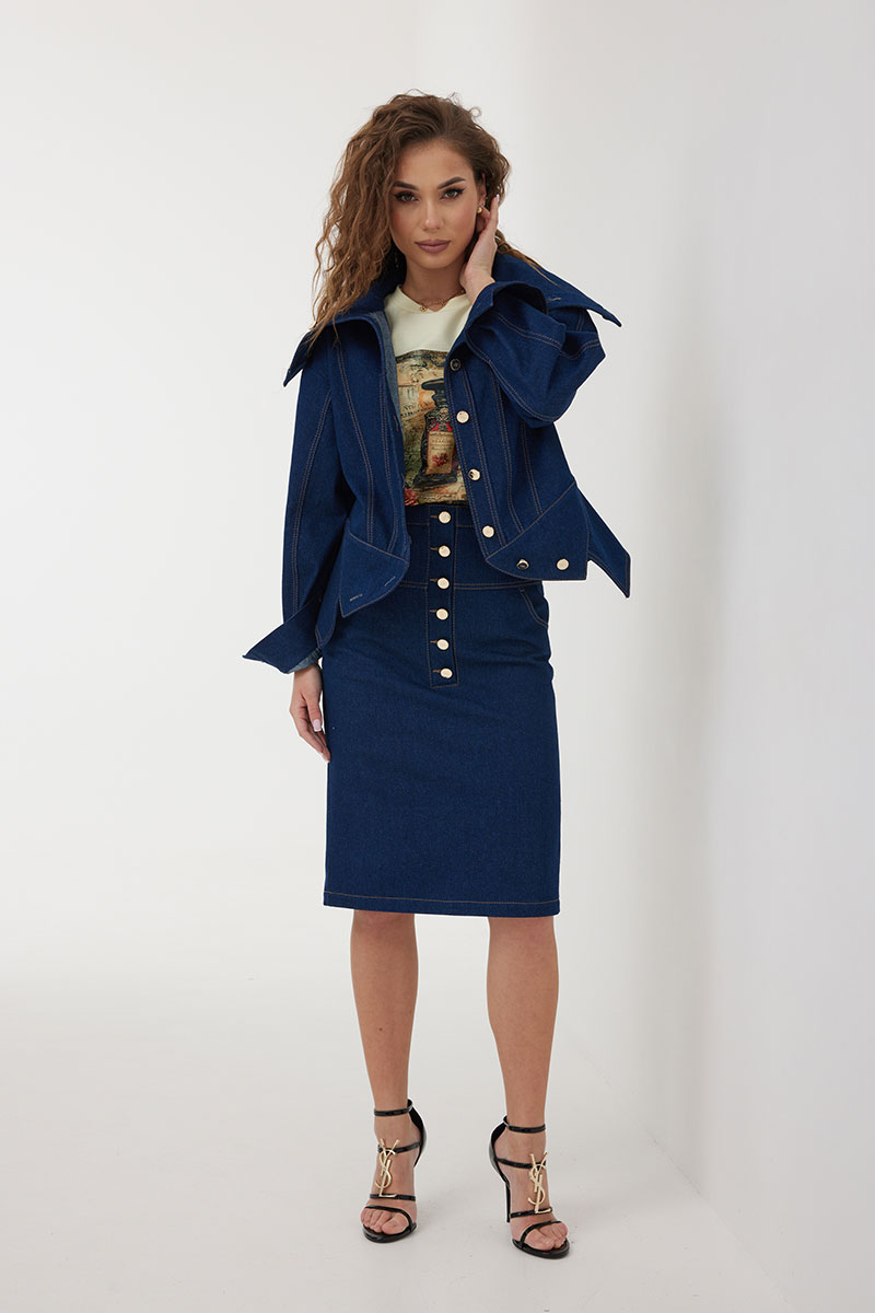Юбка женская из джинсовой ткани, длиной чуть ниже уровня колена, зауженная книзу. Пояс притачной, застежка на декоративную молнию сзади, по переду и спинке широкие кокетки, спереди боковые карманы, а также имитация застежки на планку с джинсовыми пуговицами. По среднему шву спинки разрез. Все швы отстрочены контрастными нитками.