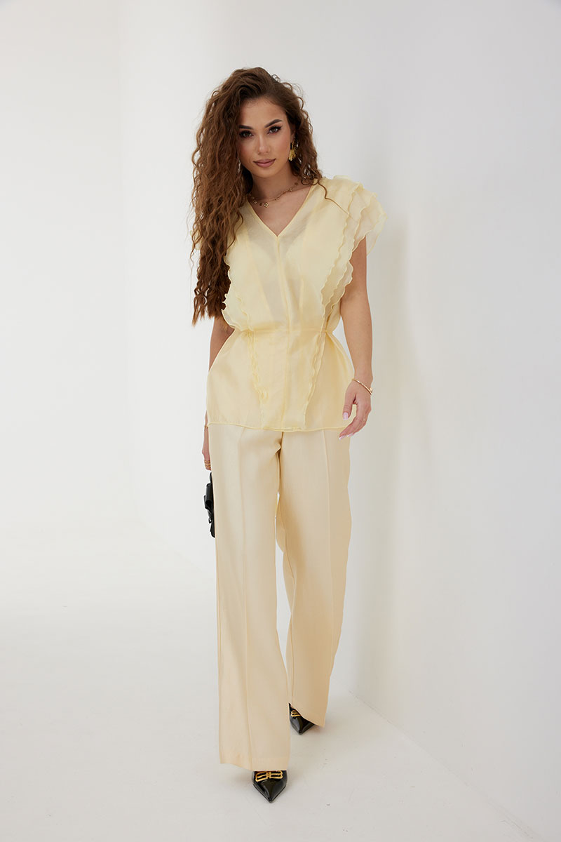 Блузка женская прямого силуэта, длиной до уровня бедер, с воланами, образующими рукава-«крылышки», по переду воланы до низа, по спинке входят в рельефы на уровне талии. Вырез горловины V-образной формы. Спереди под верхний волан вставлен пояс-шнурок, завязывающийся вокруг талии.