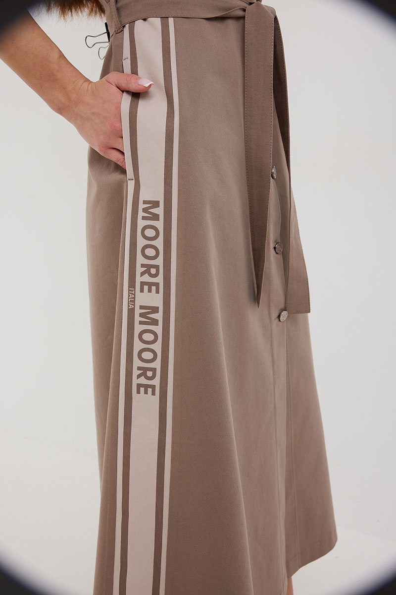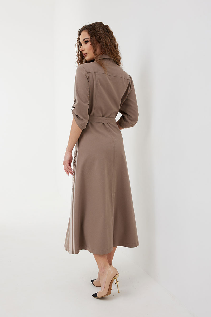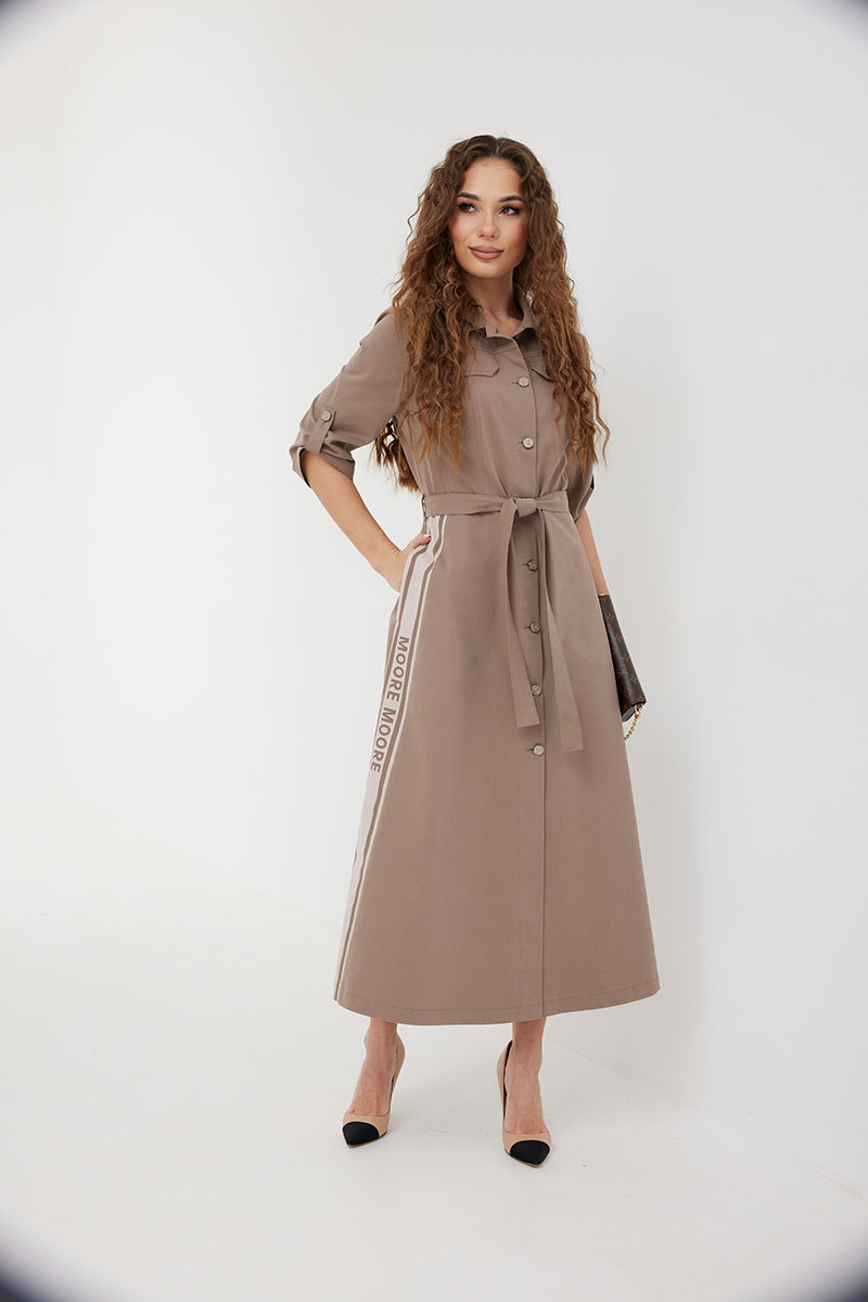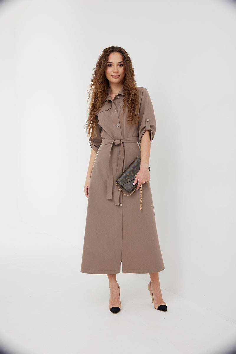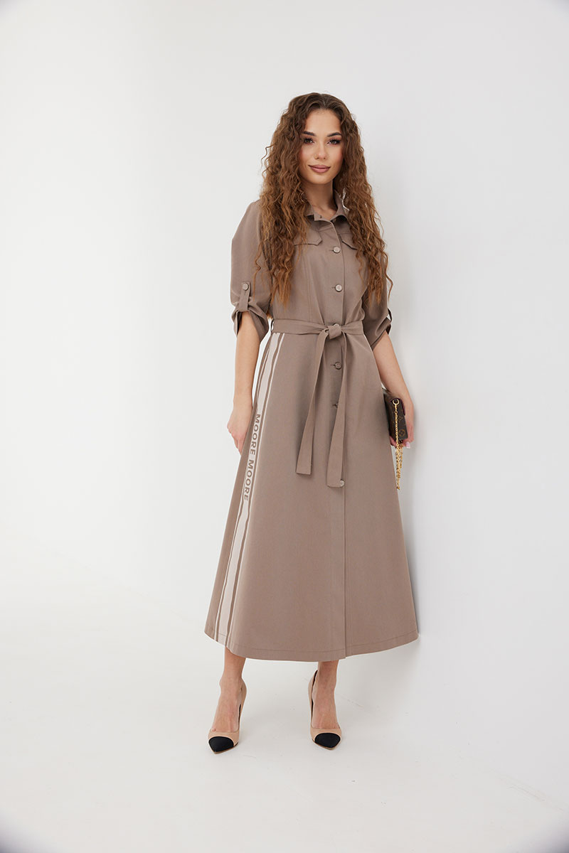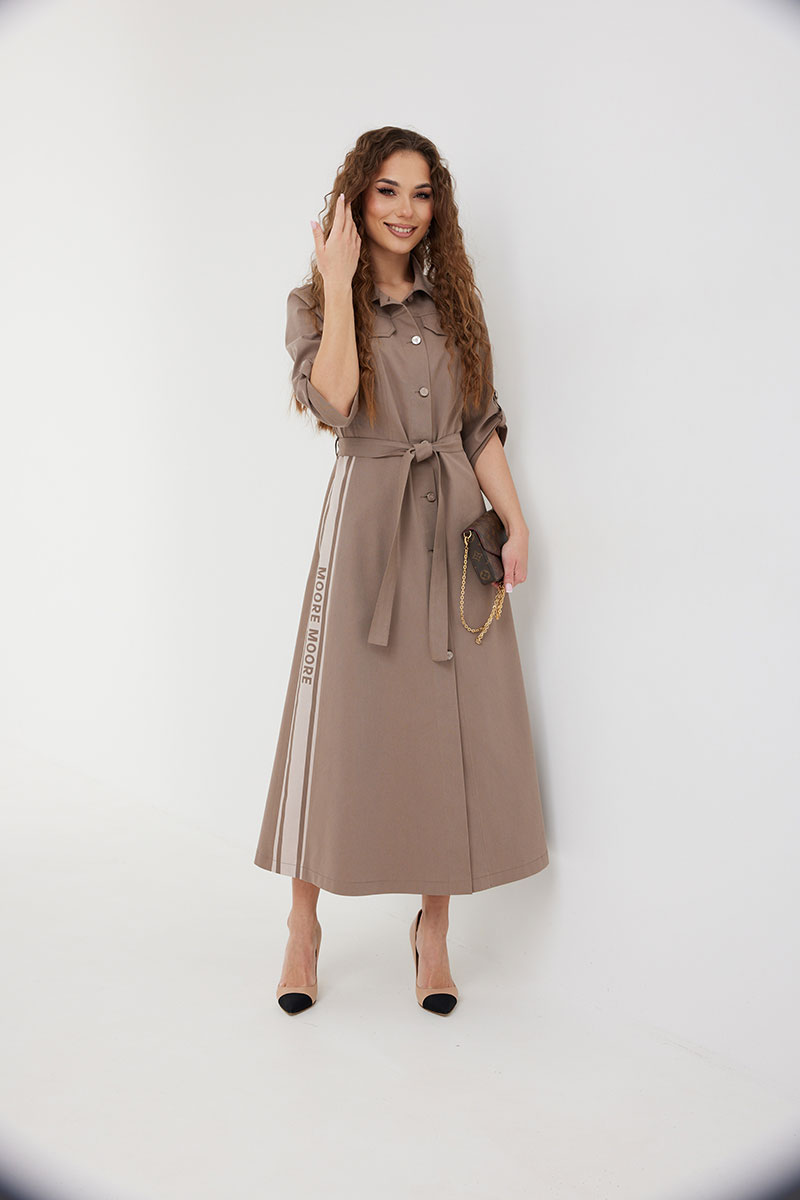 Платье из ткани джинс. Длина миди. Застежка по переду на петли и пуговицы. Отрезная линия талии. На переде накладные карманы с клапаном. Рукав ¾ прямой, длина регулируется патой. Воротник рубашечный. В боковых швах юбки карманы. На боковых частях юбки нанесена печать. В комплекте завязывающийся пояс.