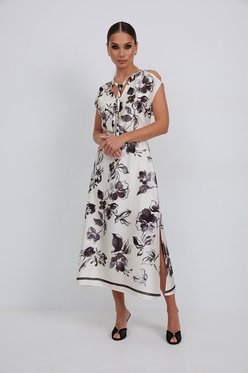 Платье полуприлегающего силуэта чуть расширенное к низу из плательно-блузочной ткани. По линии плеча выполнены разрезы. Горловина со стойкой, переходящей в завязки. По низу боковых швов разрезы. Застежка-молния в среднем шве спинки. Платье на подкладке.