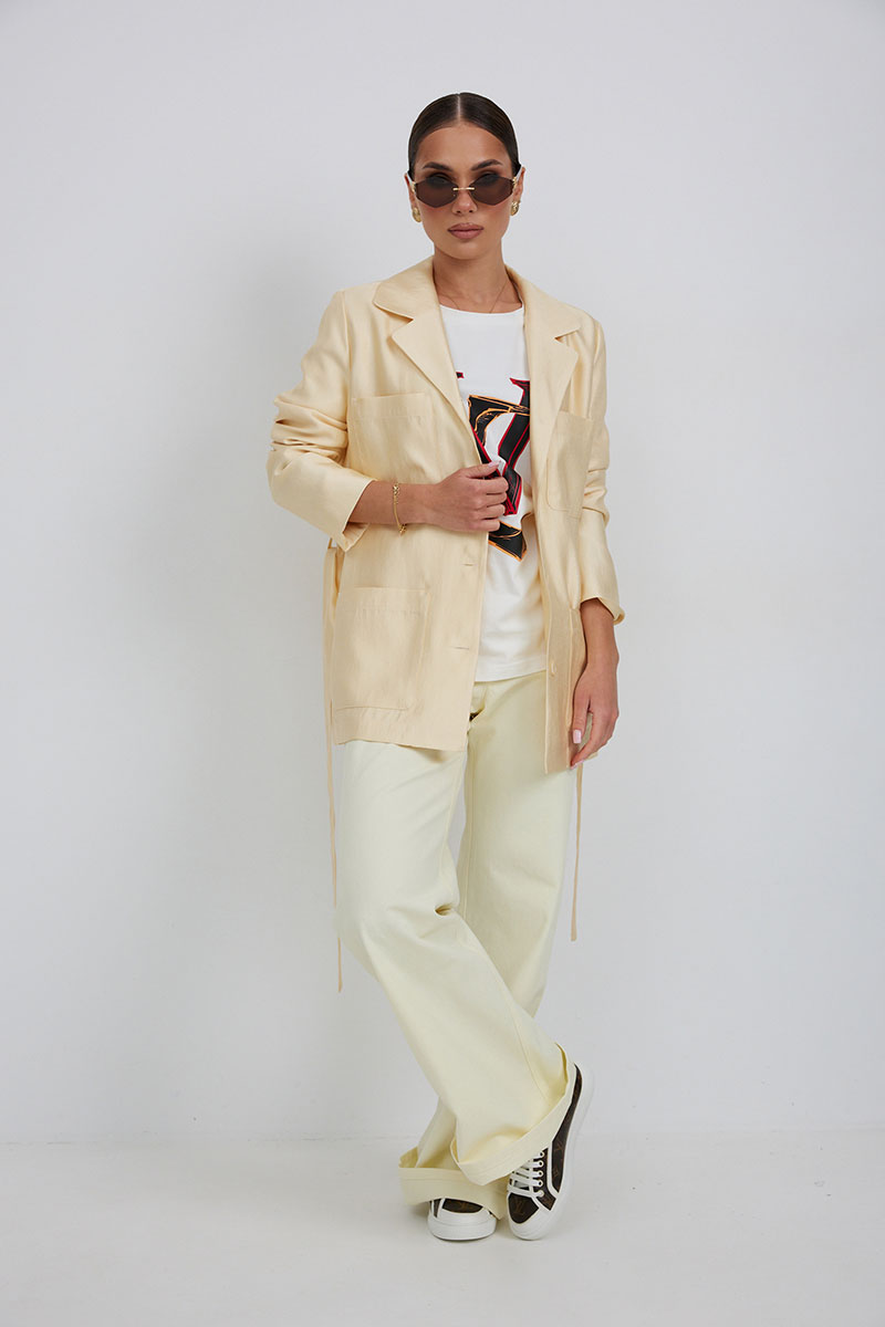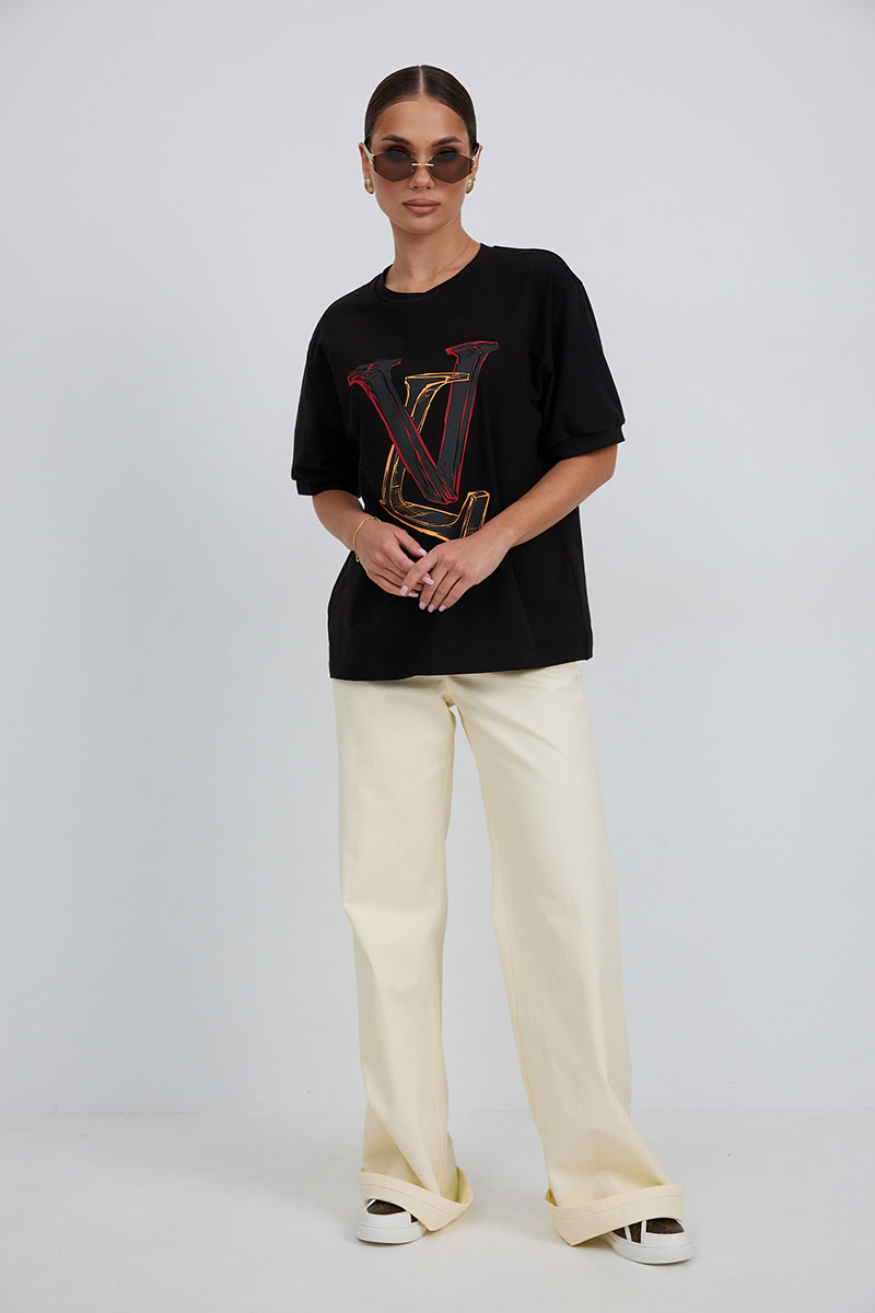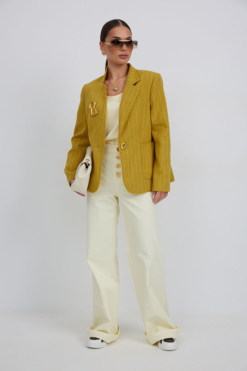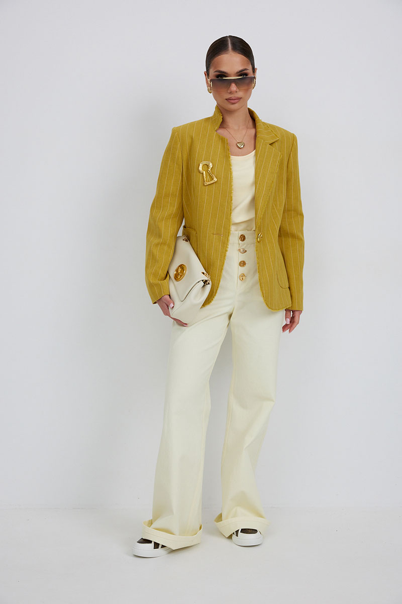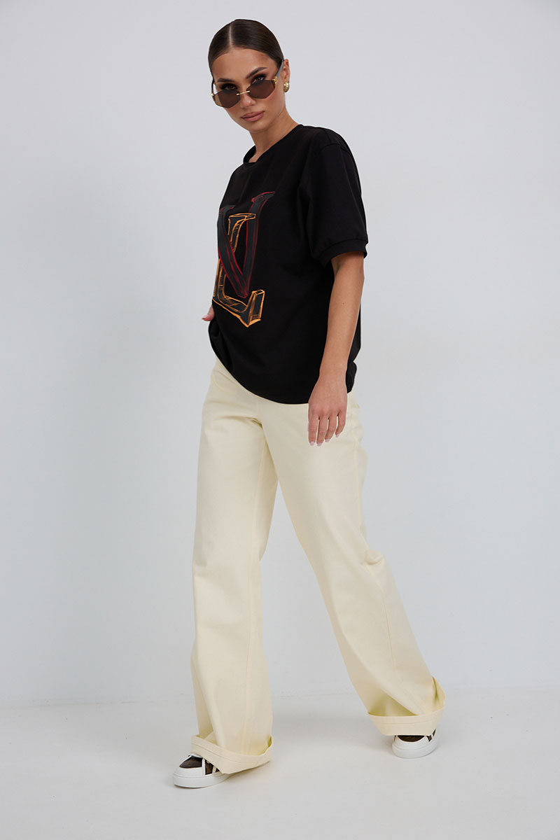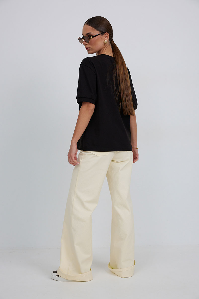 Джинсы с высокой посадкой прямого силуэта. Застежка на петли и декоративные пуговицы. По переду карманы, сзади накладные карманы. По швам контрастная отделочная строчка.