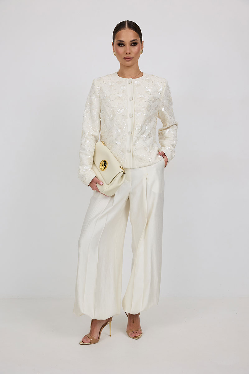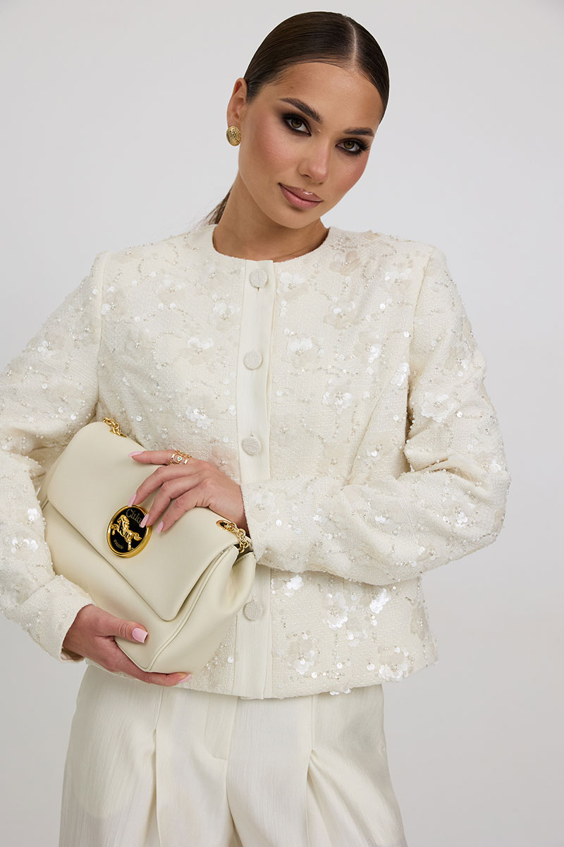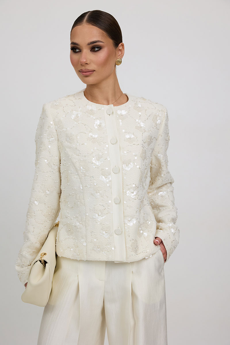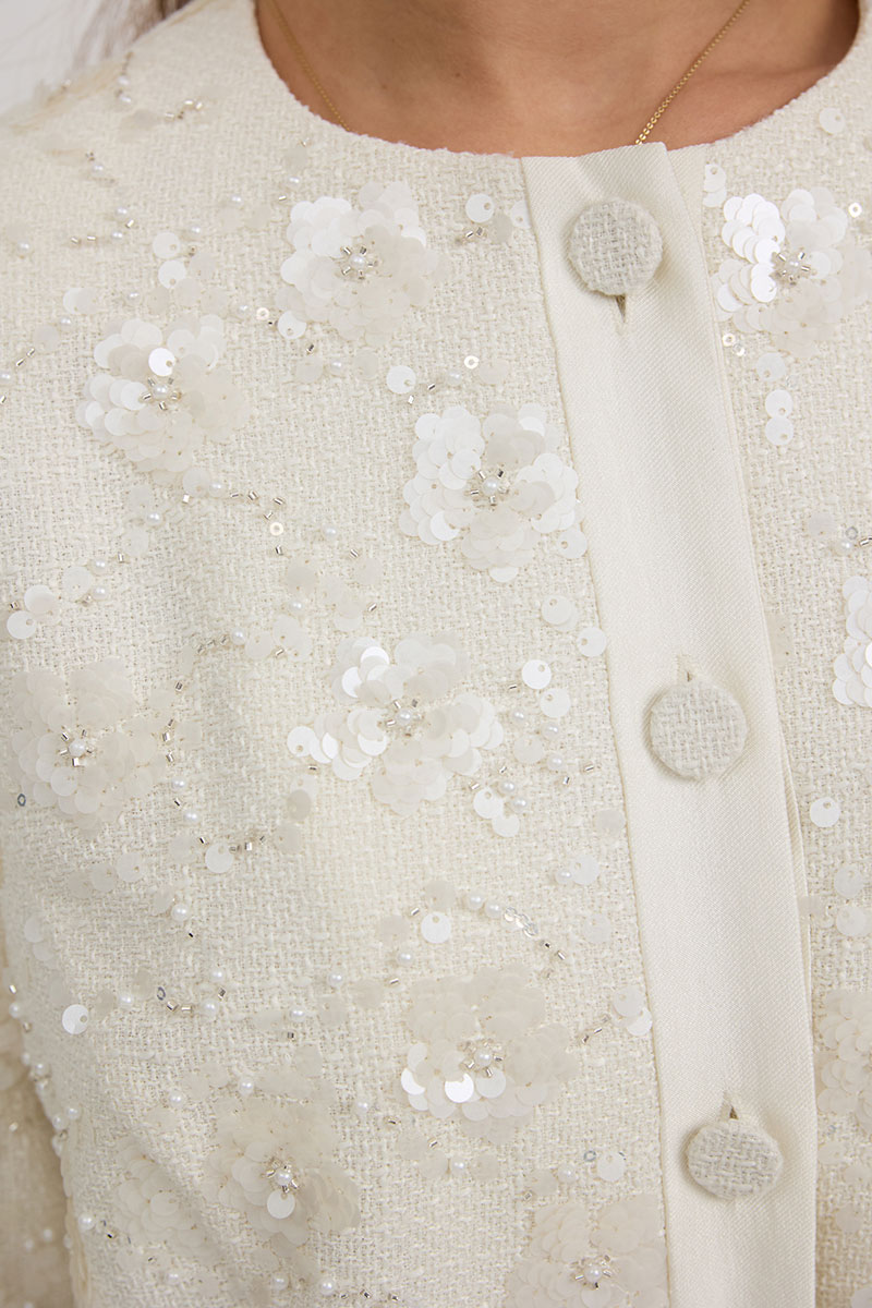 Жакет из твидовой ткани с вышивкой, полуприлегающего силуэта, с центральной застежкой на планку с петлями и пуговицами. Перед с отрезным бочком. Спинка с отрезным бочком, средним швом. Горловина округлой формы. Рукав втачной. Жакет на подкладке с плечевыми накладками.