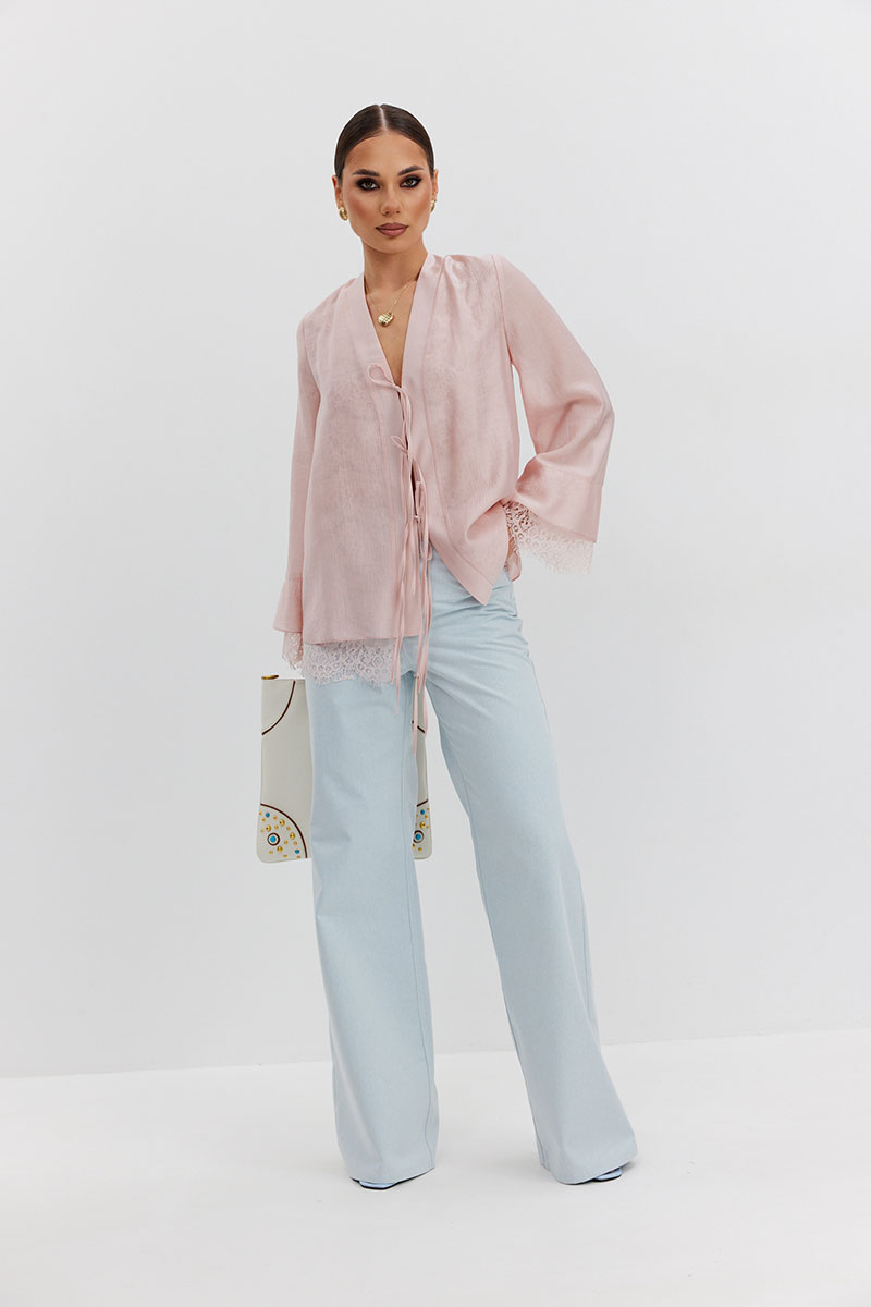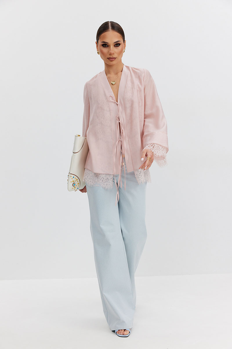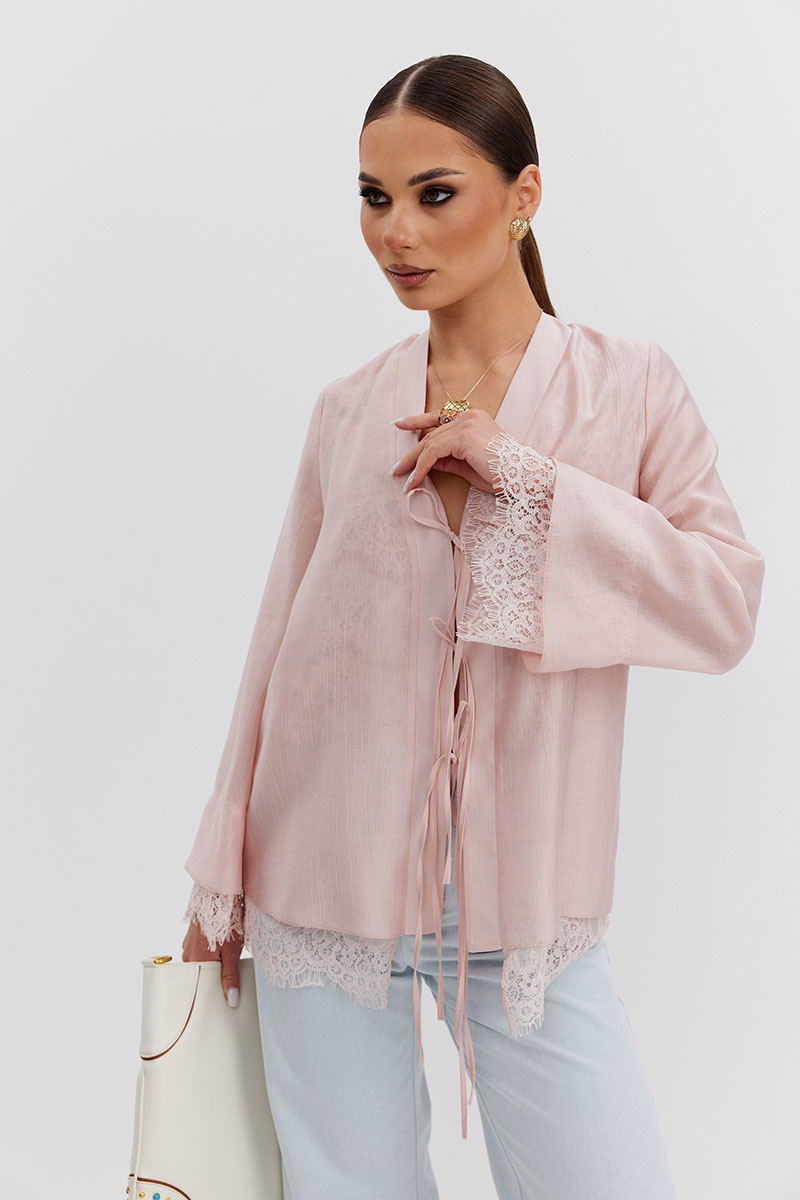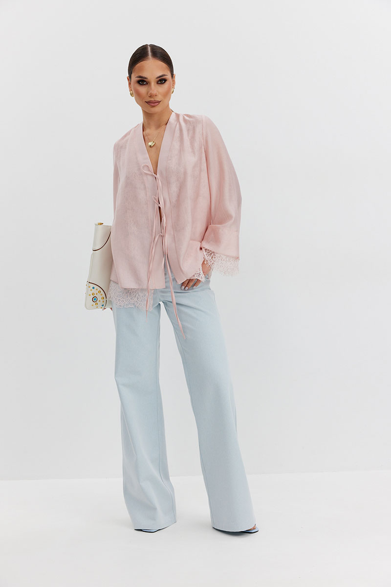 Блузка женская свободного силуэта, из полупрозрачной вуали. Спинка и перед на кружевной подкладке. Застежка на планку с тремя завязками. Рукав втачной длинный расширенный книзу, по низу рукава кружевная широкая манжета, имитирующая многослойность.