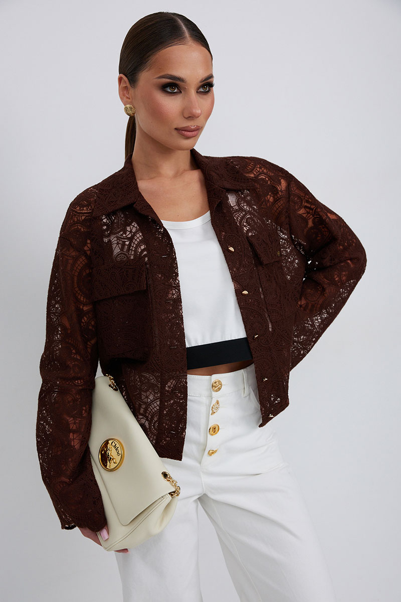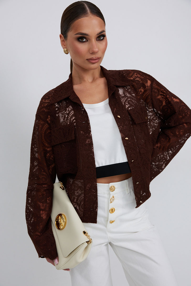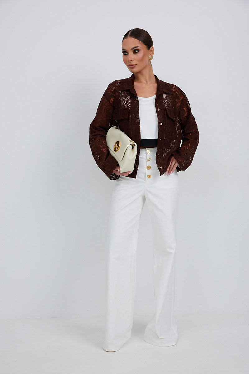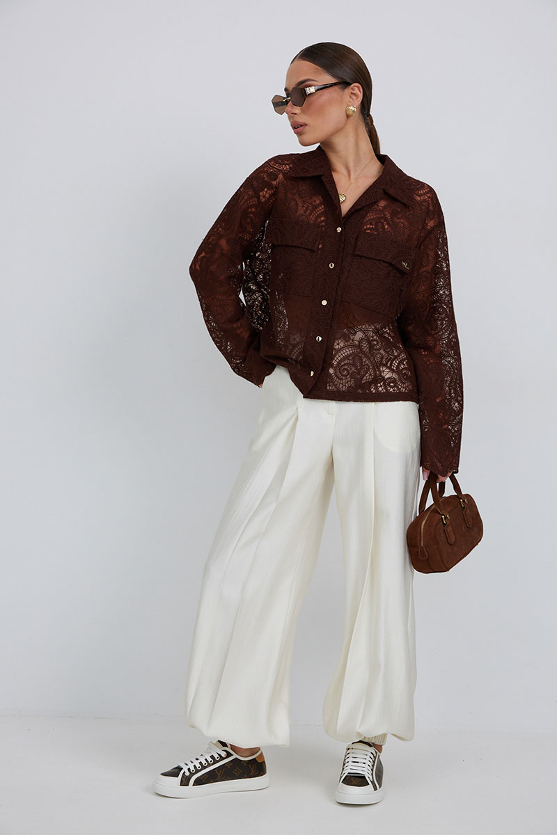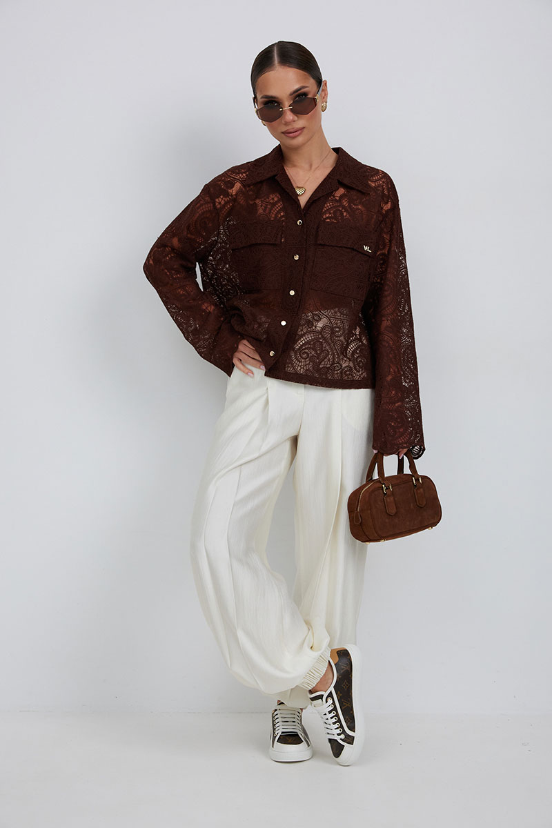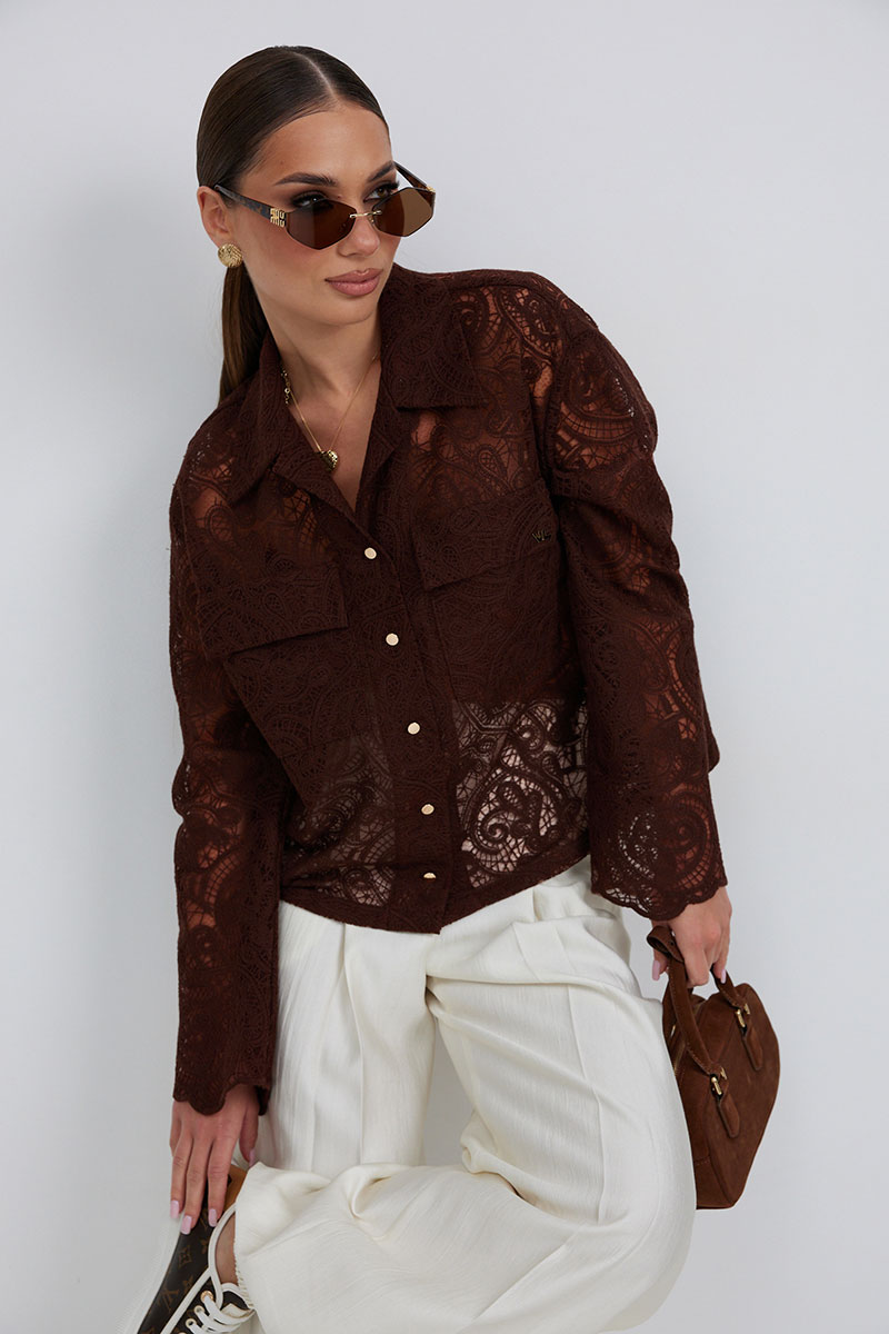 Блузка из кружевной ткани свободного силуэта. По переду центральная застежка на петли и пуговицы, сверху накладные карманы с клапанами. Втачной рукав слегка расширен к низу. Воротник рубашечный.