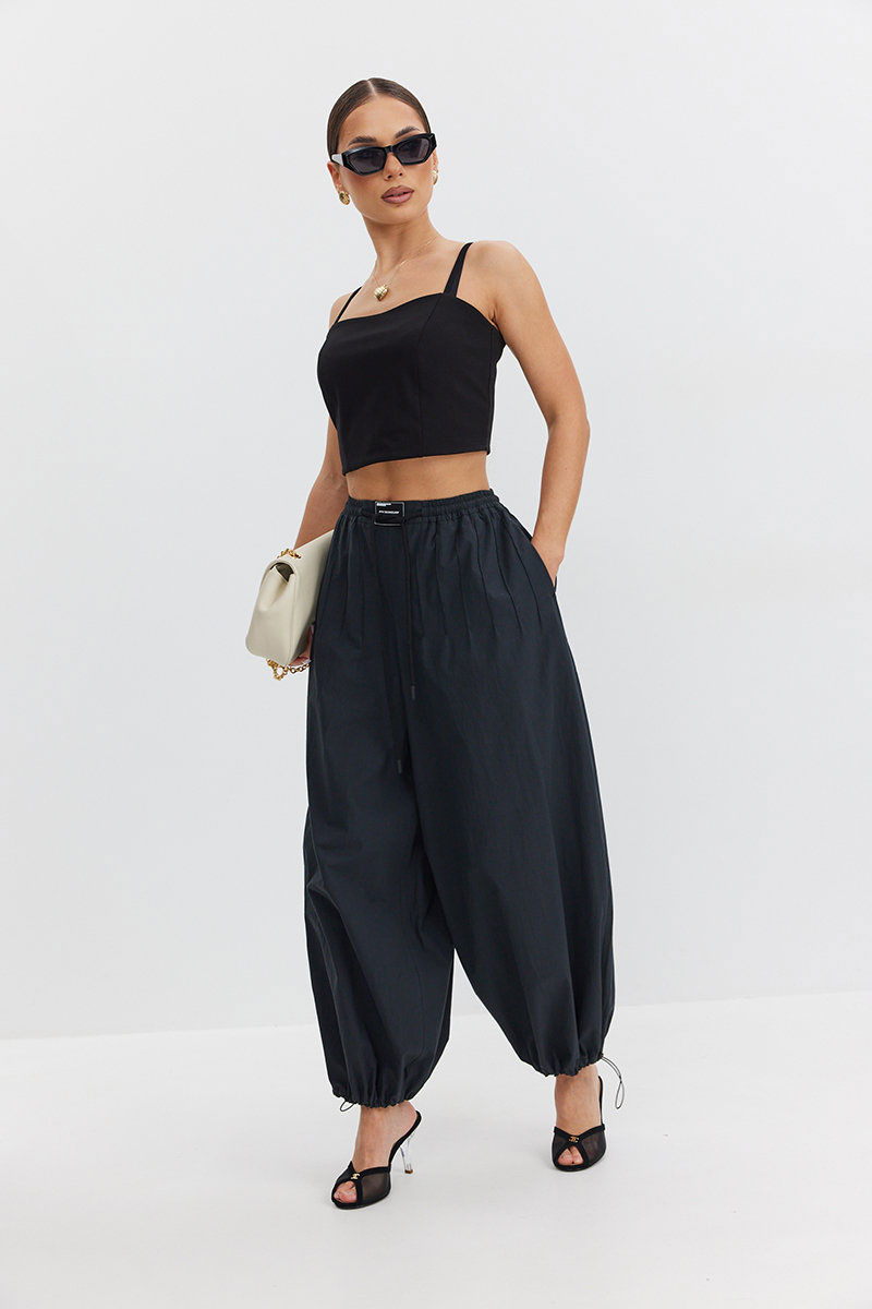 Брюки женские объемные из ткани с «креш»-эффектом актуального кроя - «алладины», по низу кулиса с резинкой и фиксатором, высокая посадка, брюки на резинке, пояс притачной со шнуром, боковые карманы в швах, по переду декоративные элементы в виде защипов, застроченных до уровня бедер.