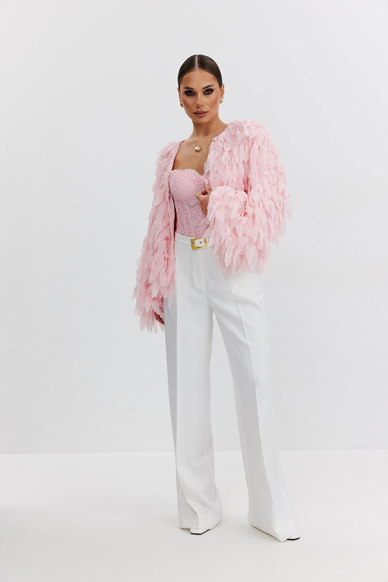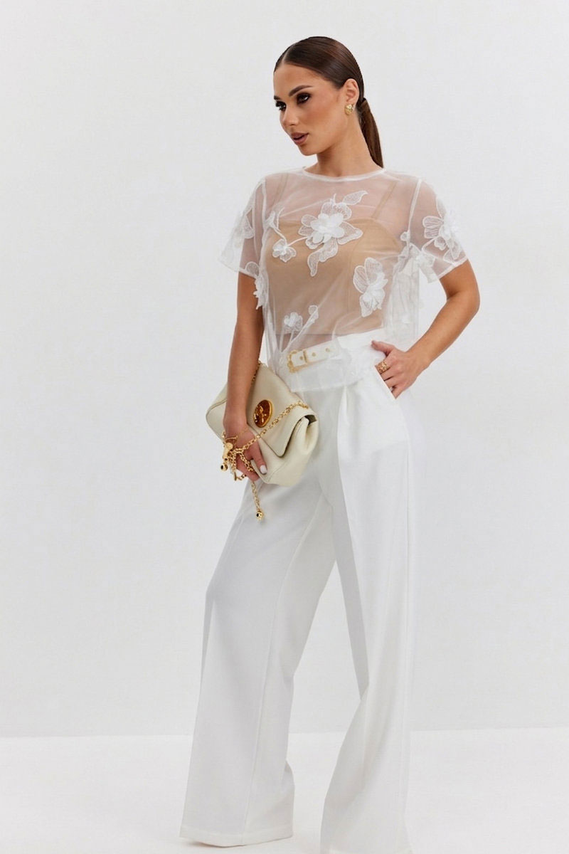 Брюки прямые из костюмной ткани. Верх на поясе со шлевками. Ширинка на молнии и удлиненный пояс со скрытой застежкой на пуговицу и крючок. Складки спереди, диагональные боковые карманы и задние прорезные листочки.