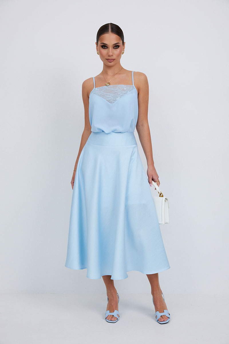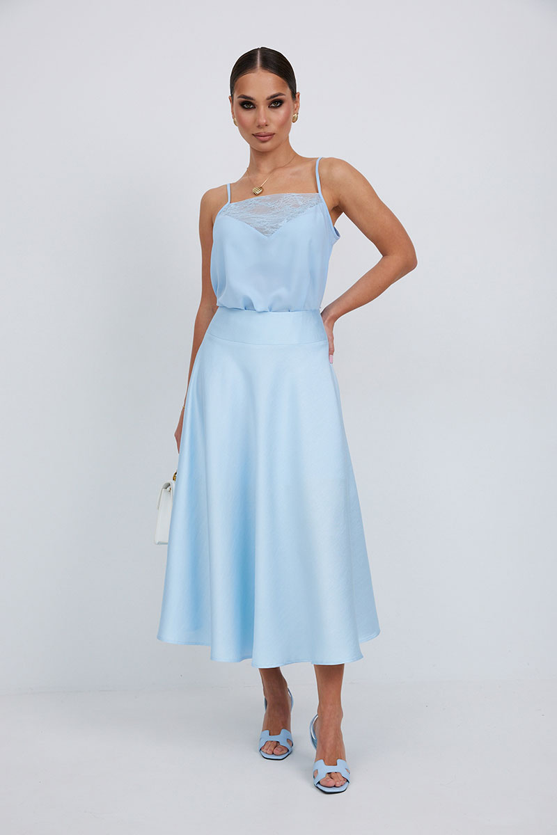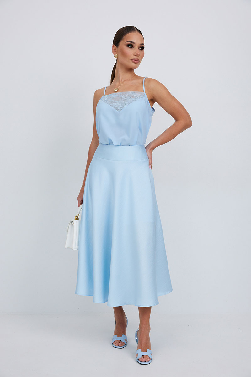 Блузка-топ свободного силуэта на регулируемых бретелях. По верху переда вставка из кружева.