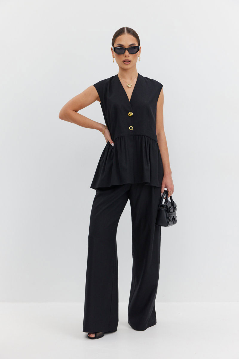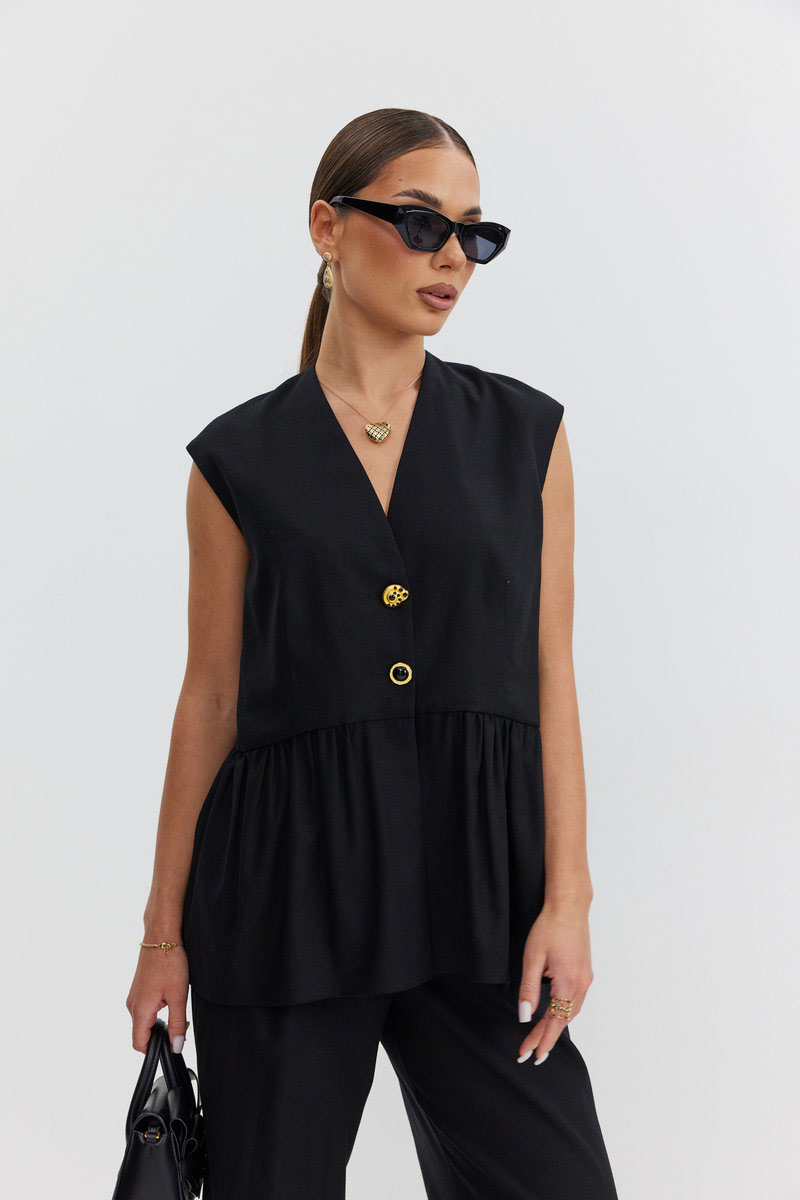 Жилет женский из льняной ткани полуприлегающего силуэта, на хлопковой подкладке, со слегка спущенной линией плеча, вырез горловины глубокий V-образный, жилет с подрезом по талии, нижняя часть жилета без подкладки, сосборена по шву притачивания. Спинка со средним швом и рельефами, по переду нагрудные вытачки. Застежка центральная на две декоративные пуговицы.